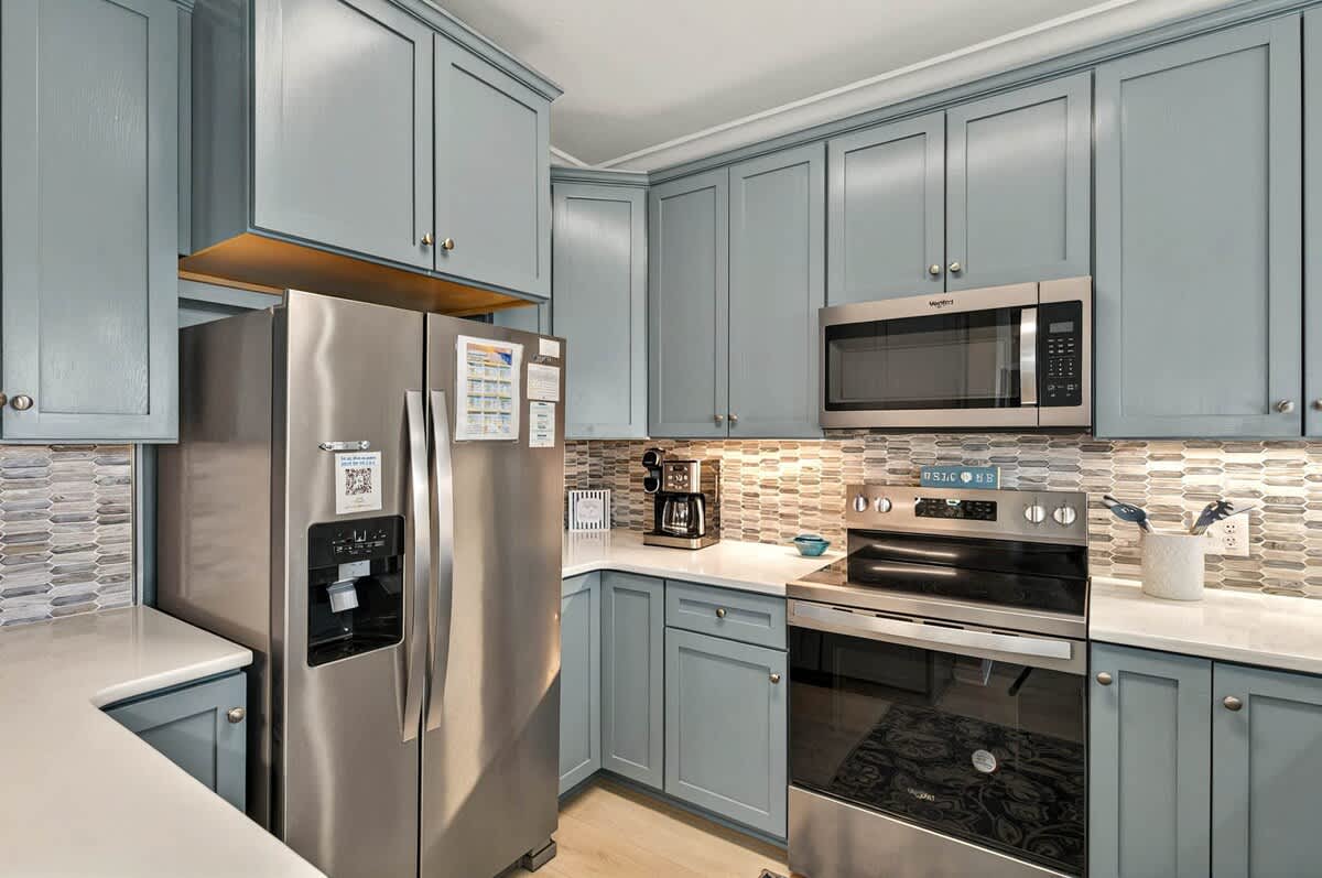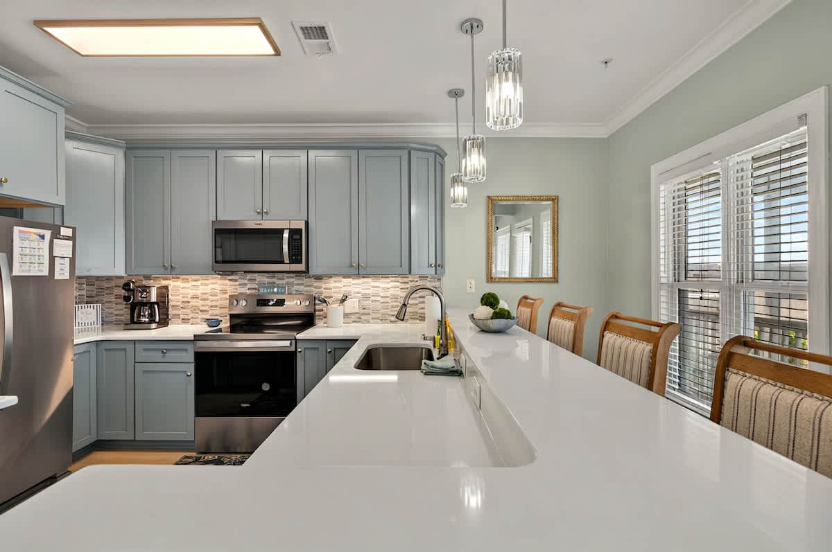 The condo sleeps 8. All four bedrooms have King sized beds. Kitchen amenities include a Keurig and drip coffee maker, crock pot, toaster, blender, and toaster oven. Also located in the condo are 5 televisions, all with cable, as well as DVD/VCR's. Free Wifi is available. You will find a common elevator just outside the condo, making the trip up to the top floor a breeze!