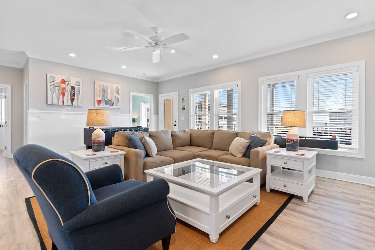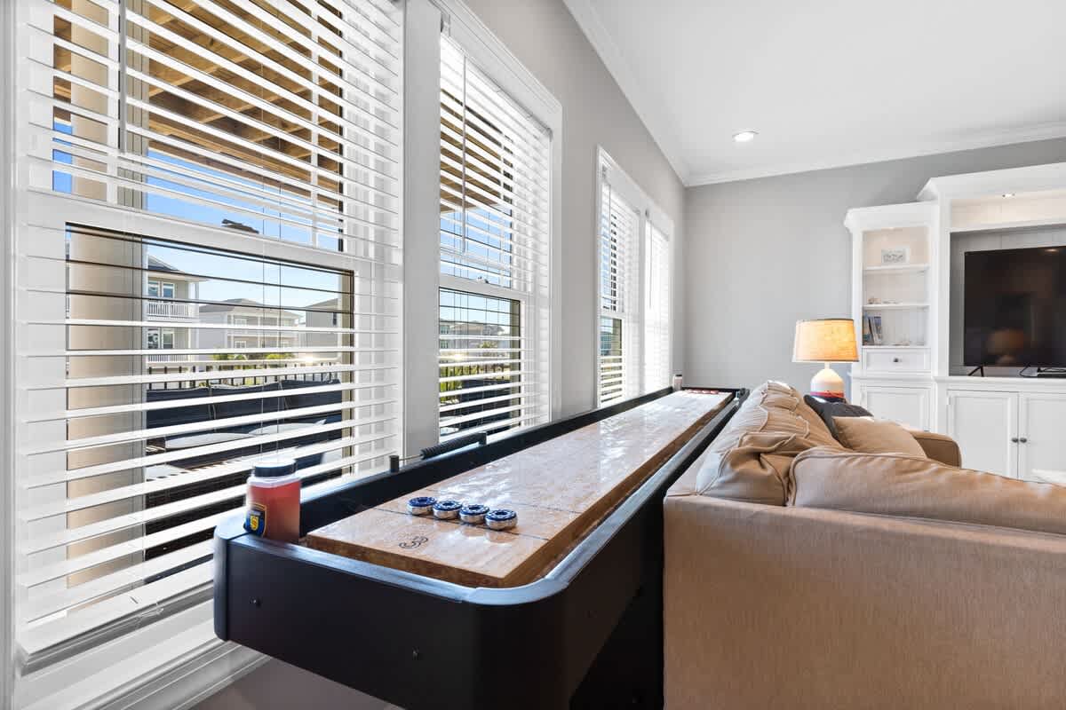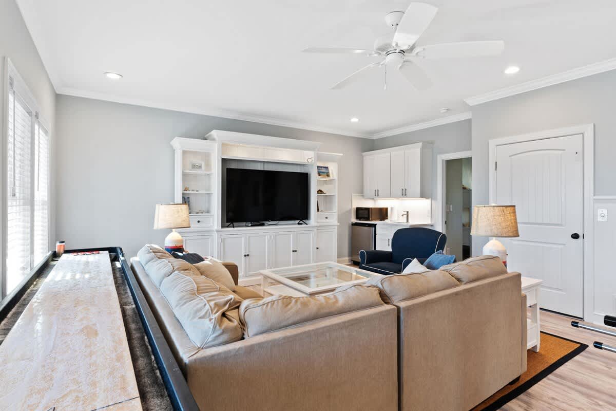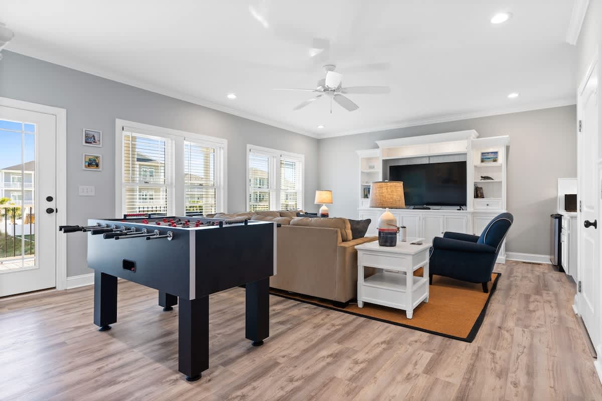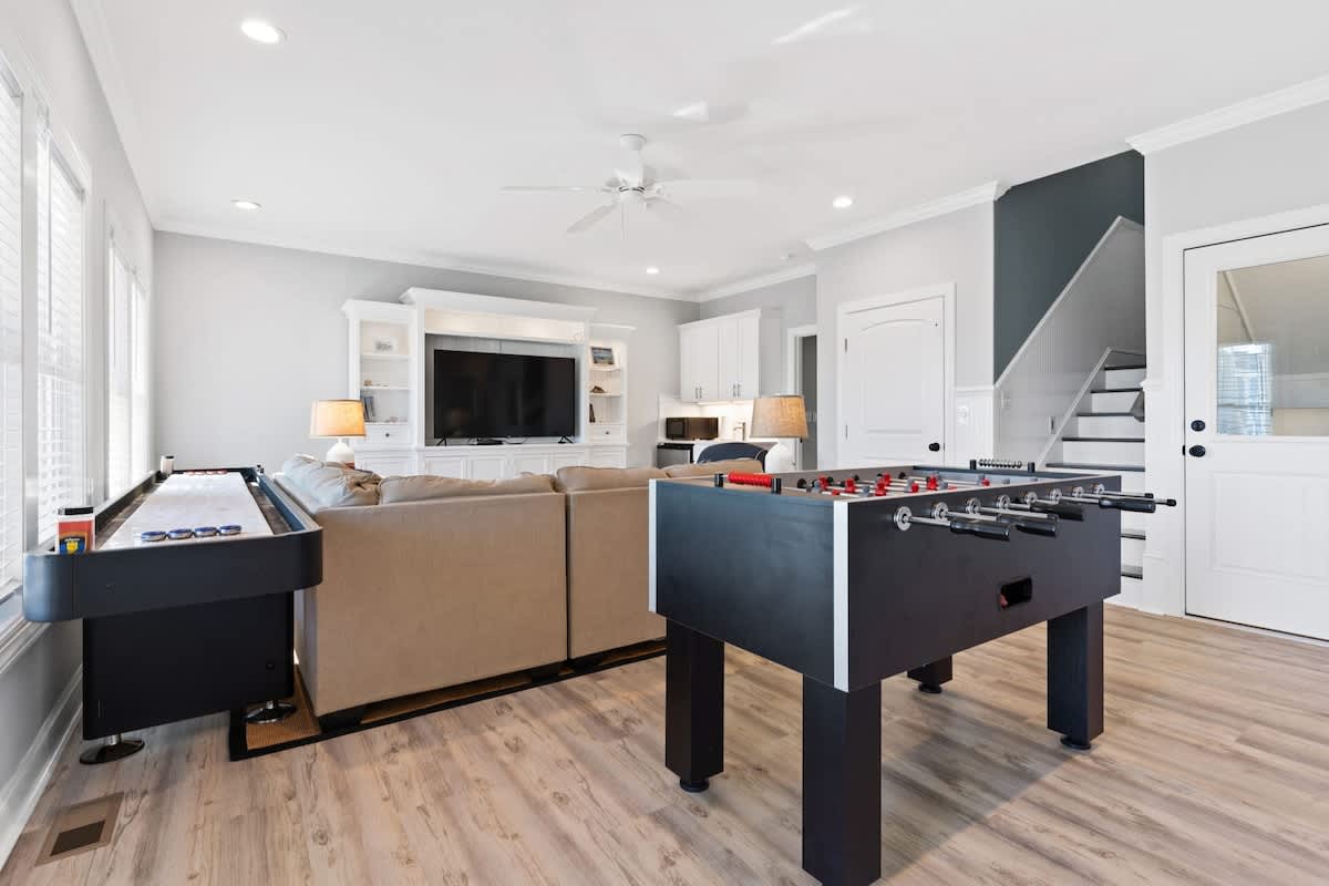 - The main floor living room is a hub of entertainment, with a foosball table, shuffleboard, a mini fridge, microwave, wet bar, smart TV, and a comfortable sectional sofa that seats five.