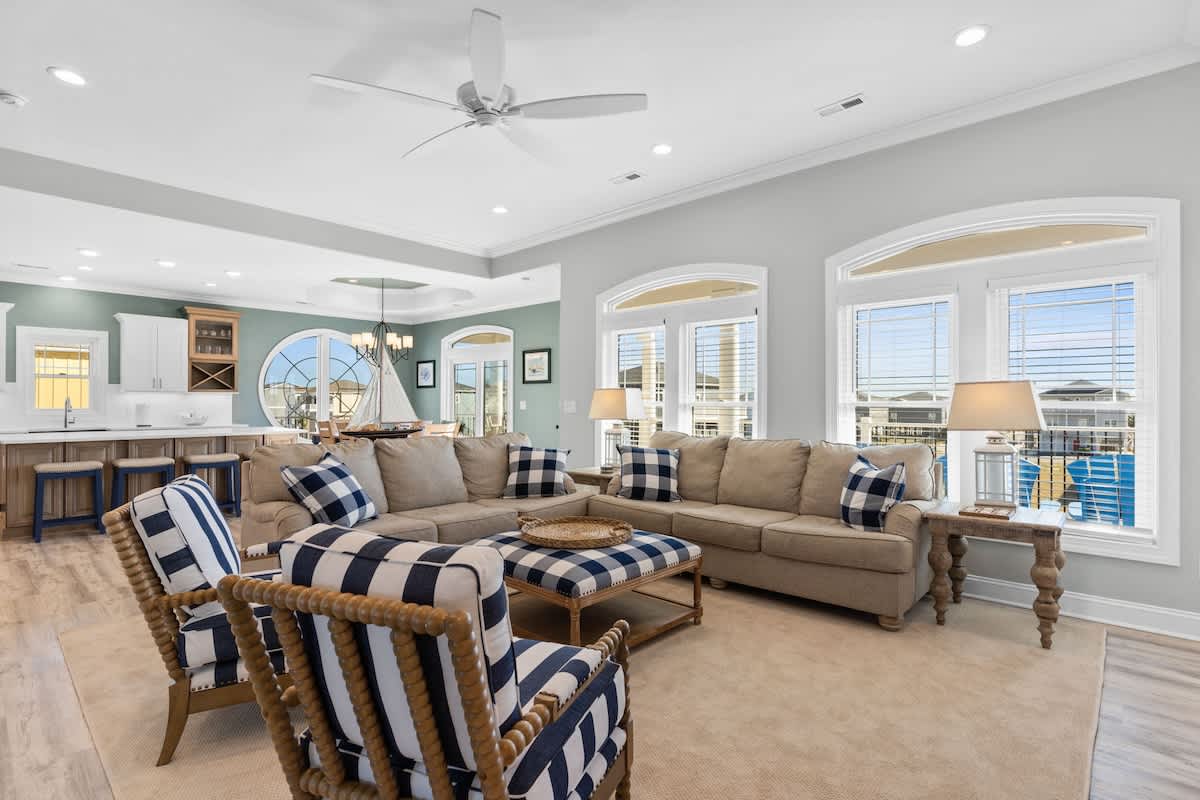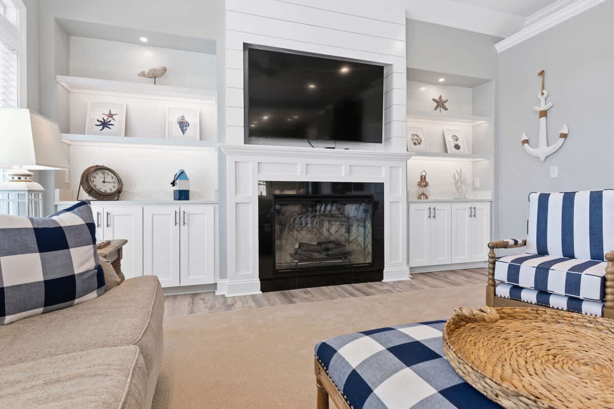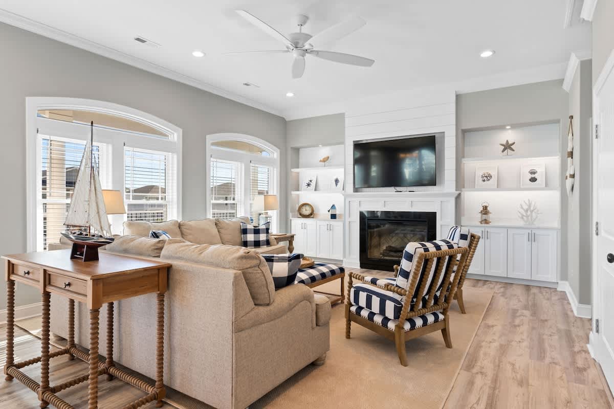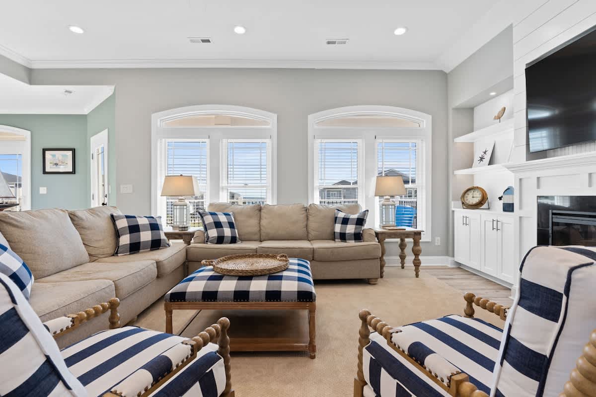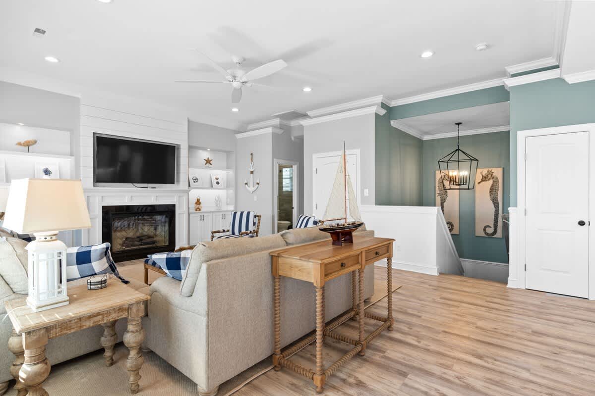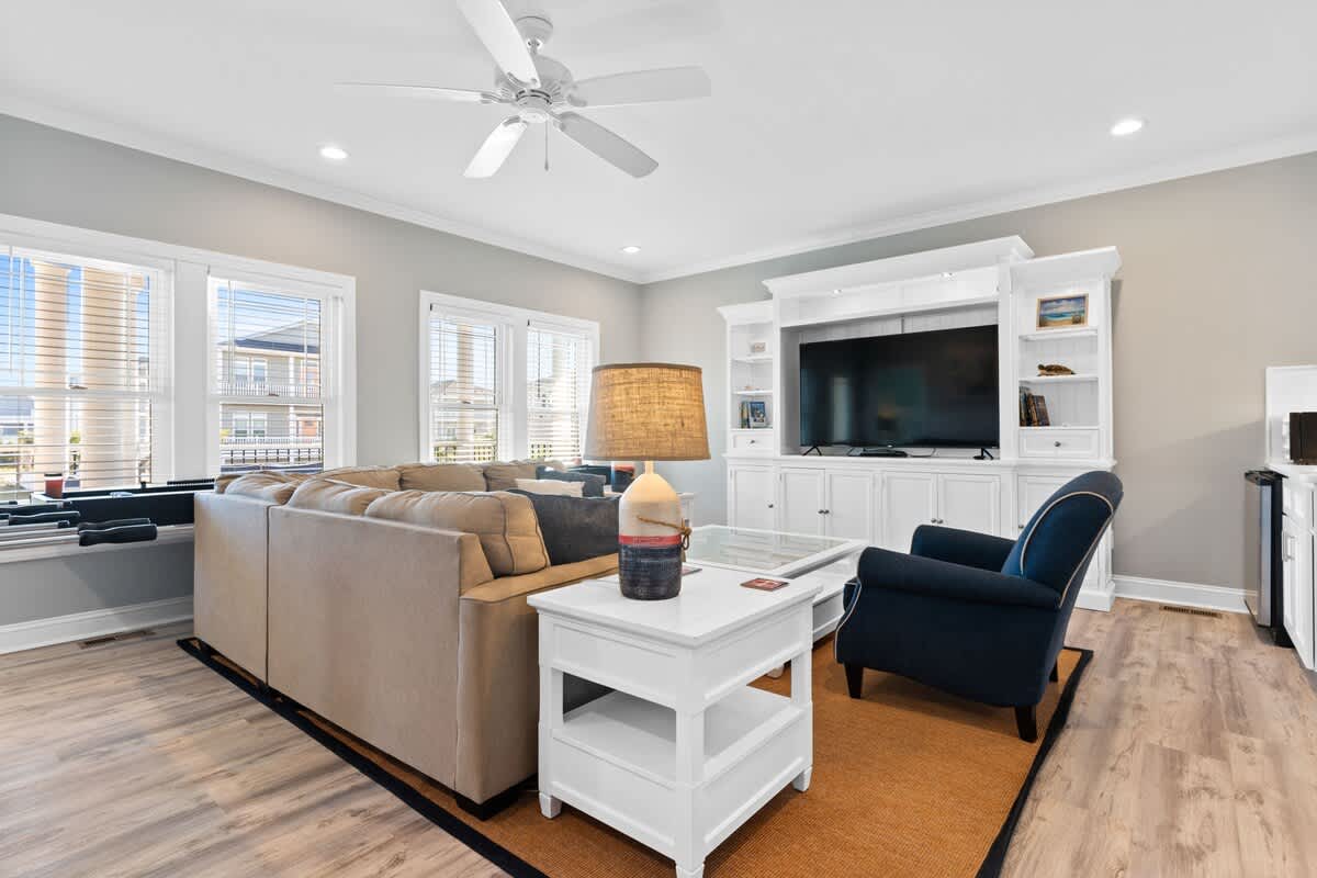- The main floor living room is a hub of entertainment, with a foosball table, shuffleboard, a mini fridge, microwave, wet bar, smart TV, and a comfortable sectional sofa that seats five.