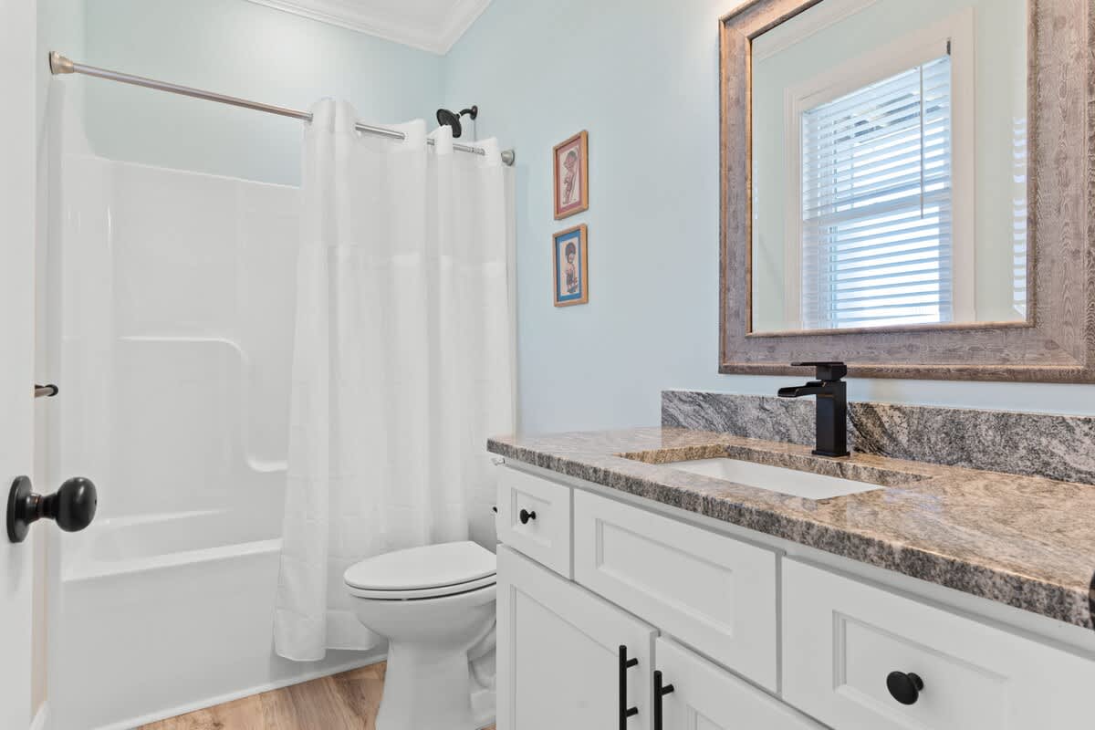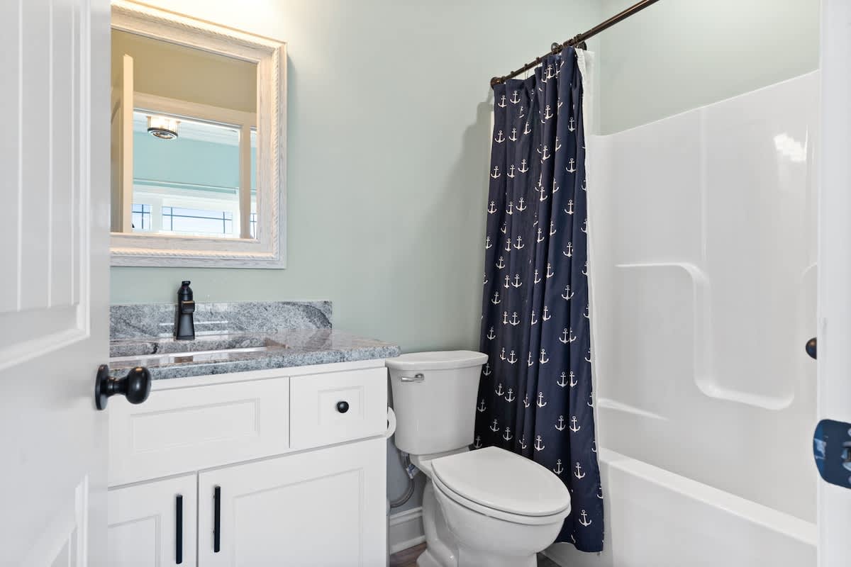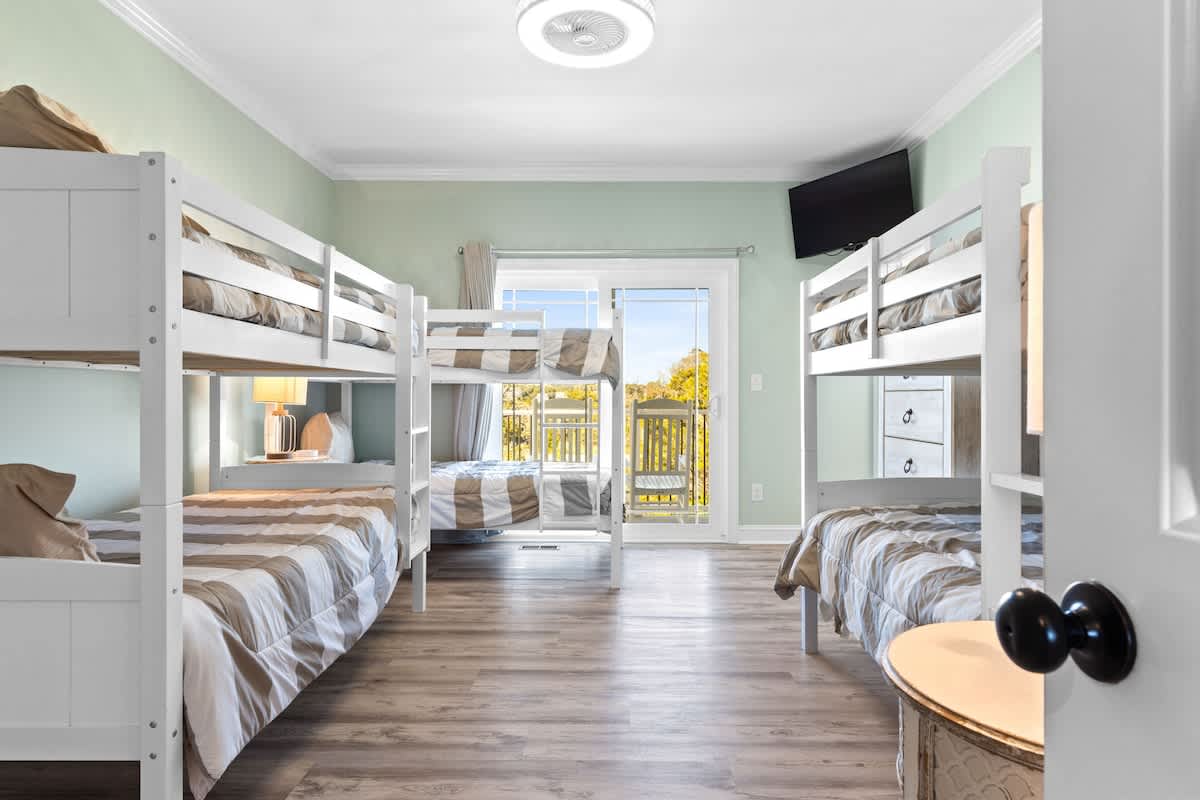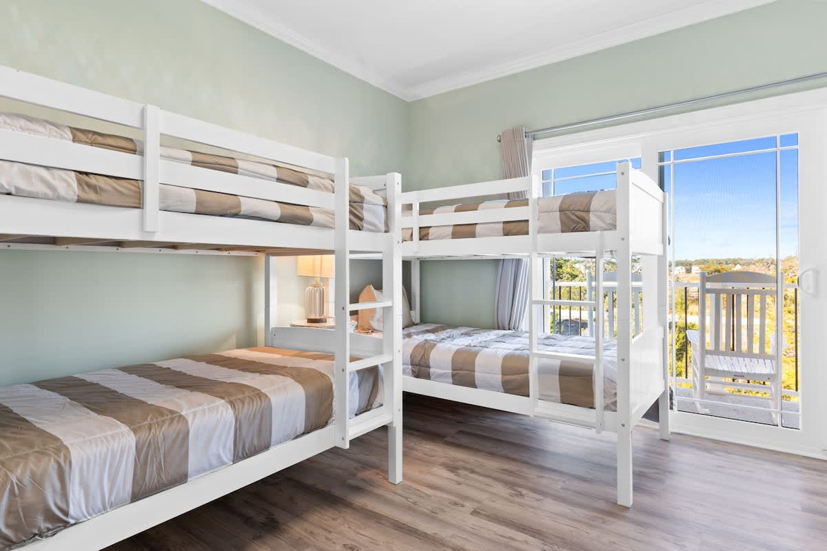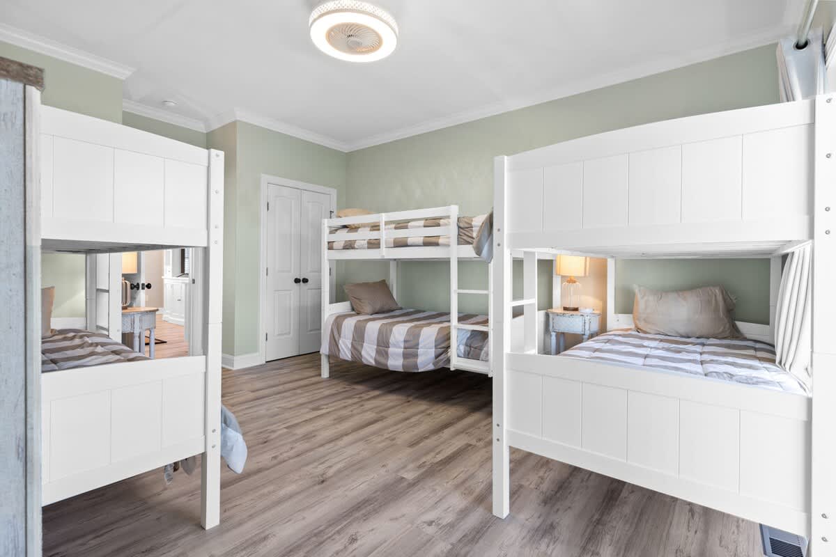 - The first bedroom is a paradise for the little ones, featuring three sets of twin-over-twin bunk beds and an attached bathroom with a tub-shower combo.