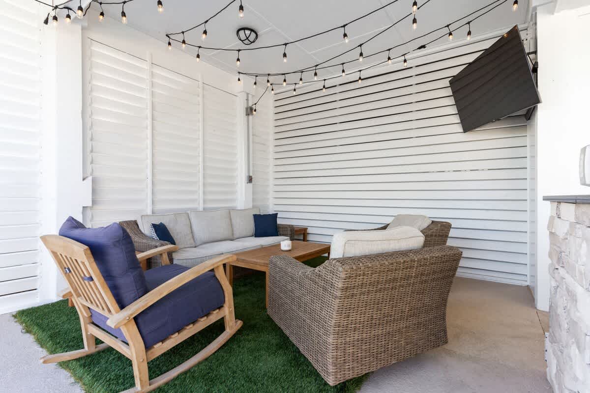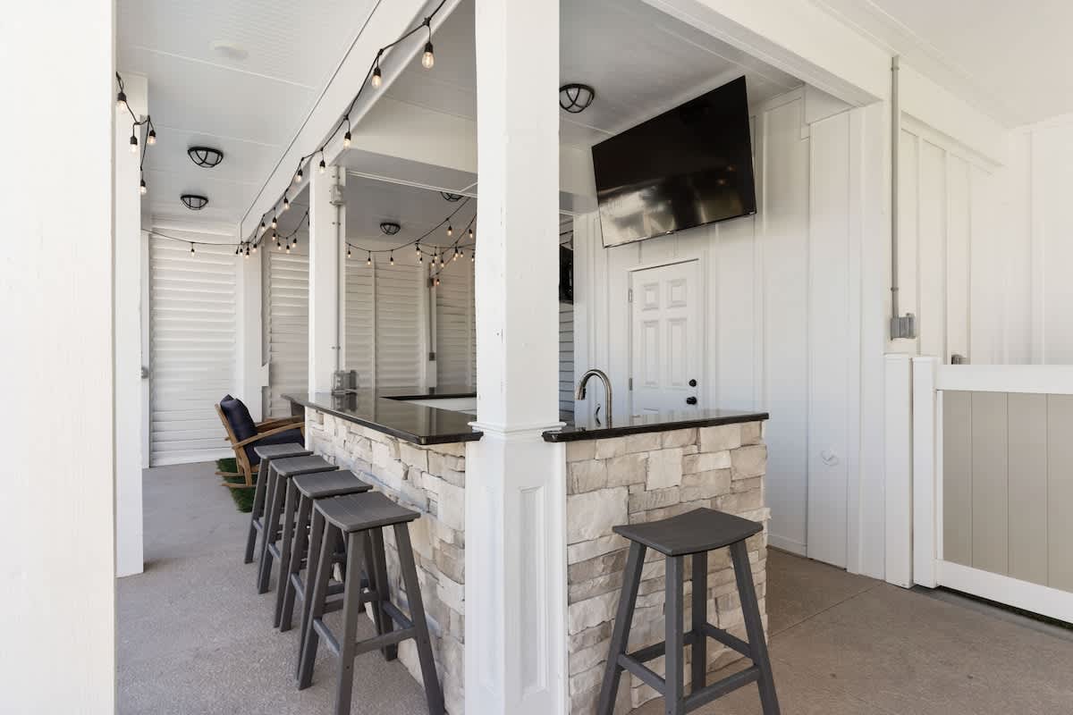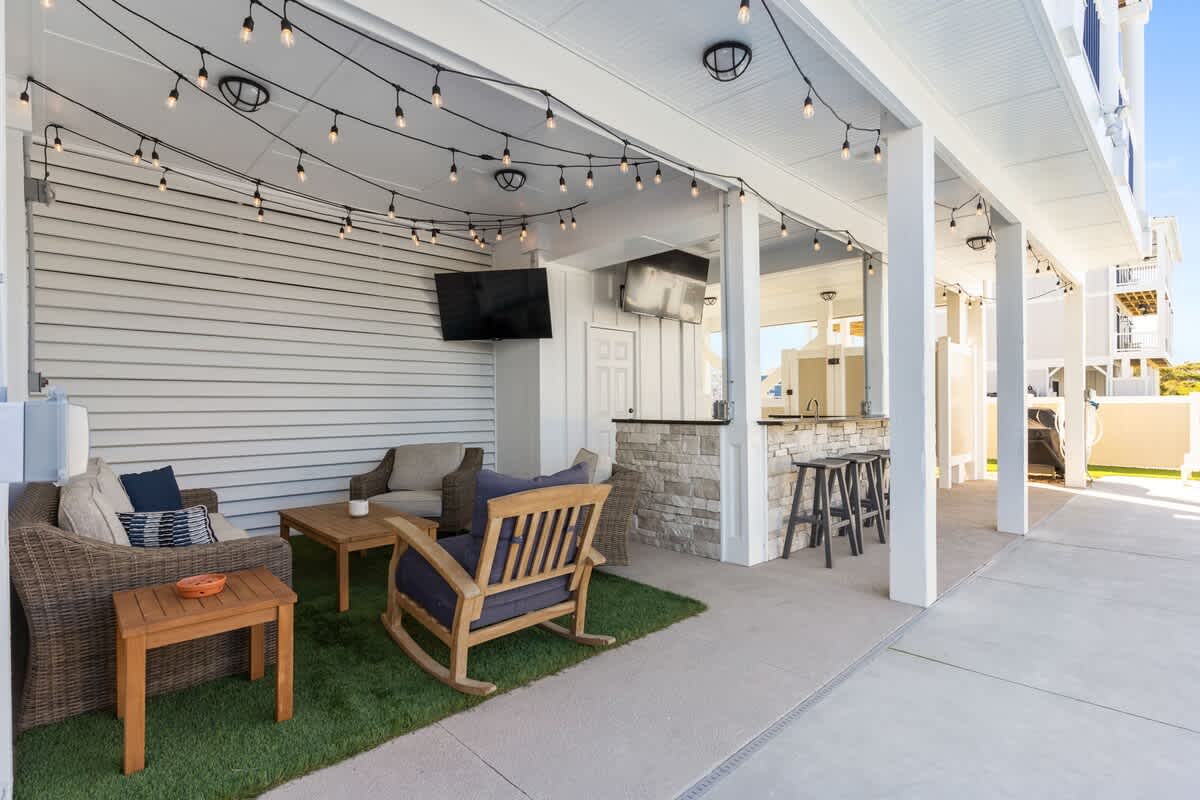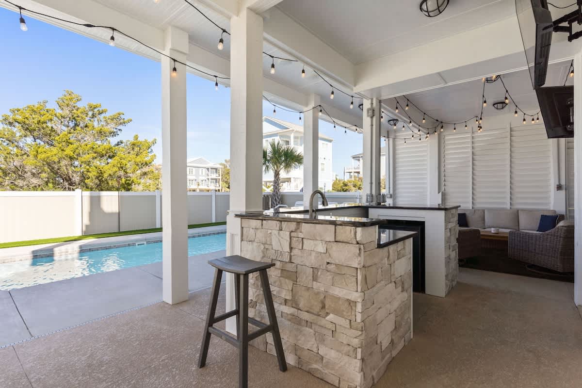 - Outdoor seating includes six bar stools, picnic table which seats 8 as well as six seats under a covering with a smart TV and grill for poolside entertainment.