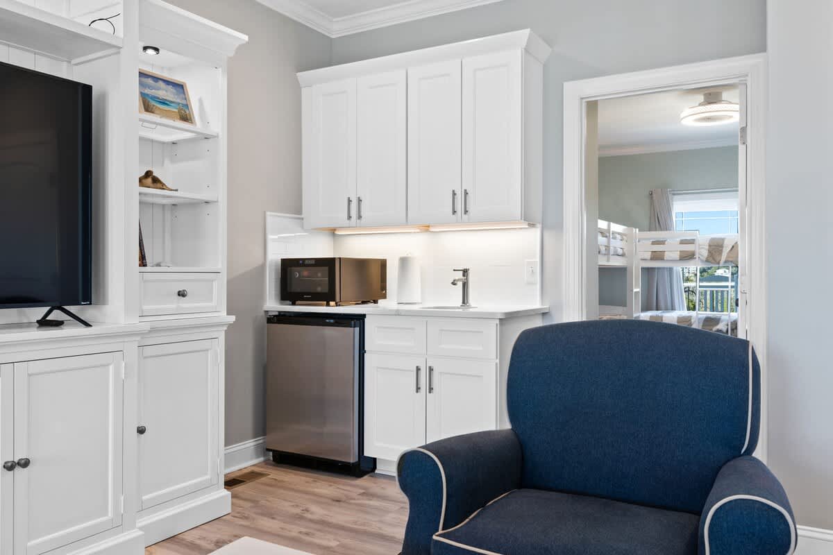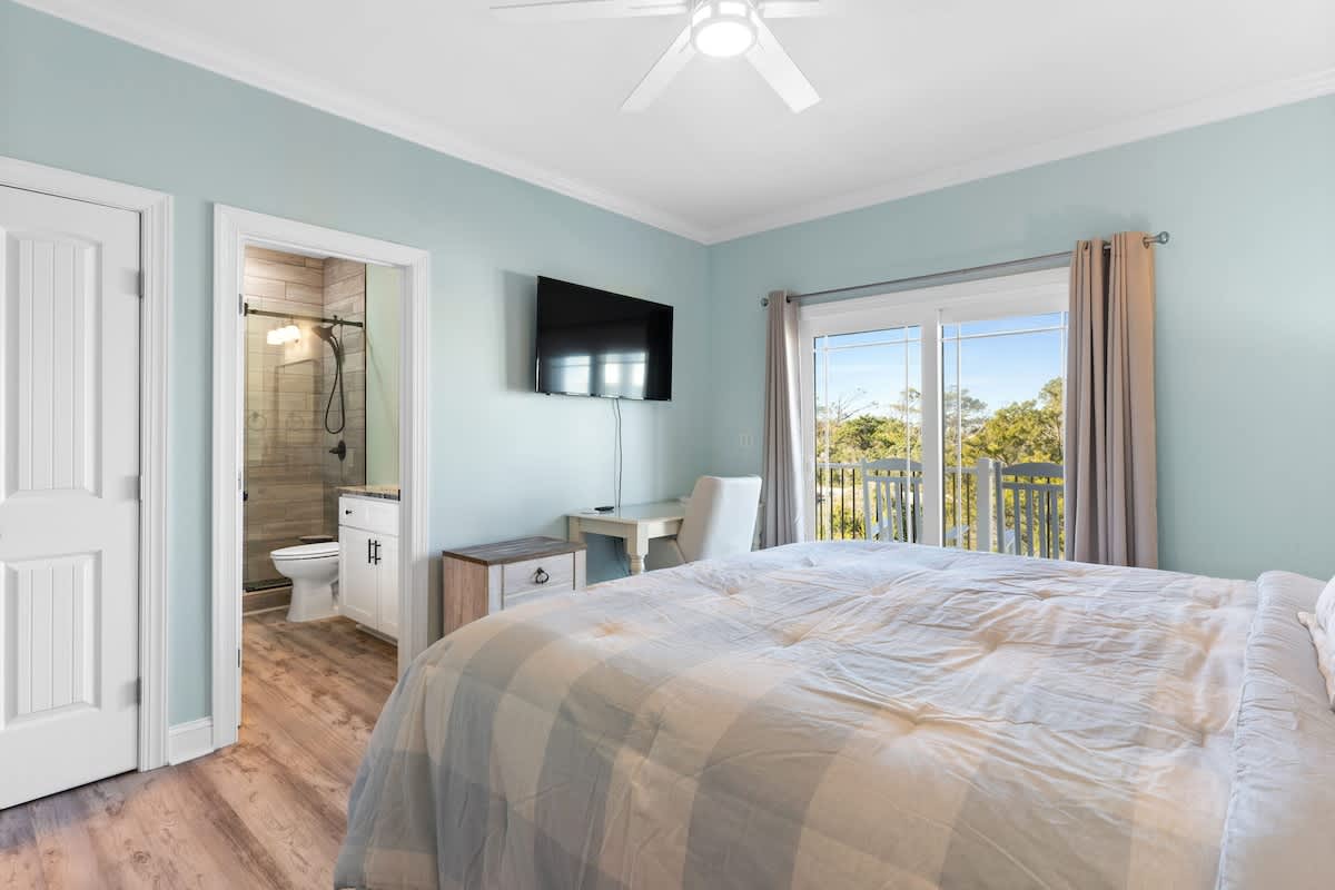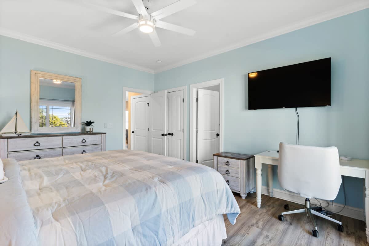 - The third bedroom on this floor features a king bed, an attached bathroom with a walk-in shower, and a desk with a chair, perfect for those who need to stay connected.