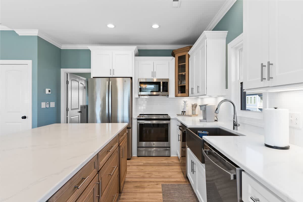 - You'll be greeted by a top-notch kitchen with stainless steel appliances, not one, but two dishwashers, and a cozy breakfast nook with four bar stools.
