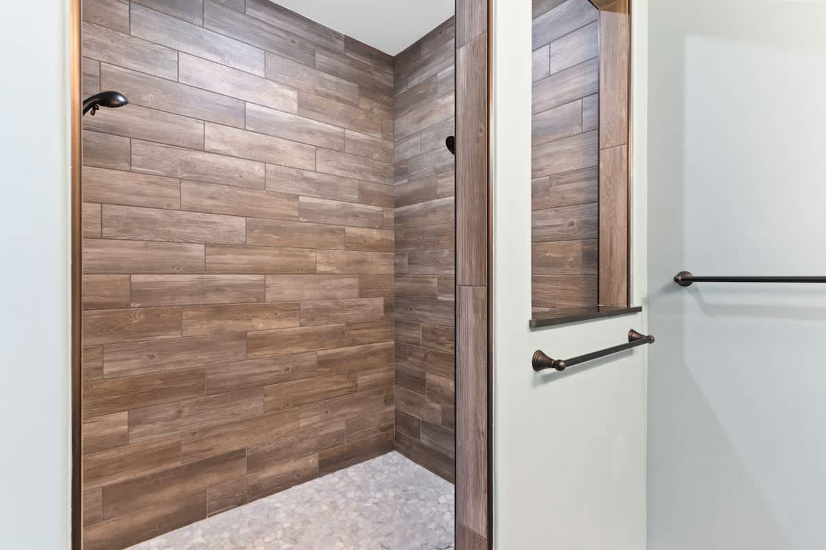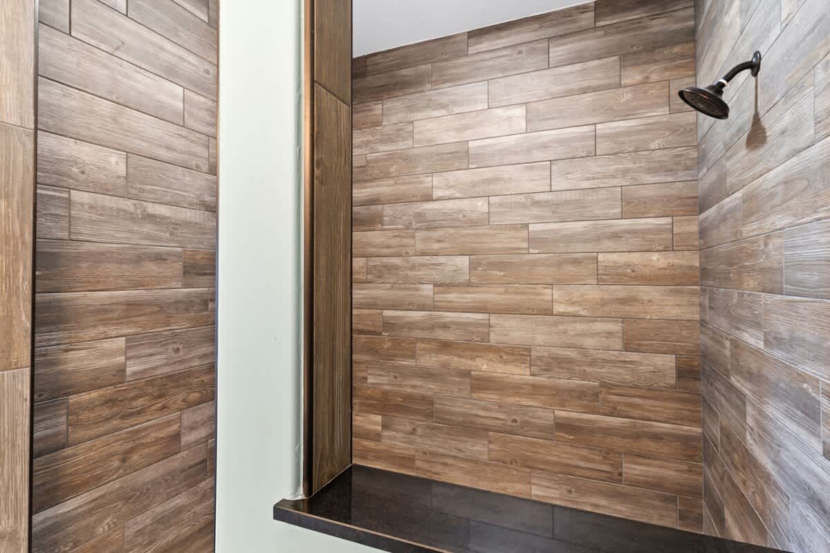 - A convenient hallway-accessible bathroom features a walk-in shower and a comfortable queen bed.
