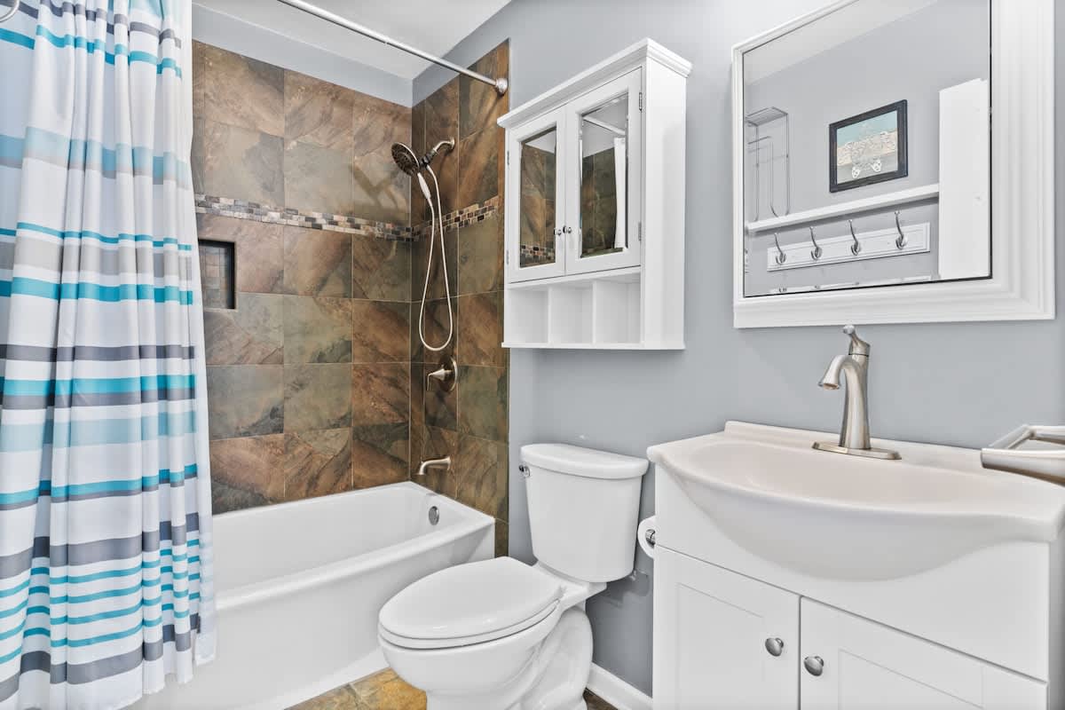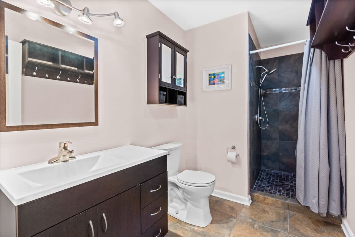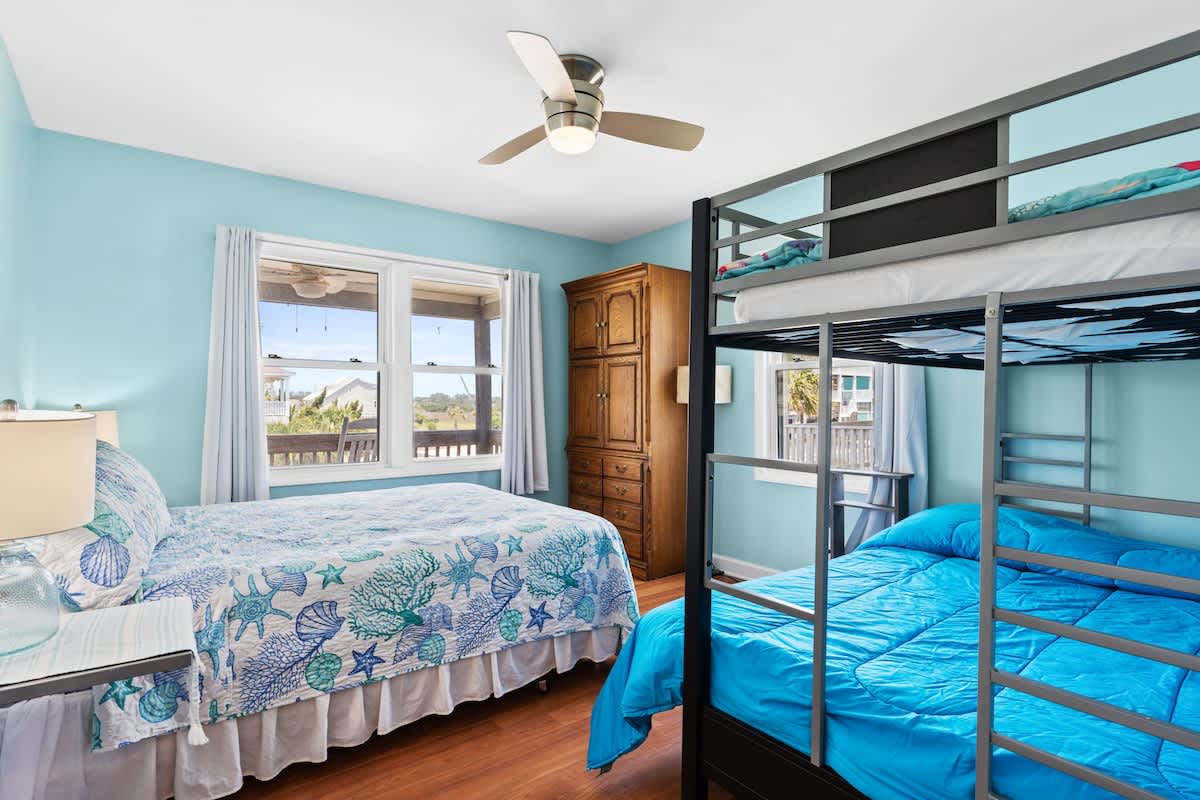 On the lower level, you'll find a cozy bedroom with a king bed, perfect for indulging in a restful night's sleep. The second bedroom offers a queen bed and a bunk bed with a futon bottom, accommodating both kids and adults comfortably. The two bedrooms share a well-appointed bathroom with a convenient tub/shower combo. Upstairs, the master bedroom features a luxurious king bed, while the fourth bedroom offers two double beds. These bedrooms share a second bathroom with a refreshing shower.