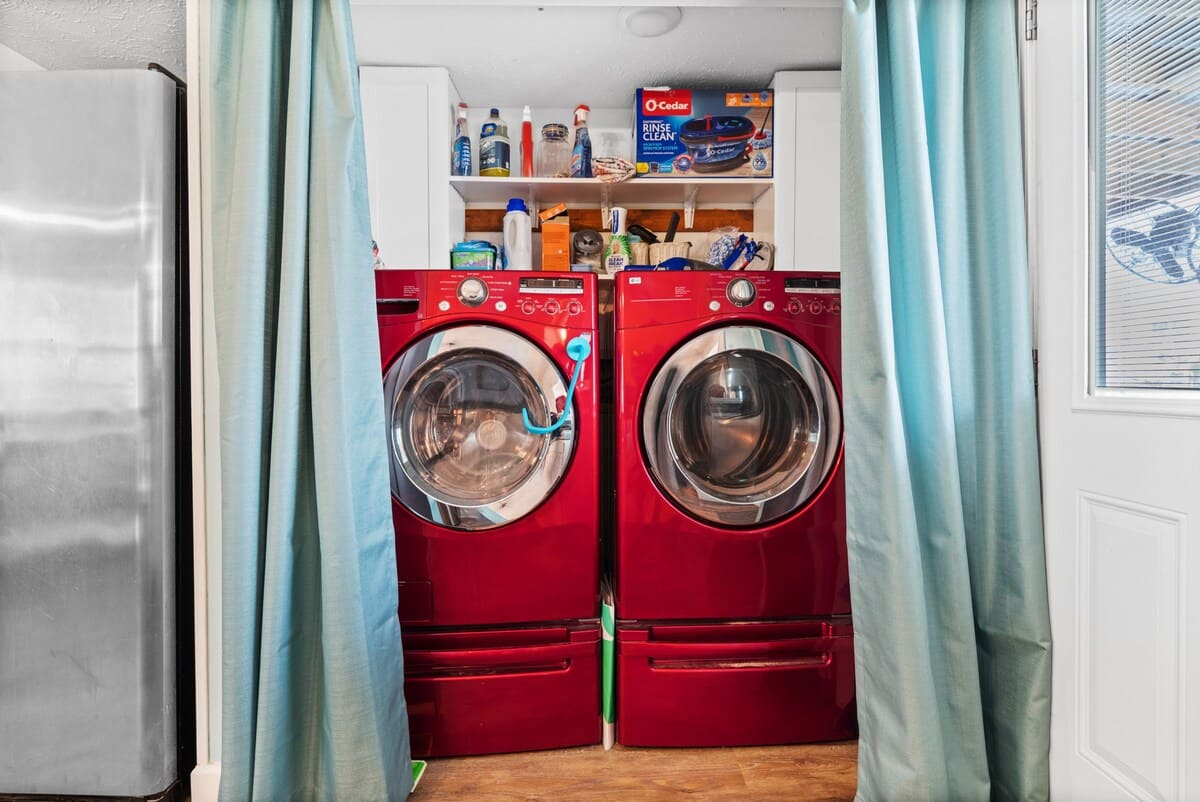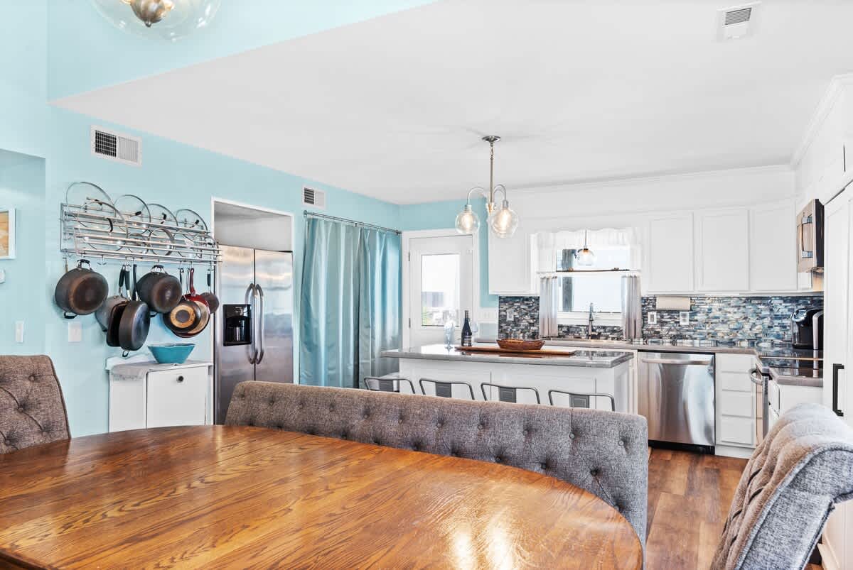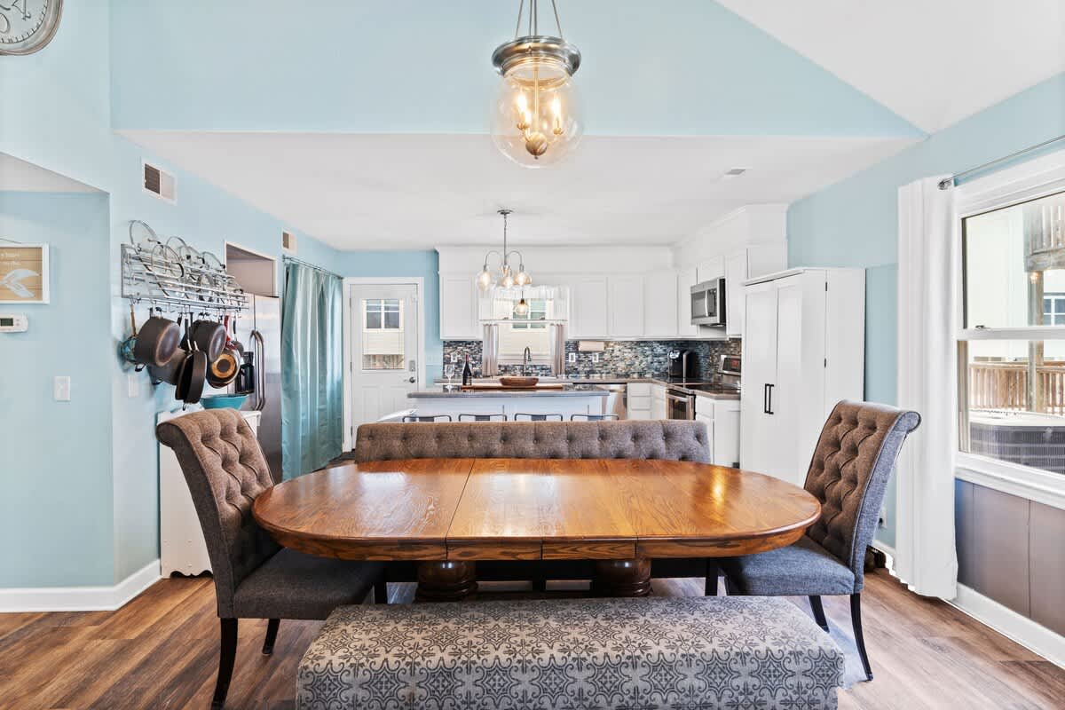 The dining room beckons with a spacious table accompanied by comfortable benches, ensuring everyone can gather for memorable family meals. Additional seating is available at the kitchen bar with three stools. The well-equipped kitchen features modern appliances including a dishwasher, microwave oven, Keurig and regular coffee makers, and a blender, making meal preparation a breeze.