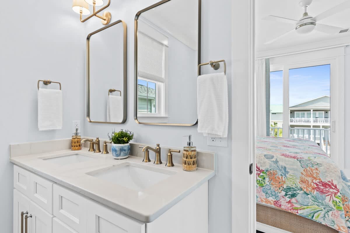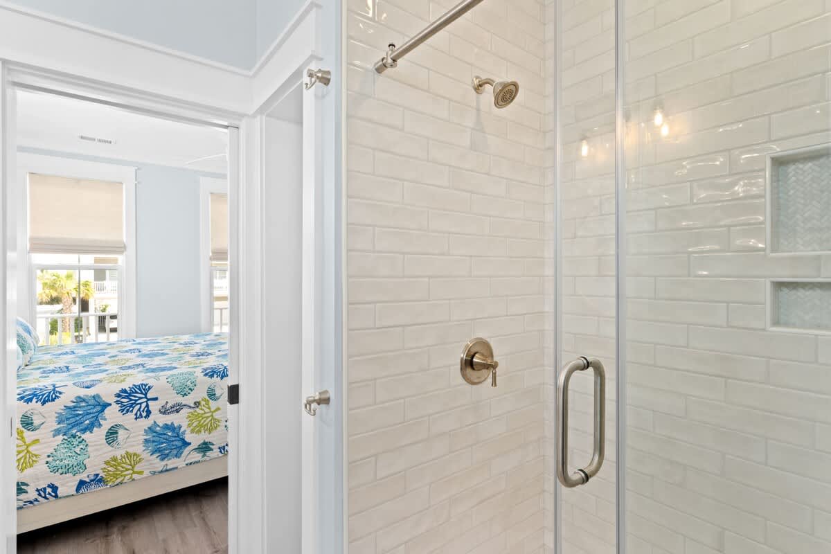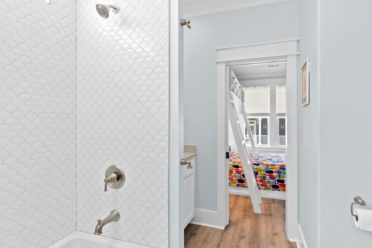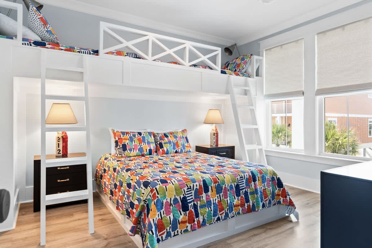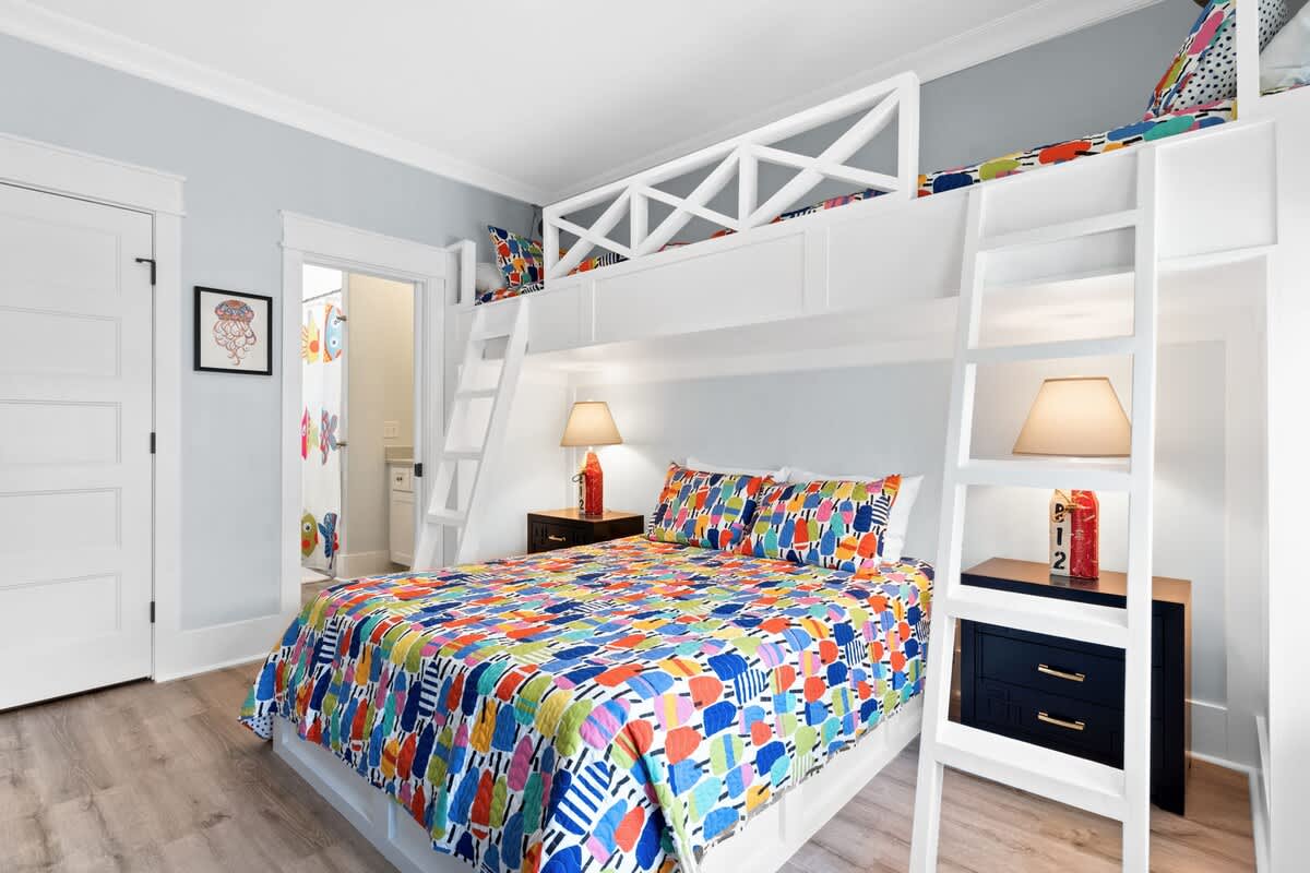 You will find the first bedroom has a Queen and two Twin bunks up top. Alongside you'll find the next has a bedroom with a queen bed. These bedrooms are connected by a Jack-and-Jill bathroom with tub/shower combo.
