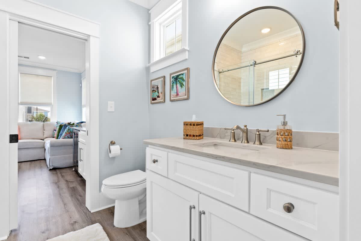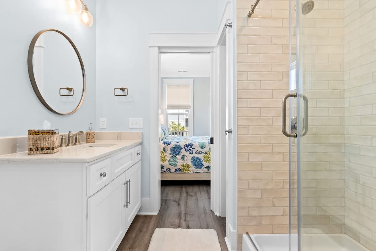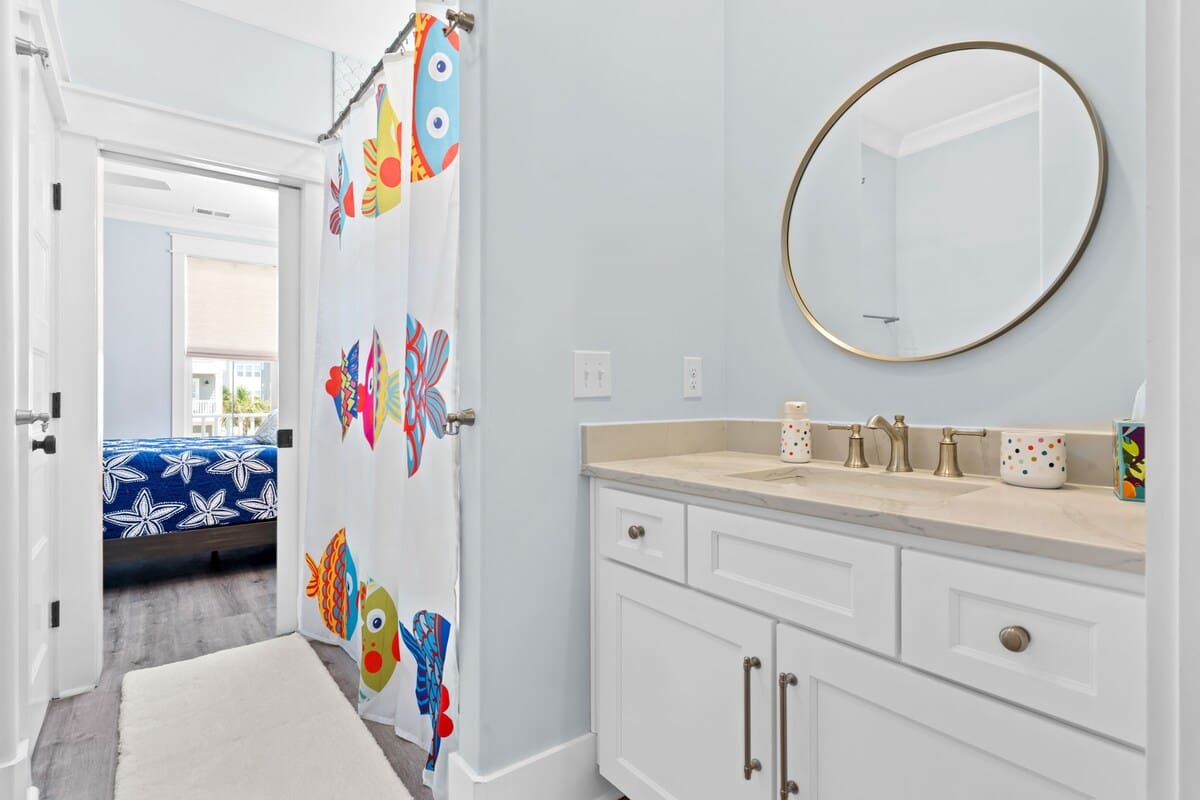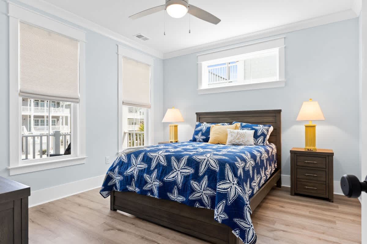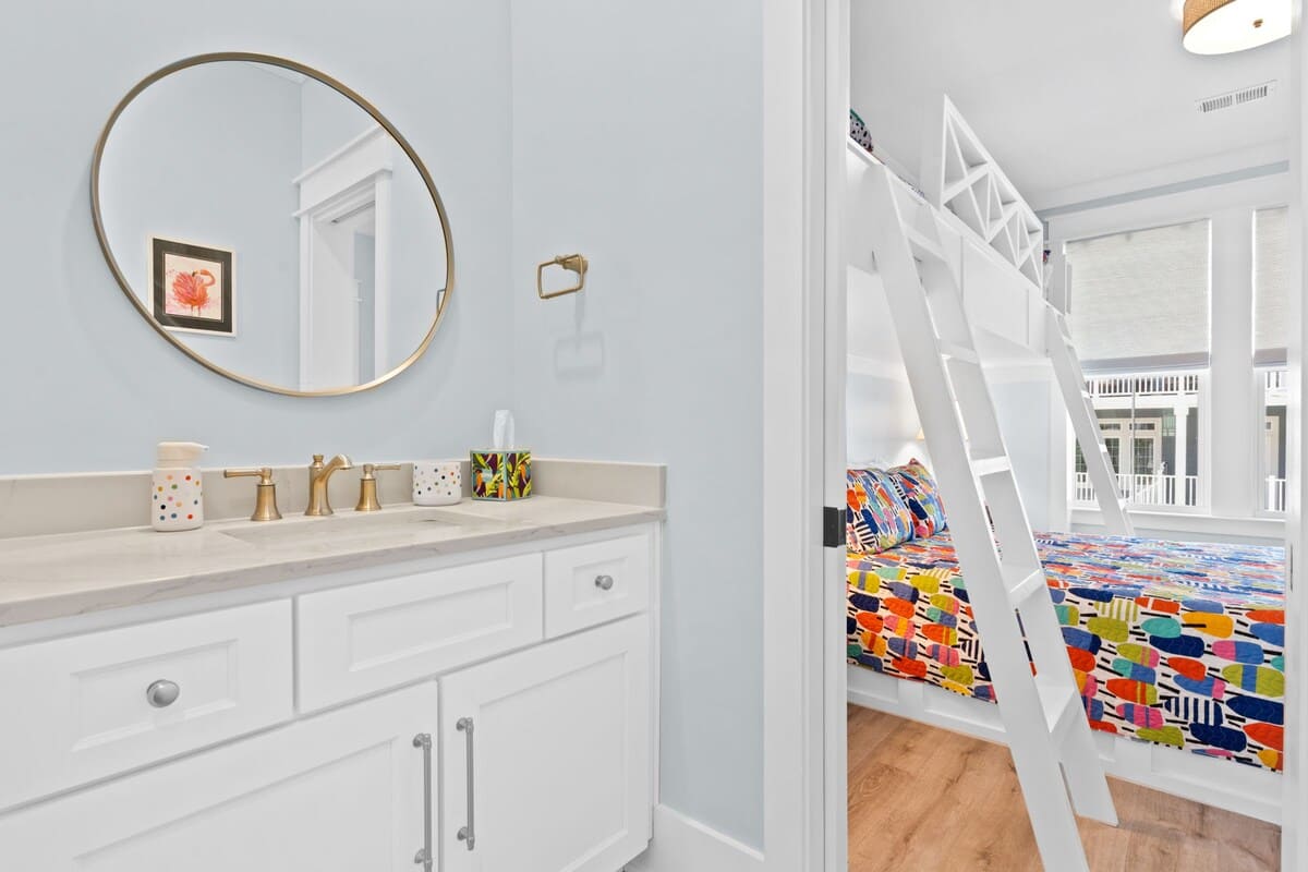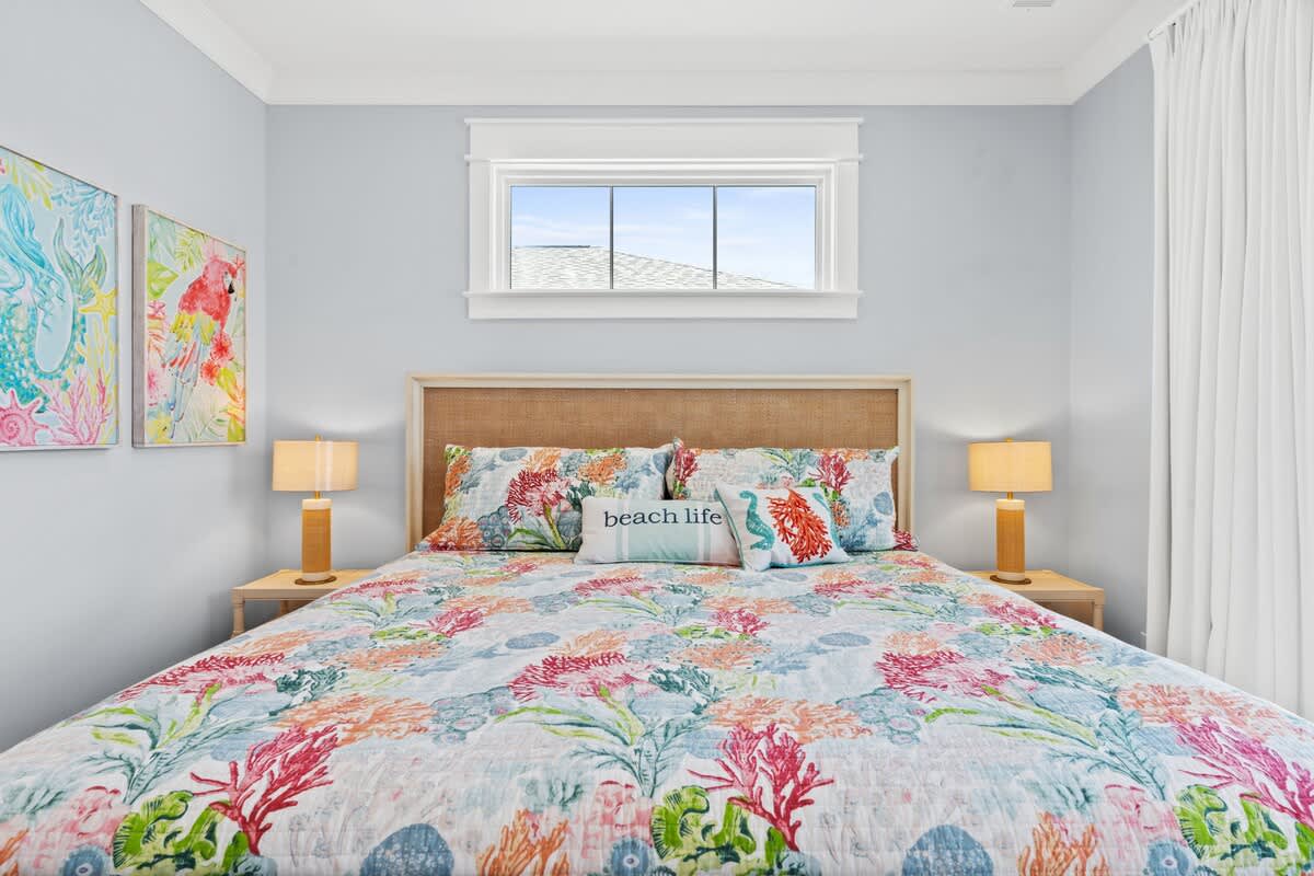 You will find the first bedroom has a Queen and two Twin bunks up top. Alongside you'll find the next has a bedroom with a queen bed. These bedrooms are connected by a Jack-and-Jill bathroom with tub/shower combo.