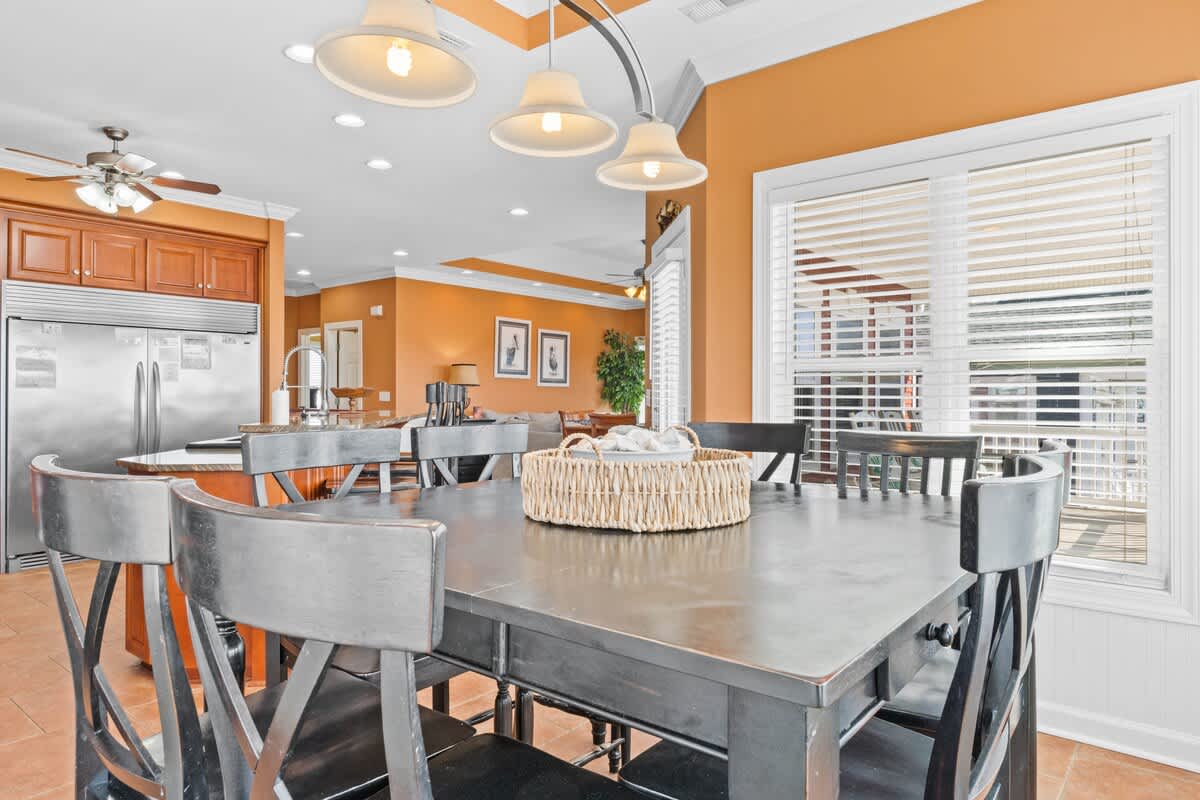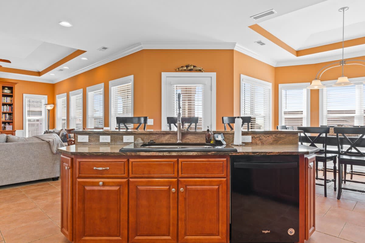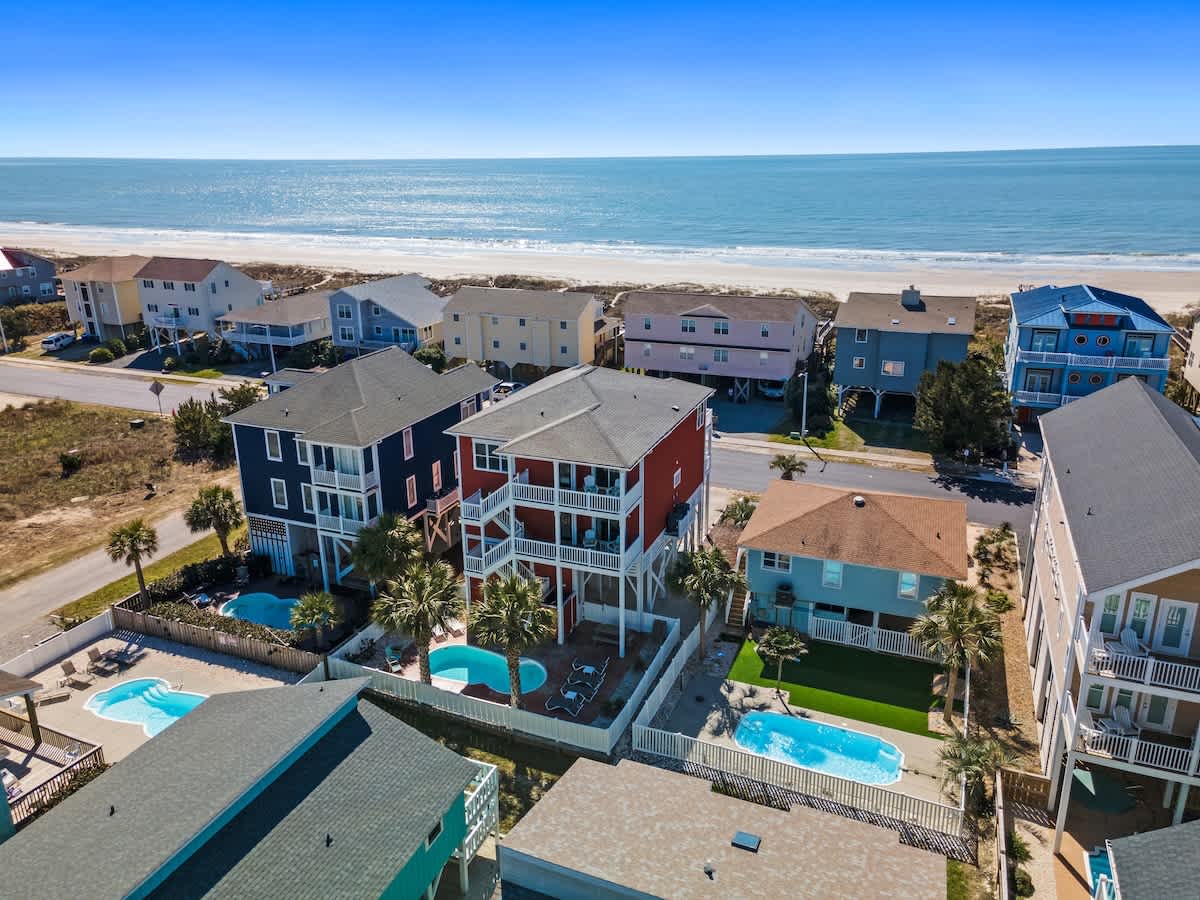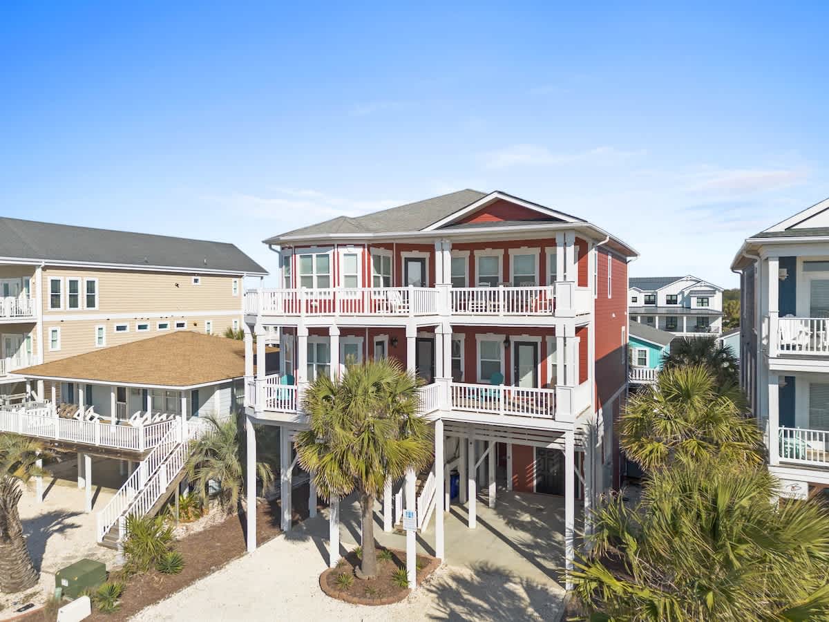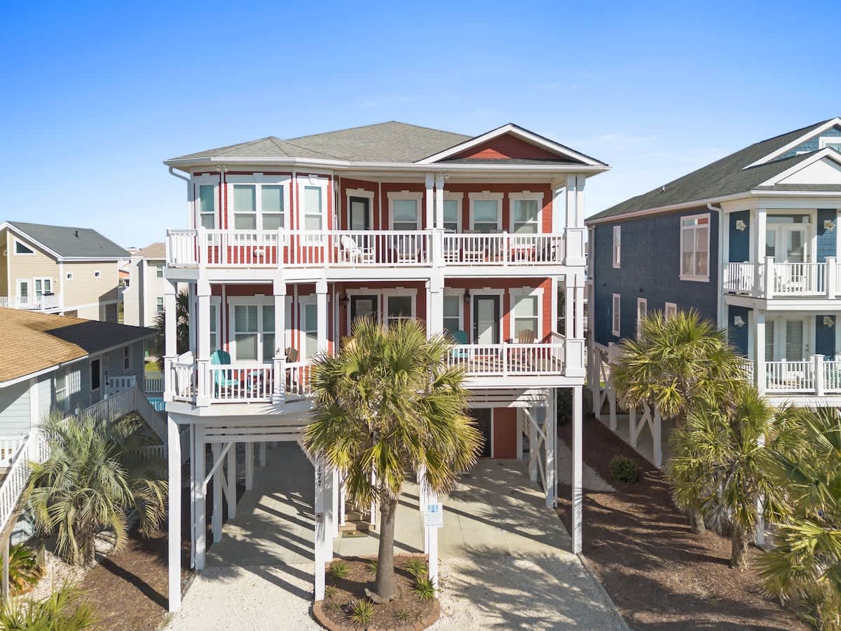Welcome to Cherry Bomb, managed by Brunswick Vacation Rentals! Cherry Bomb has a reverse floor plan and offers stunning ocean views from the top floor where the living room, kitchen and dining room are located. The spacious and very comfortable living room offers two plush couches and a love seat that surround a large flat-screen Smart TV with cable. The kitchen is fully stocked and has beautiful stone countertops, a large kitchen island, and offers appliances including a commercial refrigerator and separate refrigerator specifically for your drinks. There's plenty of seating available for meal times with two tables offering seating for 11, and 3 additional seats which can be found along the kitchen island, for a total of 14. Kitchen amenities include a tea kettle, drip coffee maker, toaster, blender, mixer, and crockpot.
