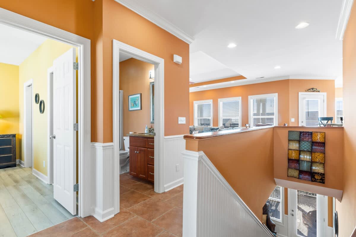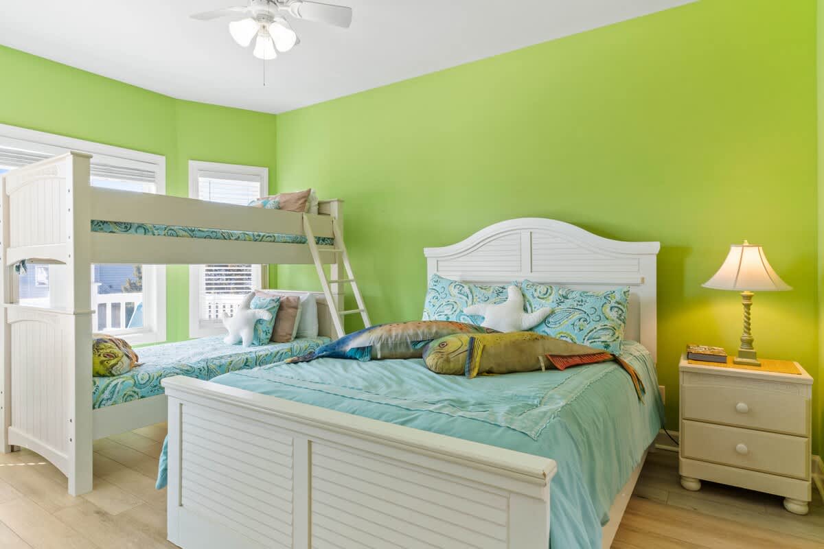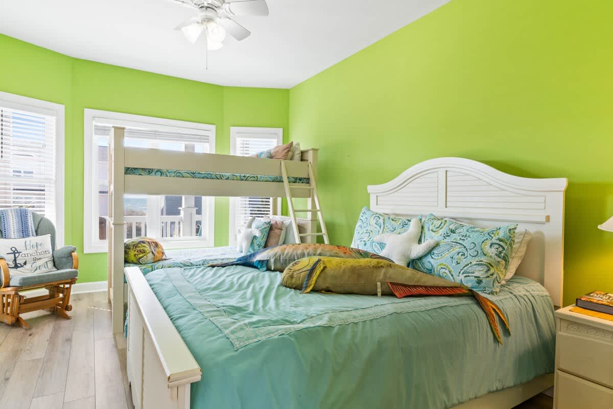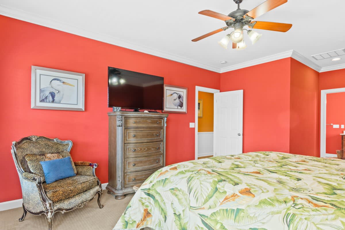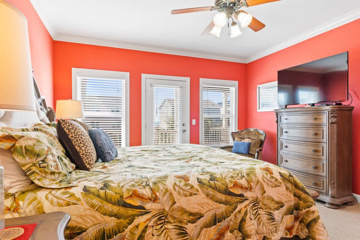 The lower level is where the master suite is located which has a King-sized bed, access to the balcony and an en-suite bathroom equipped with a double vanity and beautifully tiled walk-in shower. Also on this level is a second bedroom containing a Queen bed and a third bedroom which has one twin-over-twin bunk bed as well as a Queen bed. These two rooms share a Jack-and-Jill bathroom which has a stand-alone shower. Two additional bedrooms can be found on the top floor, one with a King and the other with a Queen, each with en-suite bathrooms with a tub/shower combo. All five bedrooms have a flat-screen TV with cable.