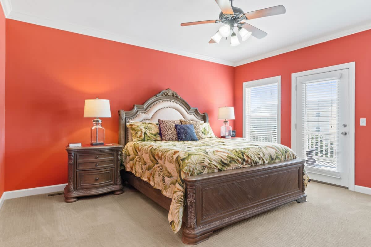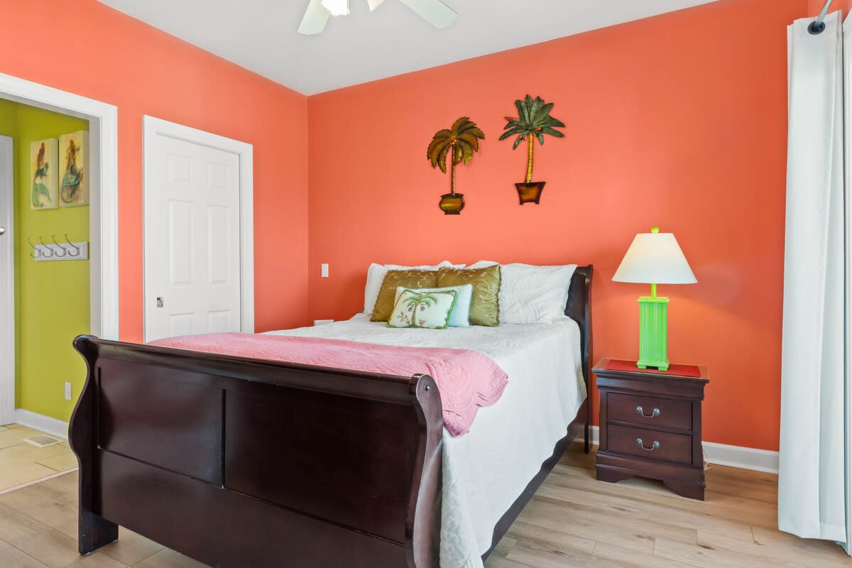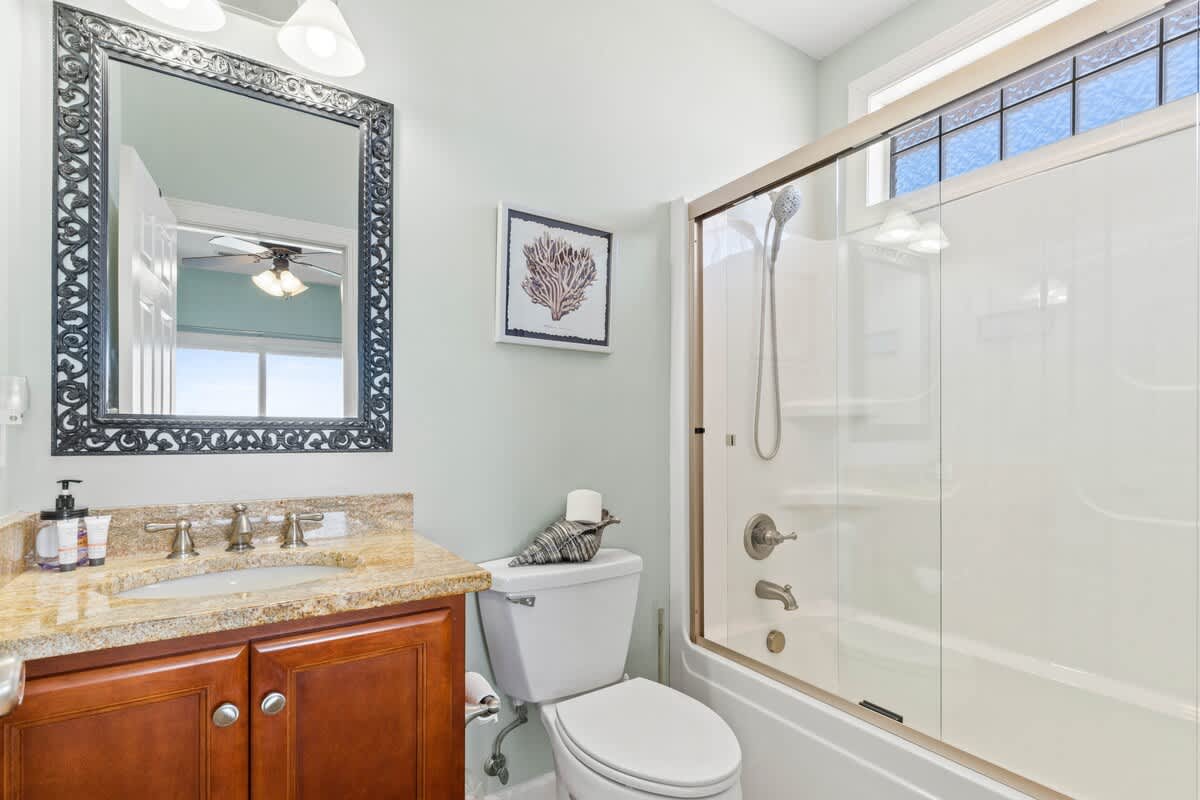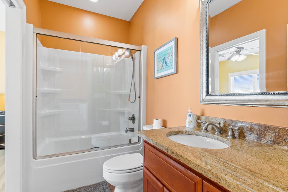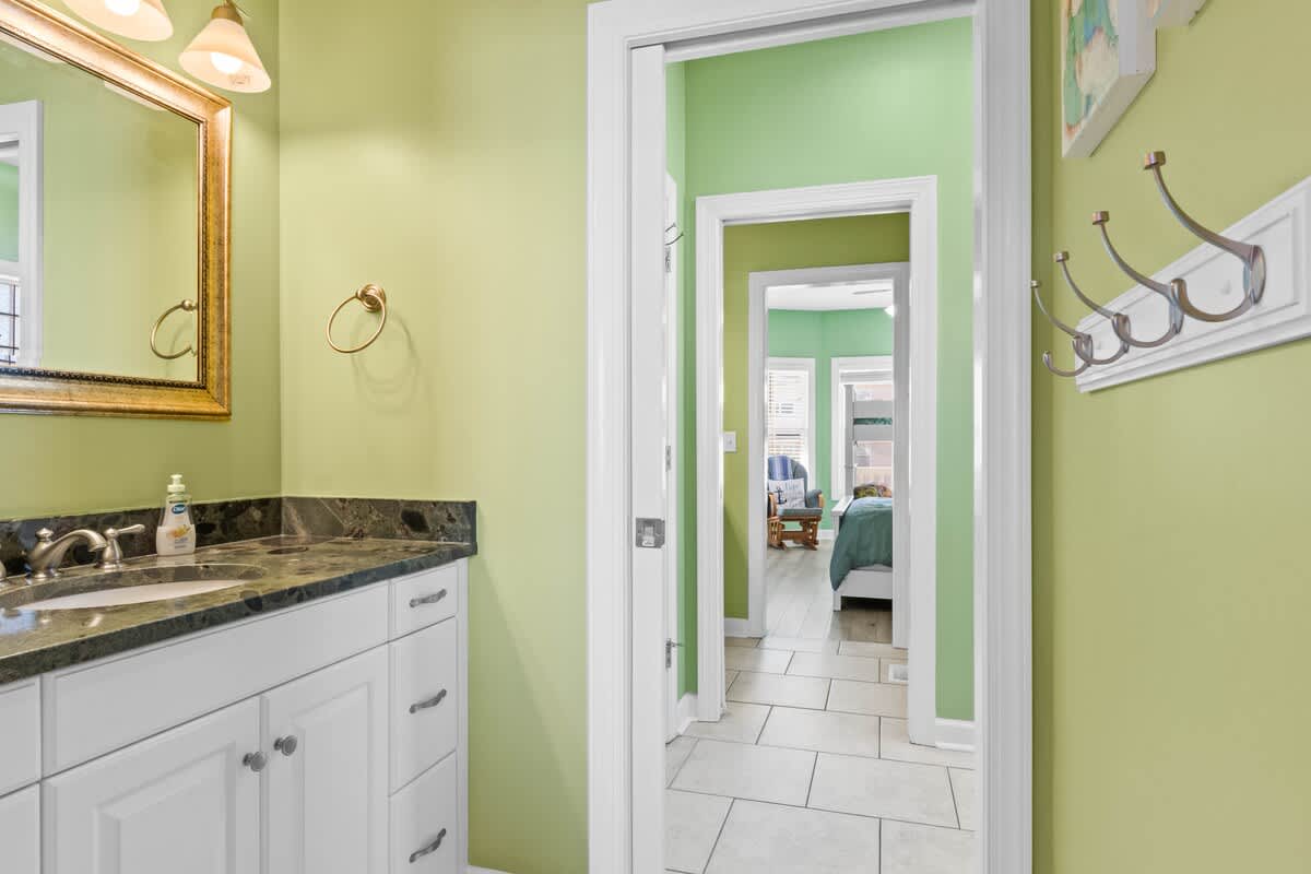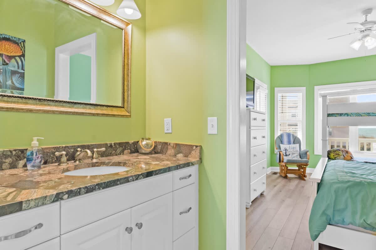 The lower level is where the master suite is located which has a King-sized bed, access to the balcony and an en-suite bathroom equipped with a double vanity and beautifully tiled walk-in shower. Also on this level is a second bedroom containing a Queen bed and a third bedroom which has one twin-over-twin bunk bed as well as a Queen bed. These two rooms share a Jack-and-Jill bathroom which has a stand-alone shower. Two additional bedrooms can be found on the top floor, one with a King and the other with a Queen, each with en-suite bathrooms with a tub/shower combo. All five bedrooms have a flat-screen TV with cable.