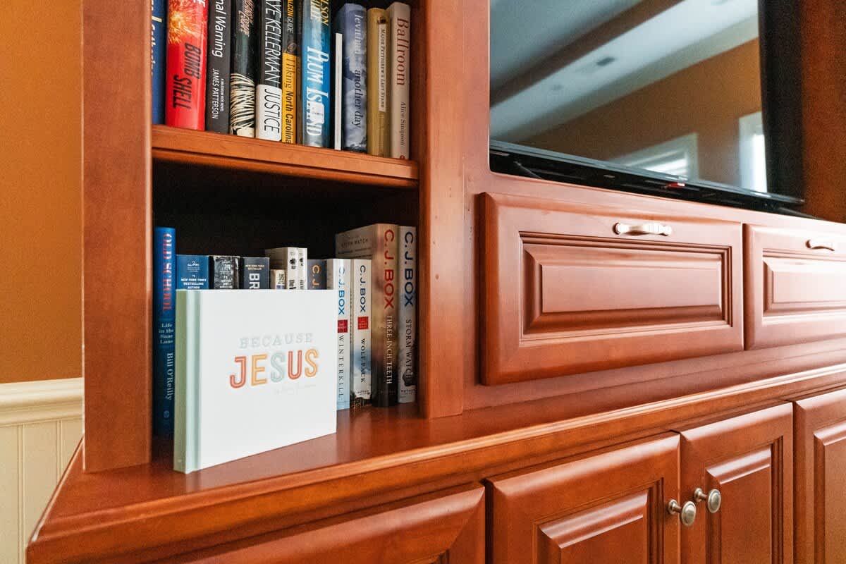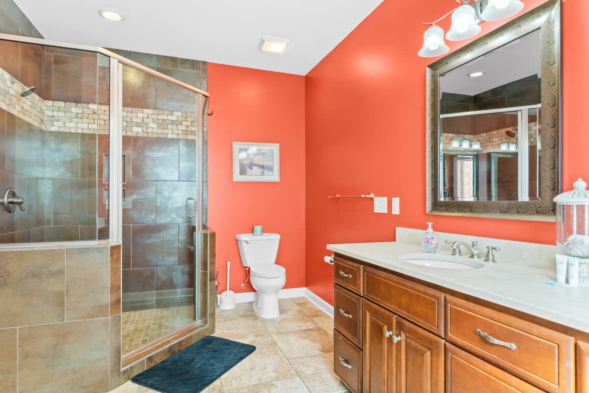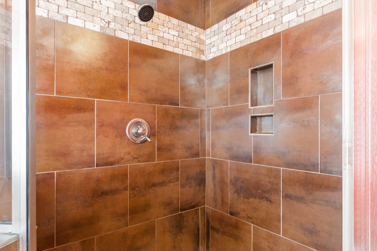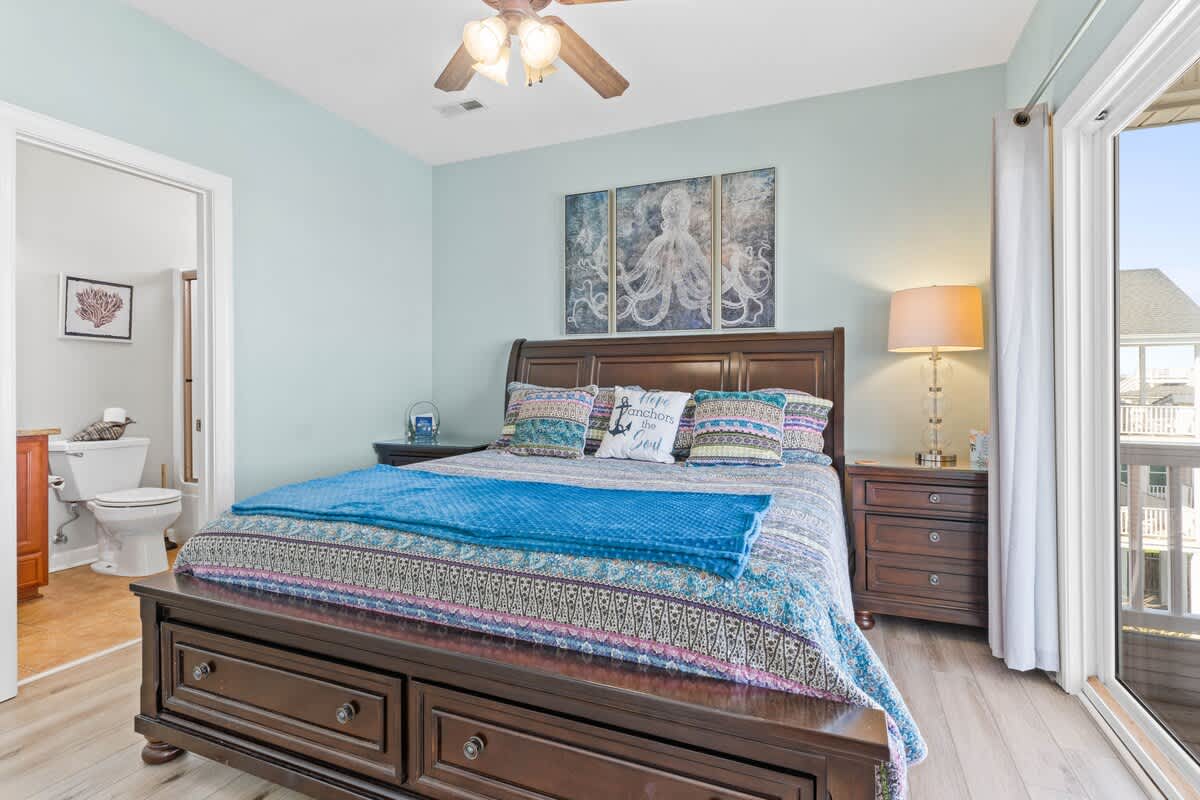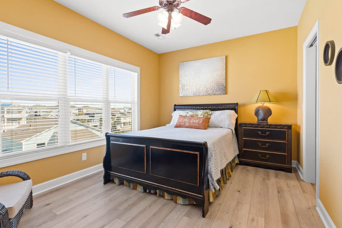 The lower level is where the master suite is located which has a King-sized bed, access to the balcony and an en-suite bathroom equipped with a double vanity and beautifully tiled walk-in shower. Also on this level is a second bedroom containing a Queen bed and a third bedroom which has one twin-over-twin bunk bed as well as a Queen bed. These two rooms share a Jack-and-Jill bathroom which has a stand-alone shower. Two additional bedrooms can be found on the top floor, one with a King and the other with a Queen, each with en-suite bathrooms with a tub/shower combo. All five bedrooms have a flat-screen TV with cable.