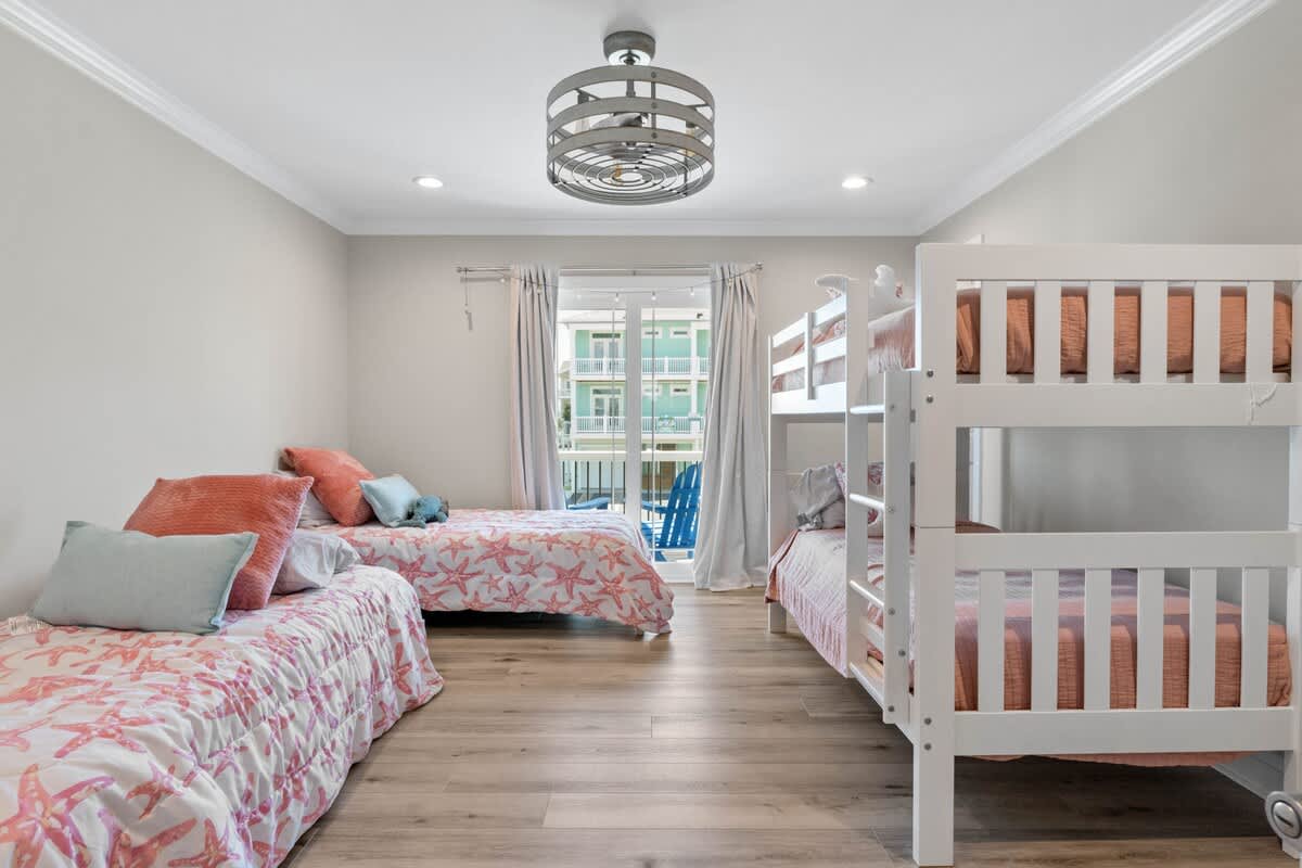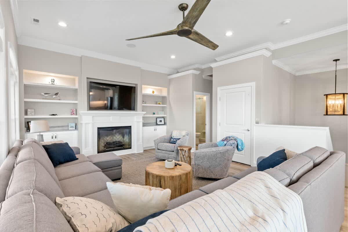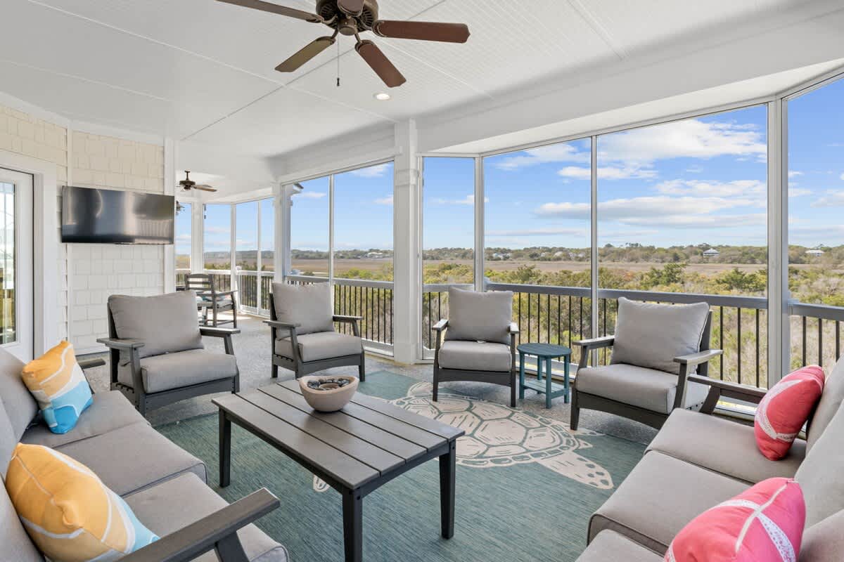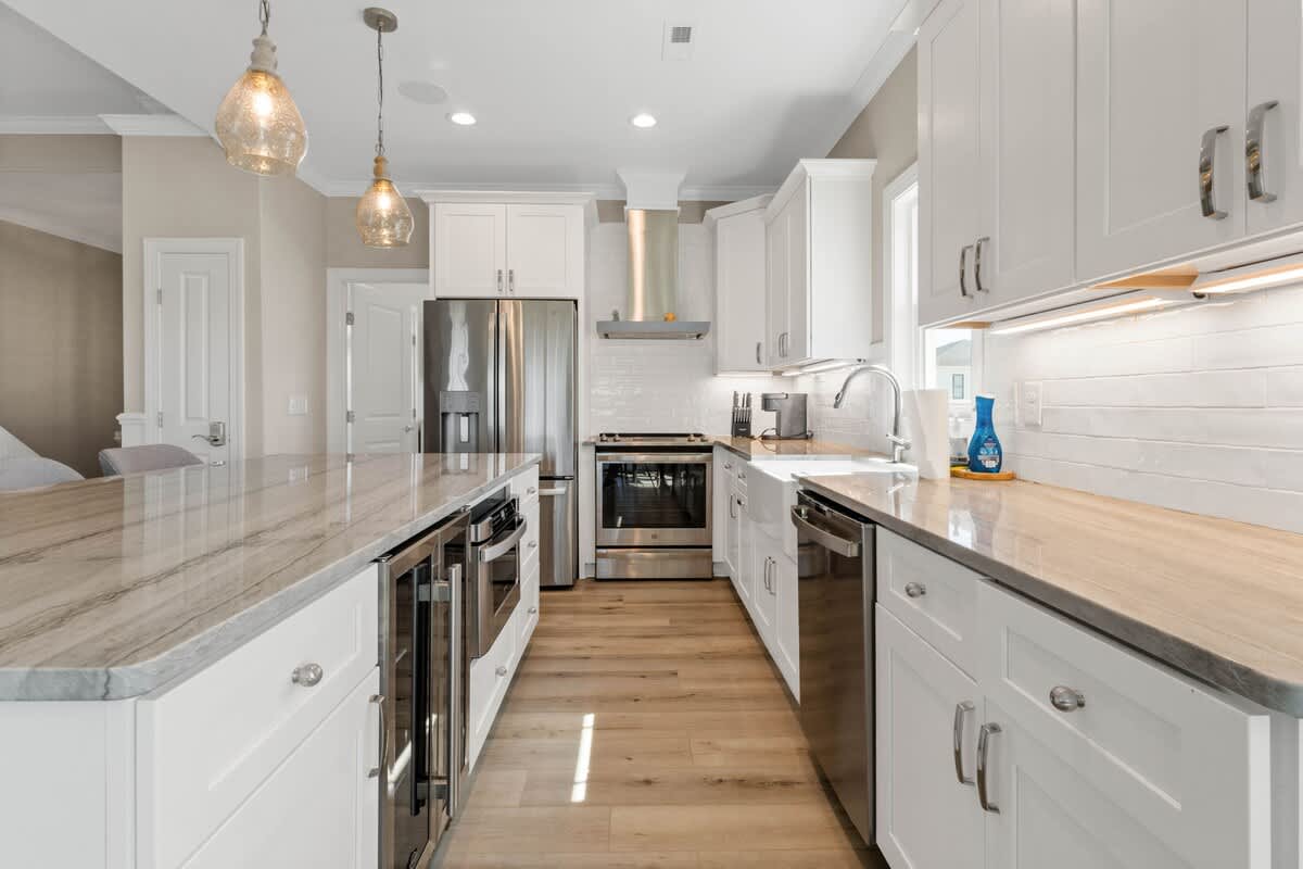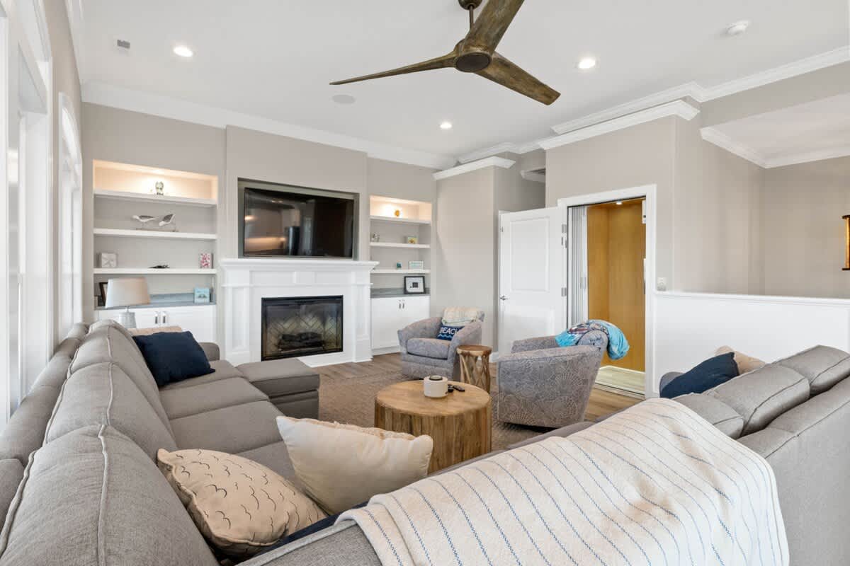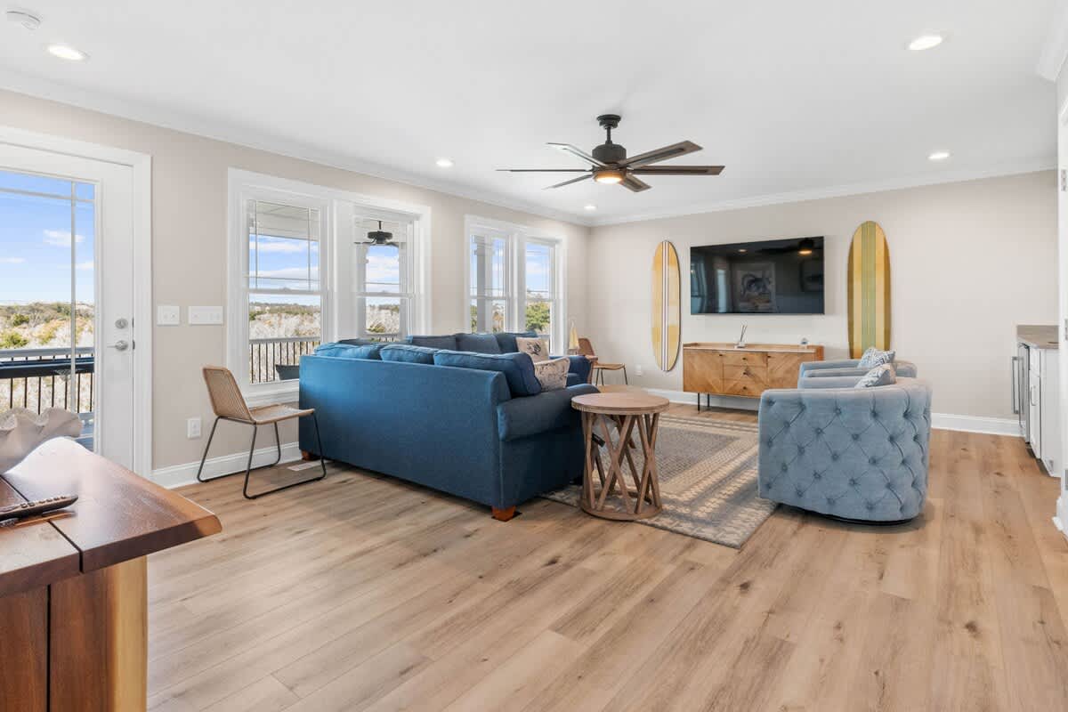 Welcome to Coastal Sunset! Experience the epitome of communal living with this home's innovative reverse and open floor plan, facilitating gatherings of family and friends in the expansive living room, kitchen, and dining area nestled on the top floor. Adorned with windows on all sides, this level basks in an abundance of natural light, creating a vibrant ambiance throughout. Sink into the plush seating arrangements in the living room, focused around the colossal flat-screen Smart TV flanked by built-in shelves. The kitchen exudes elegance with its tasteful décor and features quartz countertops, stainless steel appliances, and a convenient Keurig/drip coffee maker. Completing this floor are two full bathrooms and two bedrooms- both with King Beds.