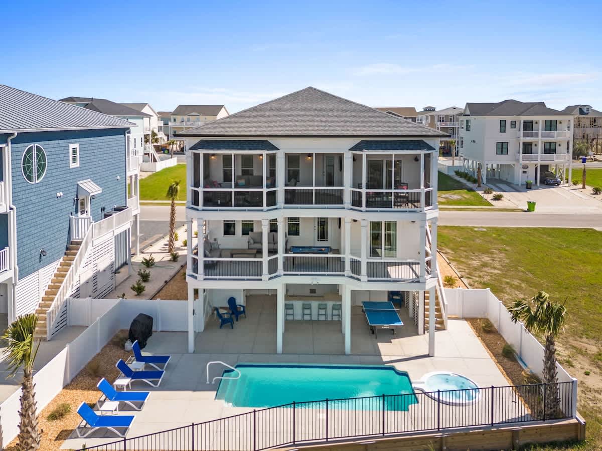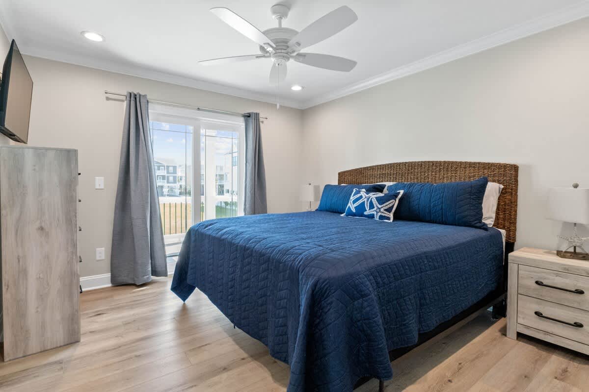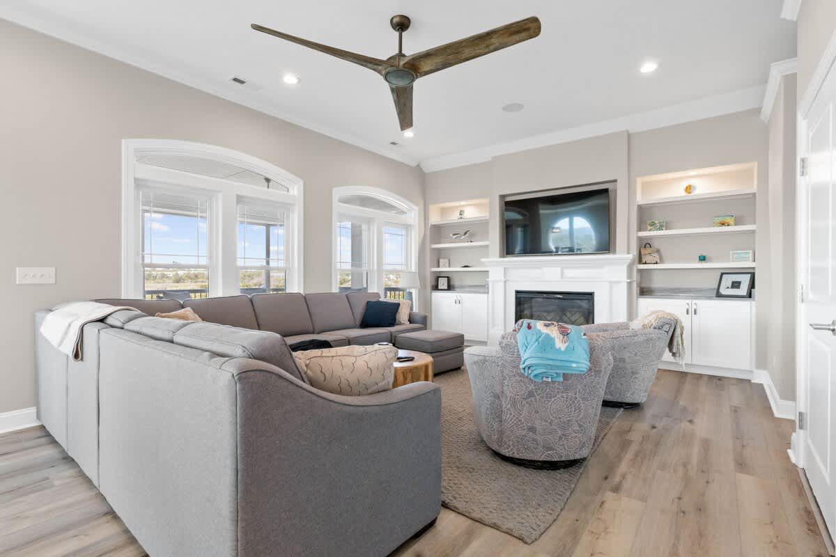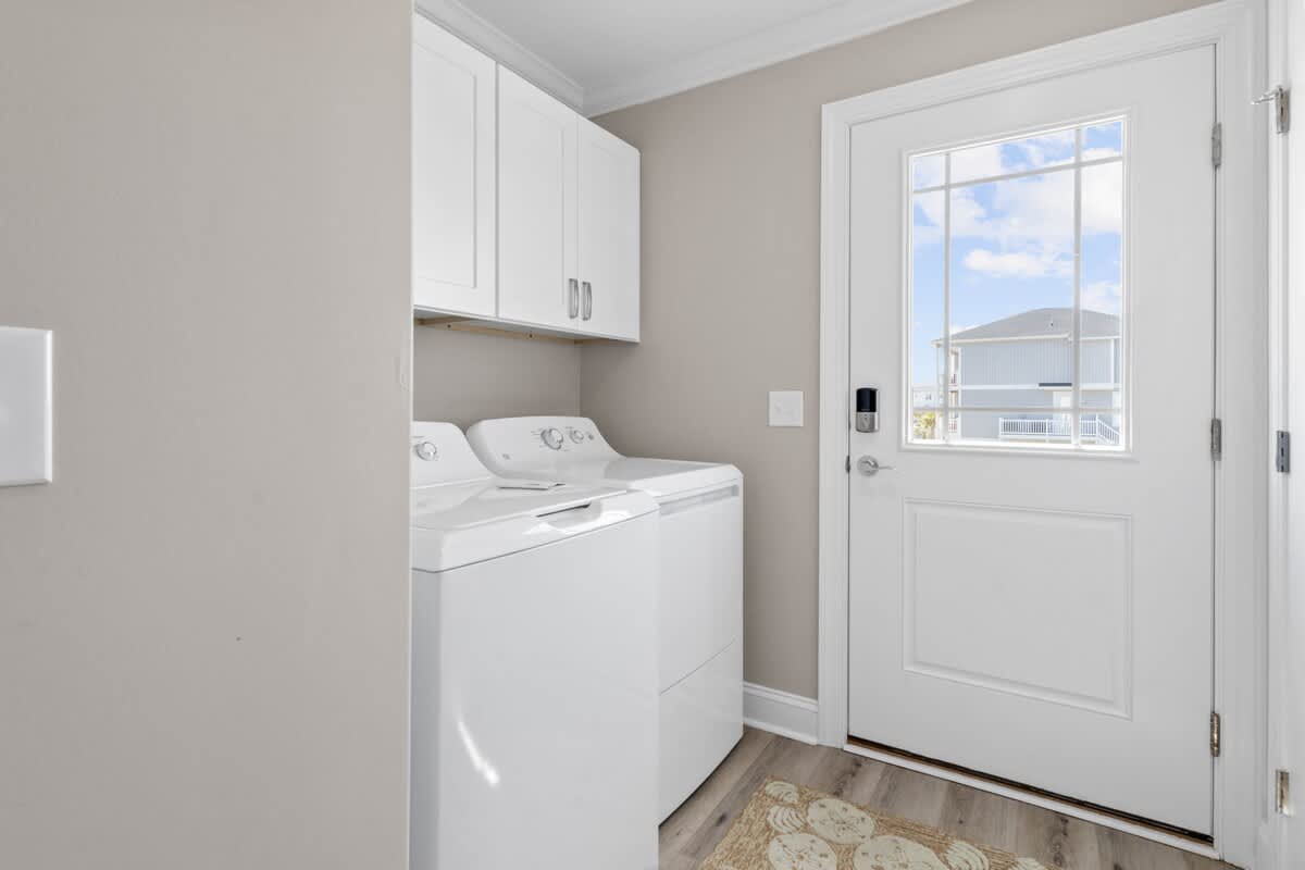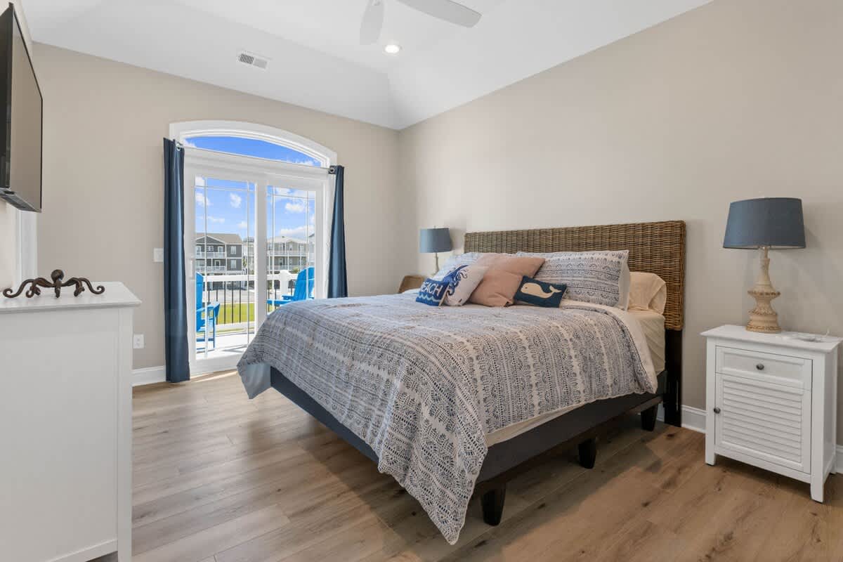 Welcome to Coastal Sunset! Experience the epitome of communal living with this home's innovative reverse and open floor plan, facilitating gatherings of family and friends in the expansive living room, kitchen, and dining area nestled on the top floor. Adorned with windows on all sides, this level basks in an abundance of natural light, creating a vibrant ambiance throughout. Sink into the plush seating arrangements in the living room, focused around the colossal flat-screen Smart TV flanked by built-in shelves. The kitchen exudes elegance with its tasteful décor and features quartz countertops, stainless steel appliances, and a convenient Keurig/drip coffee maker. Completing this floor are two full bathrooms and two bedrooms- both with King Beds.