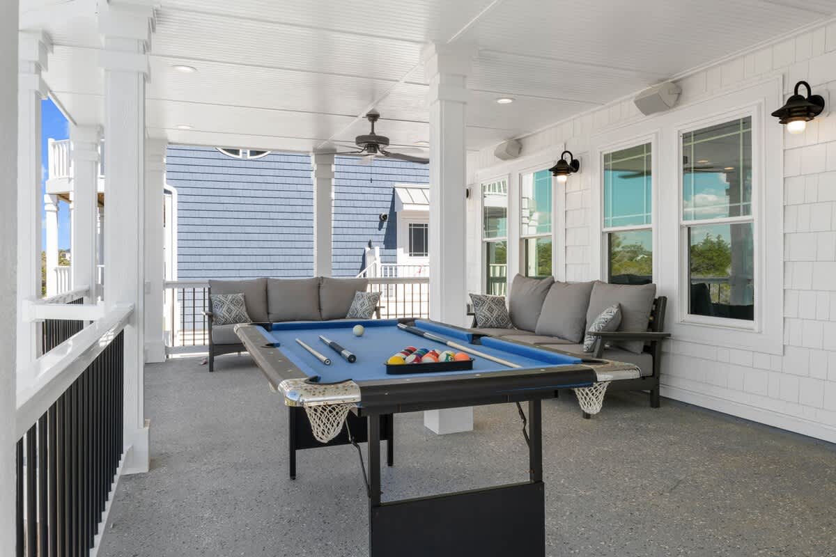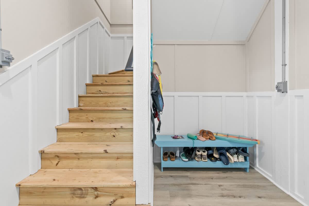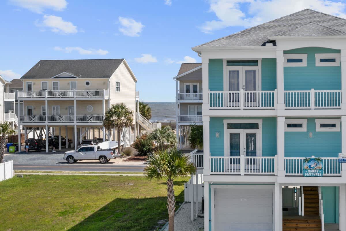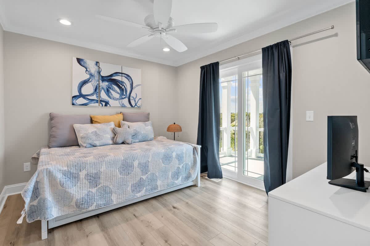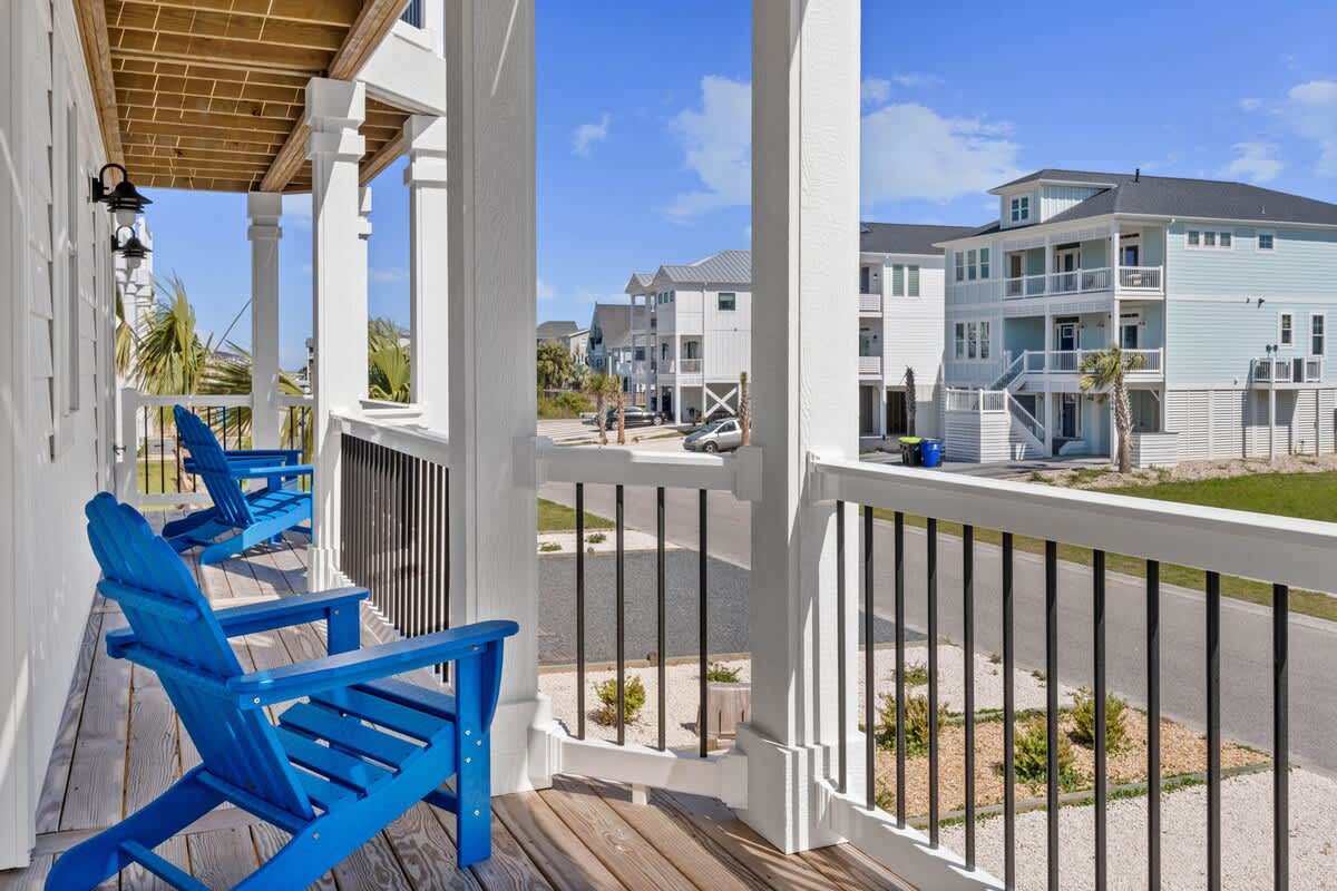 Welcome to Coastal Sunset! Experience the epitome of communal living with this home's innovative reverse and open floor plan, facilitating gatherings of family and friends in the expansive living room, kitchen, and dining area nestled on the top floor. Adorned with windows on all sides, this level basks in an abundance of natural light, creating a vibrant ambiance throughout. Sink into the plush seating arrangements in the living room, focused around the colossal flat-screen Smart TV flanked by built-in shelves. The kitchen exudes elegance with its tasteful décor and features quartz countertops, stainless steel appliances, and a convenient Keurig/drip coffee maker. Completing this floor are two full bathrooms and two bedrooms- both with King Beds.