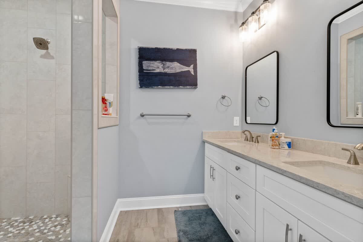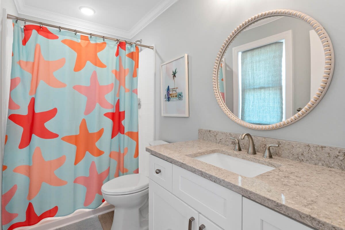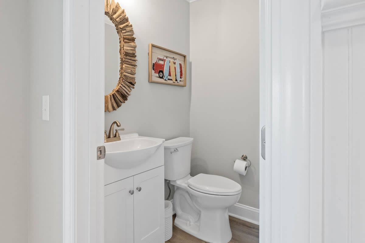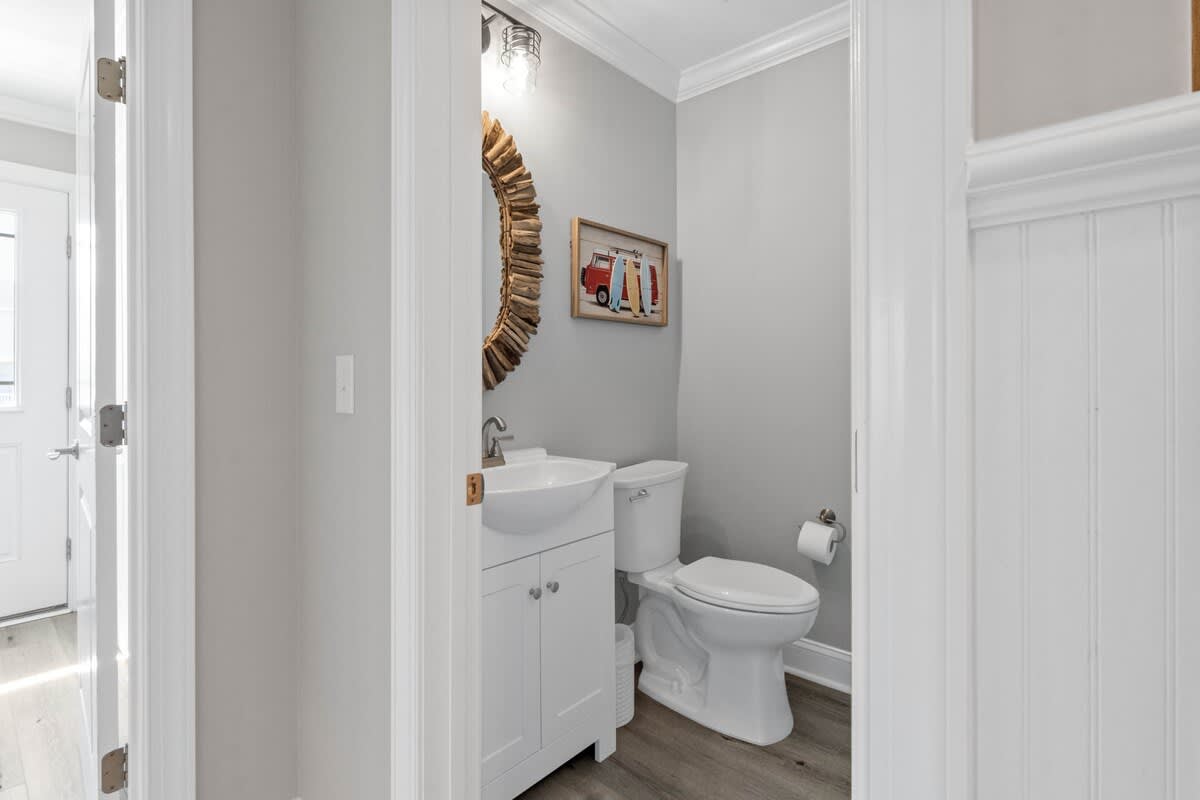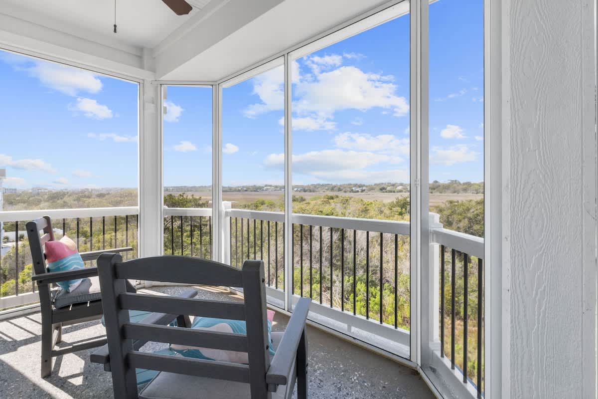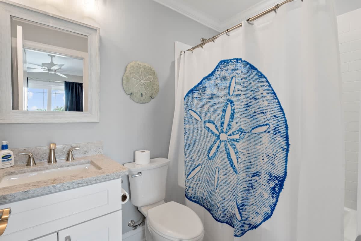 Welcome to Coastal Sunset! Experience the epitome of communal living with this home's innovative reverse and open floor plan, facilitating gatherings of family and friends in the expansive living room, kitchen, and dining area nestled on the top floor. Adorned with windows on all sides, this level basks in an abundance of natural light, creating a vibrant ambiance throughout. Sink into the plush seating arrangements in the living room, focused around the colossal flat-screen Smart TV flanked by built-in shelves. The kitchen exudes elegance with its tasteful décor and features quartz countertops, stainless steel appliances, and a convenient Keurig/drip coffee maker. Completing this floor are two full bathrooms and two bedrooms- both with King Beds.