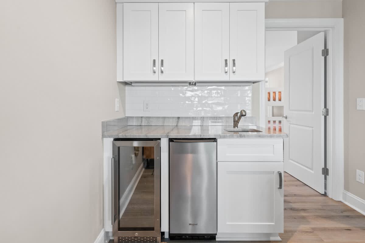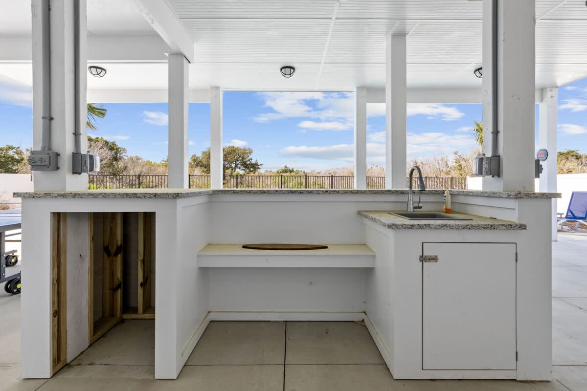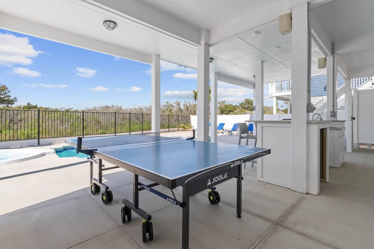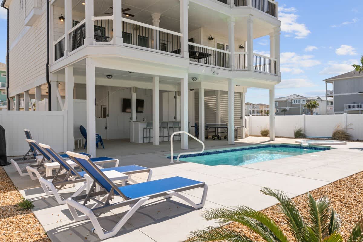 Further downward, on the ground floor, leading to the backyard is your very own tropical sanctuary. Enveloped by swaying palm trees, the outdoor space features a dazzling azure pool and rejuvenating spa, alongside a charming tiki bar encompassing a wet bar and flat-screen Smart TV. Ample seating options, including lounge chairs, invite you to bask in the sunshine, while an outdoor shower, gas grill, and an array of amenities enhance your outdoor experience.