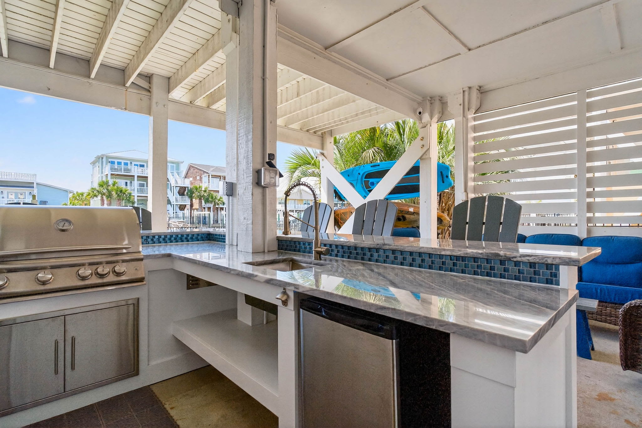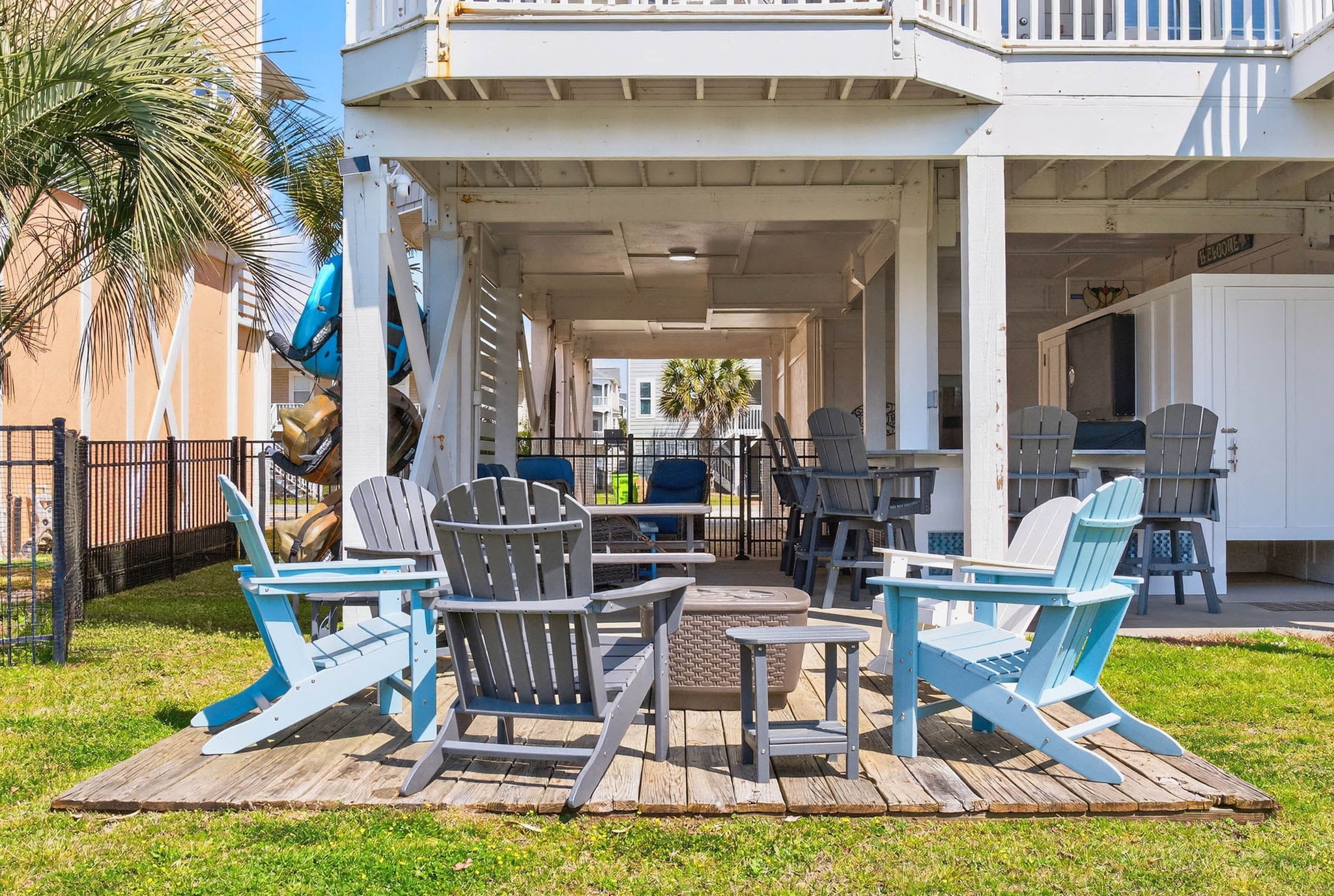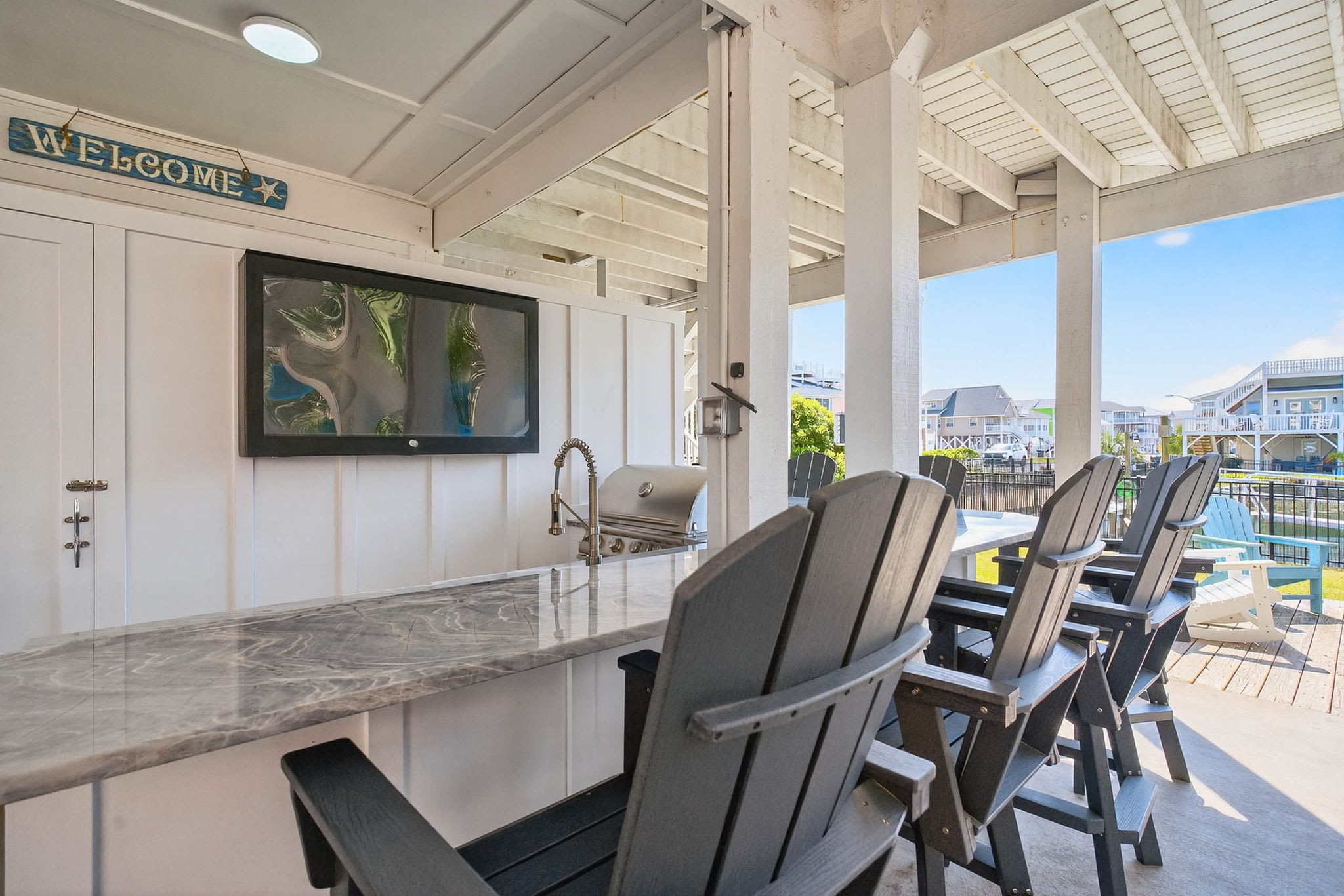 Newly constructed in 2026, there is now a beautiful spacious bar area under the house deck! Beautiful and modern, you will have plenty of room with seating at the bar, a sitting area, a picnic table, and even more seats in the backyard. Complete with a TV, refrigerator, sink and new Blaze grill - you have all the perfect ingredients for families and friends to spread out and enjoy themselves! And even better - there is a full bathroom adjoining it too, offering convenience while relaxing as well as being able to easily rinse off from the beach.