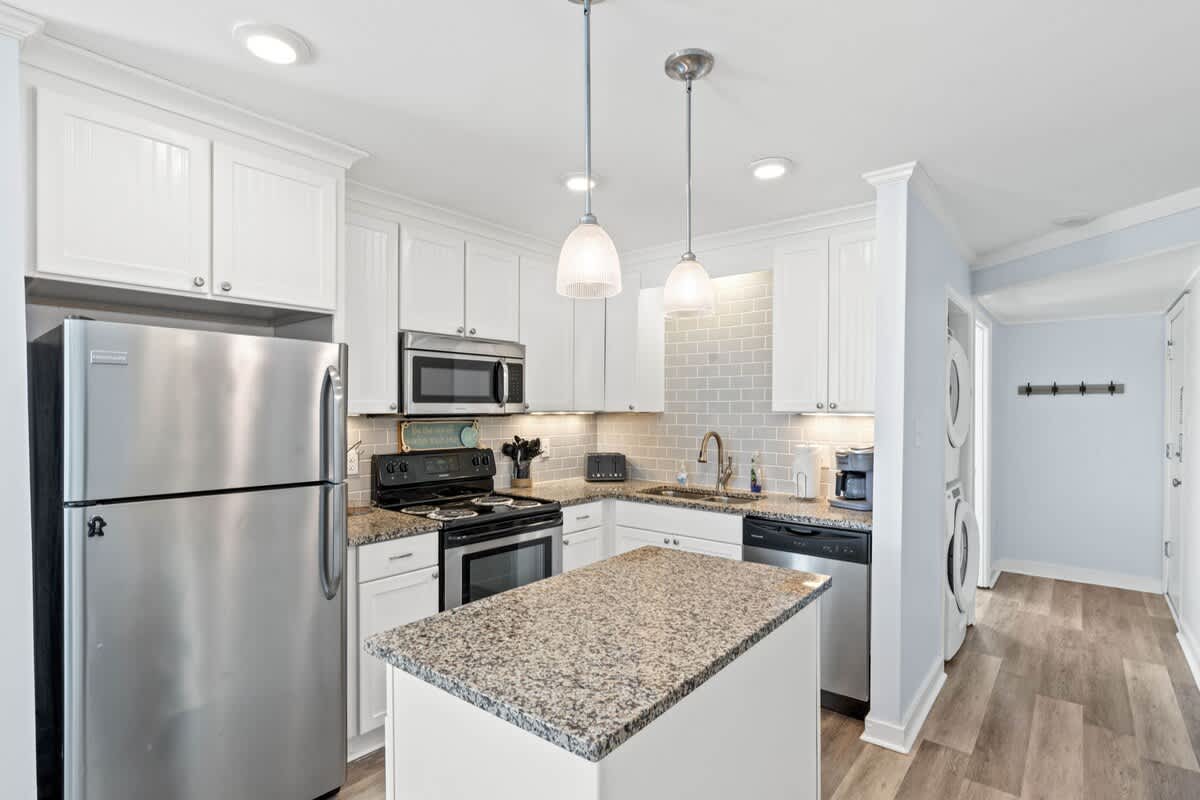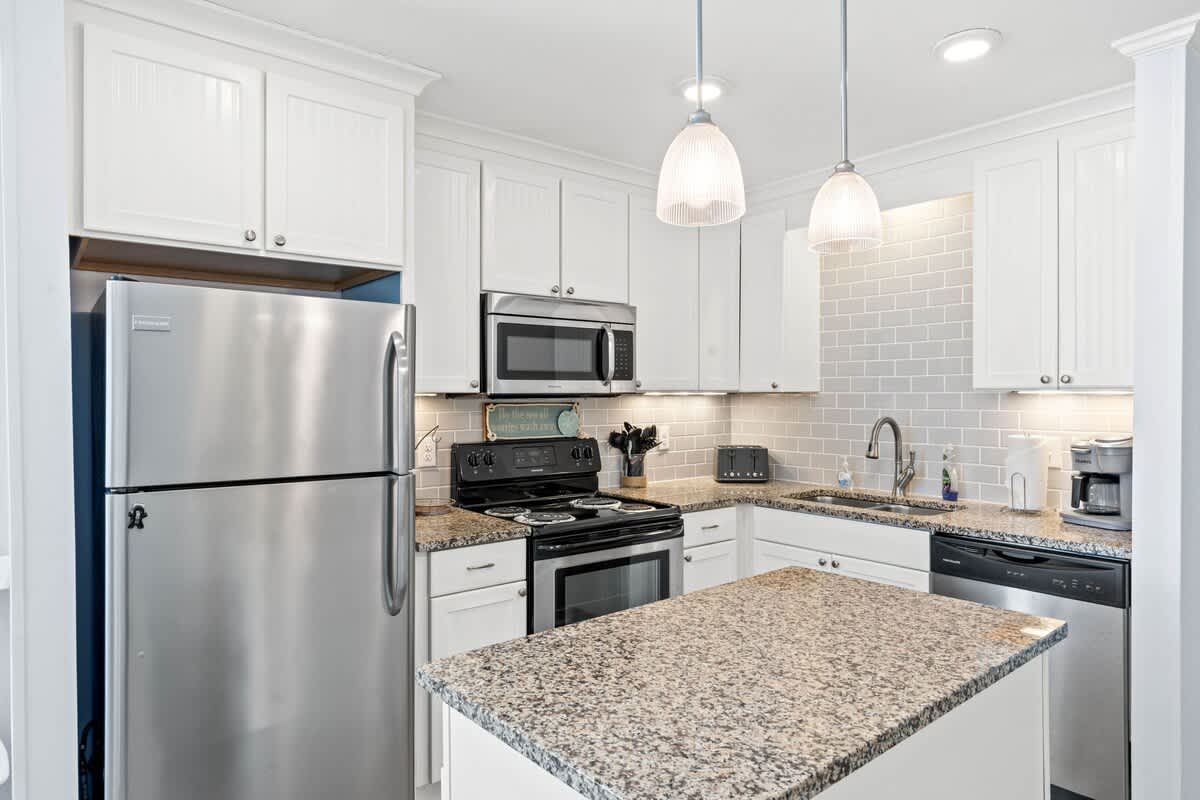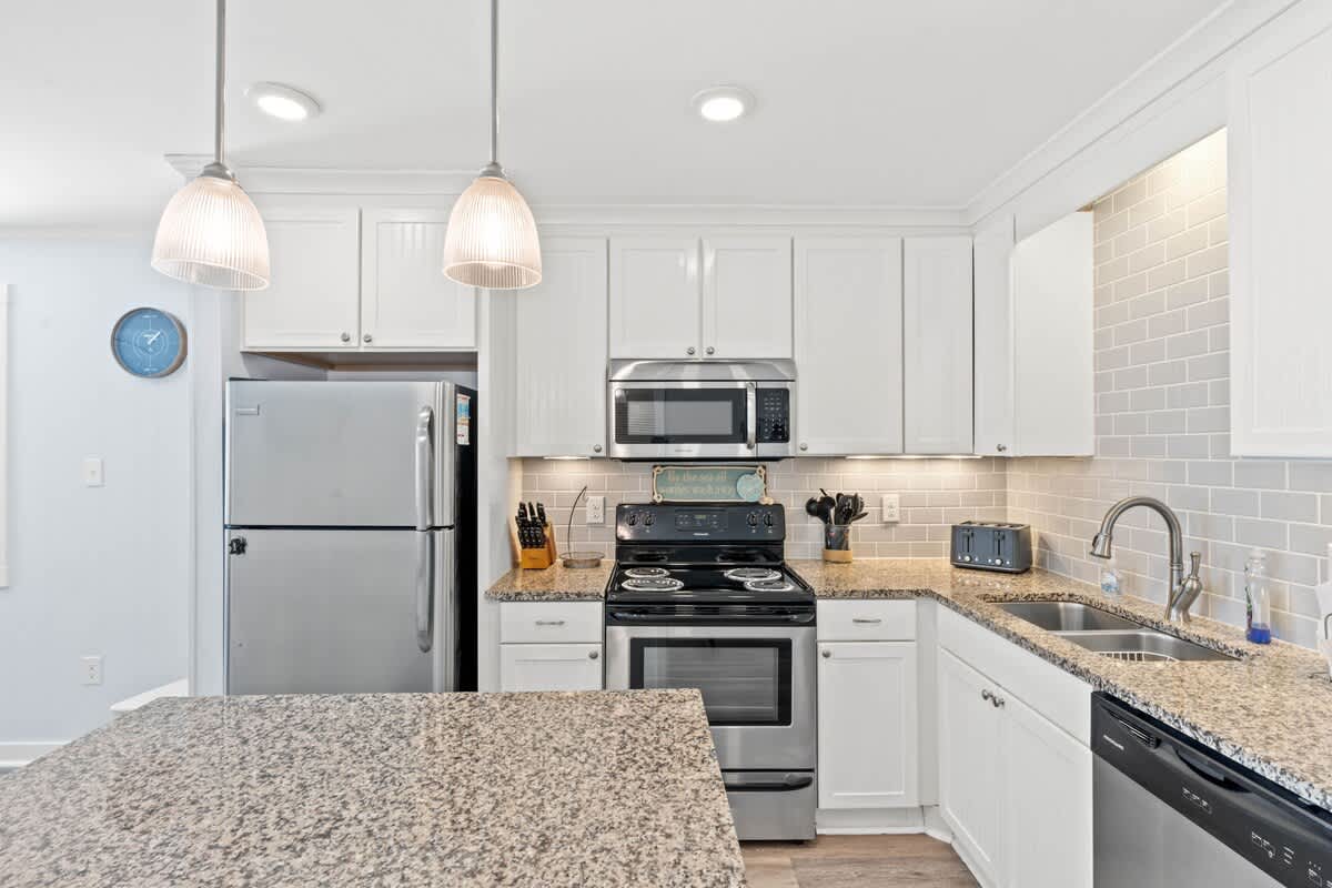The kitchen has granite countertops with a subway tile backsplash, an island for extra counter space, and tall white cabinets that run up to the ceiling. There are plenty of kitchen amenities to help you feel more at home including a Keurig combination coffee maker (make an individual cup or a whole pot), toaster, blender, hand mixer, lots of pots & pans of various sizes, baking trays, crock pot, and Tupperware. The kitchen table seats 6 and there are 2 extra seats if needed.