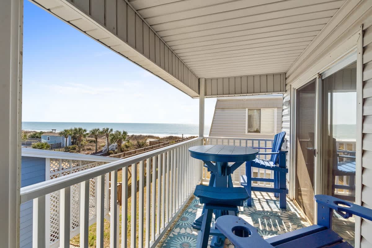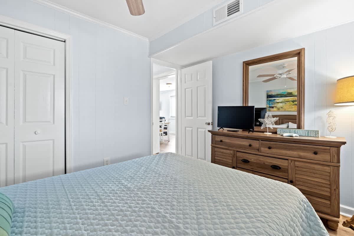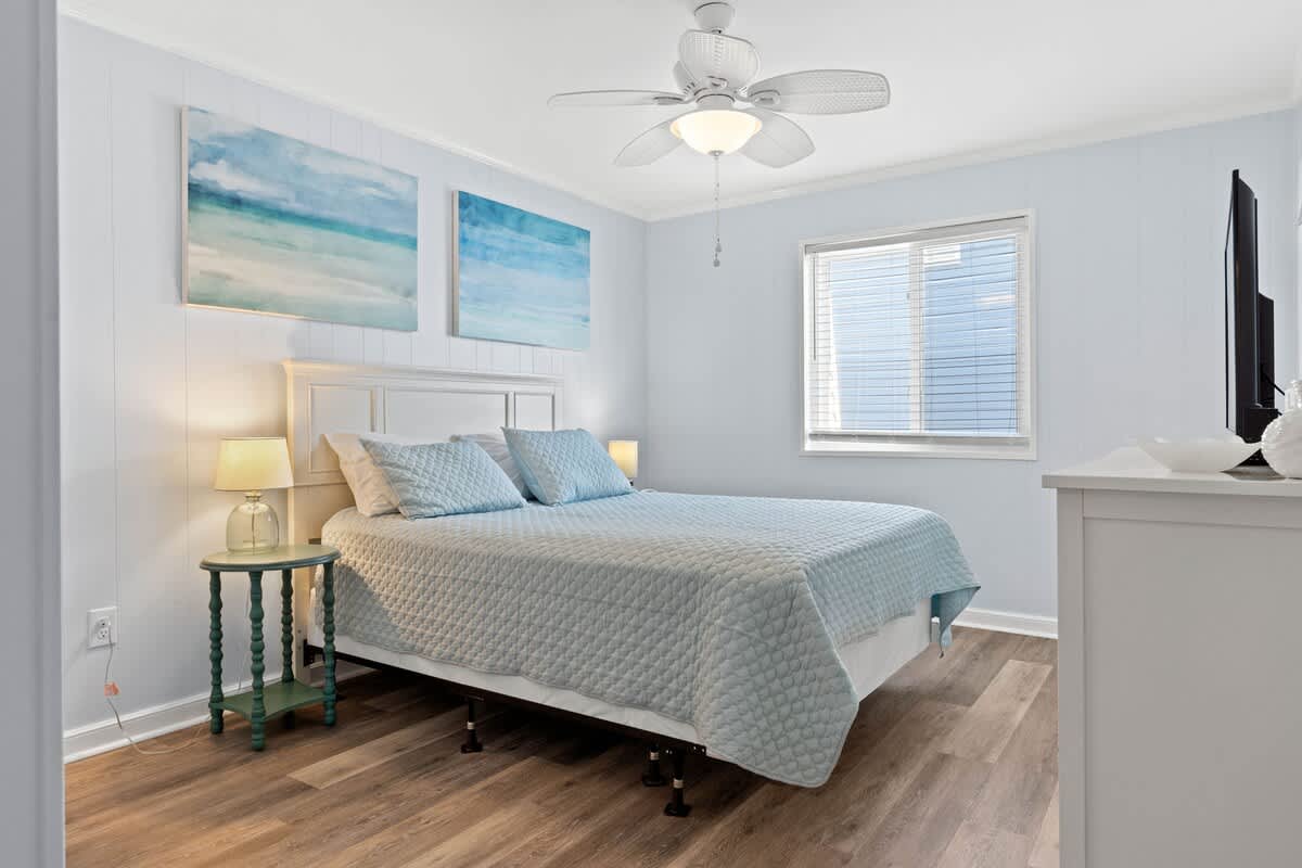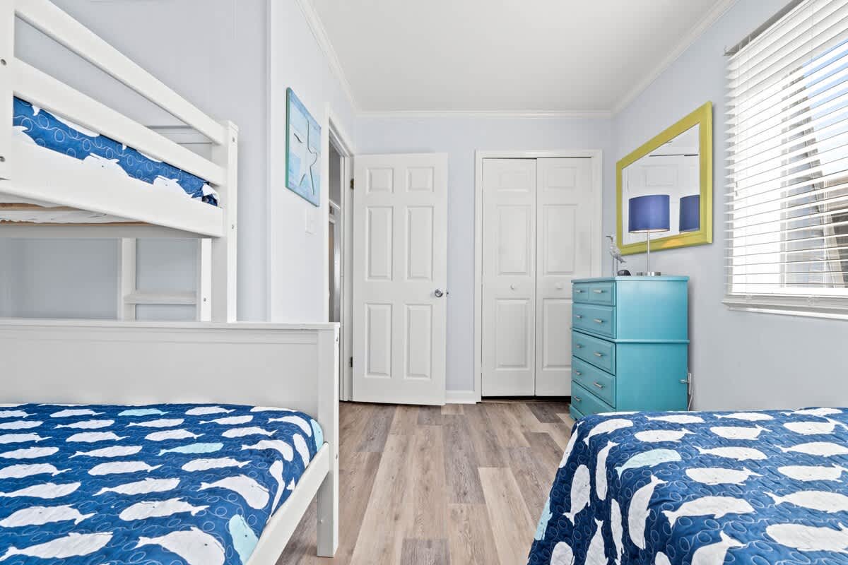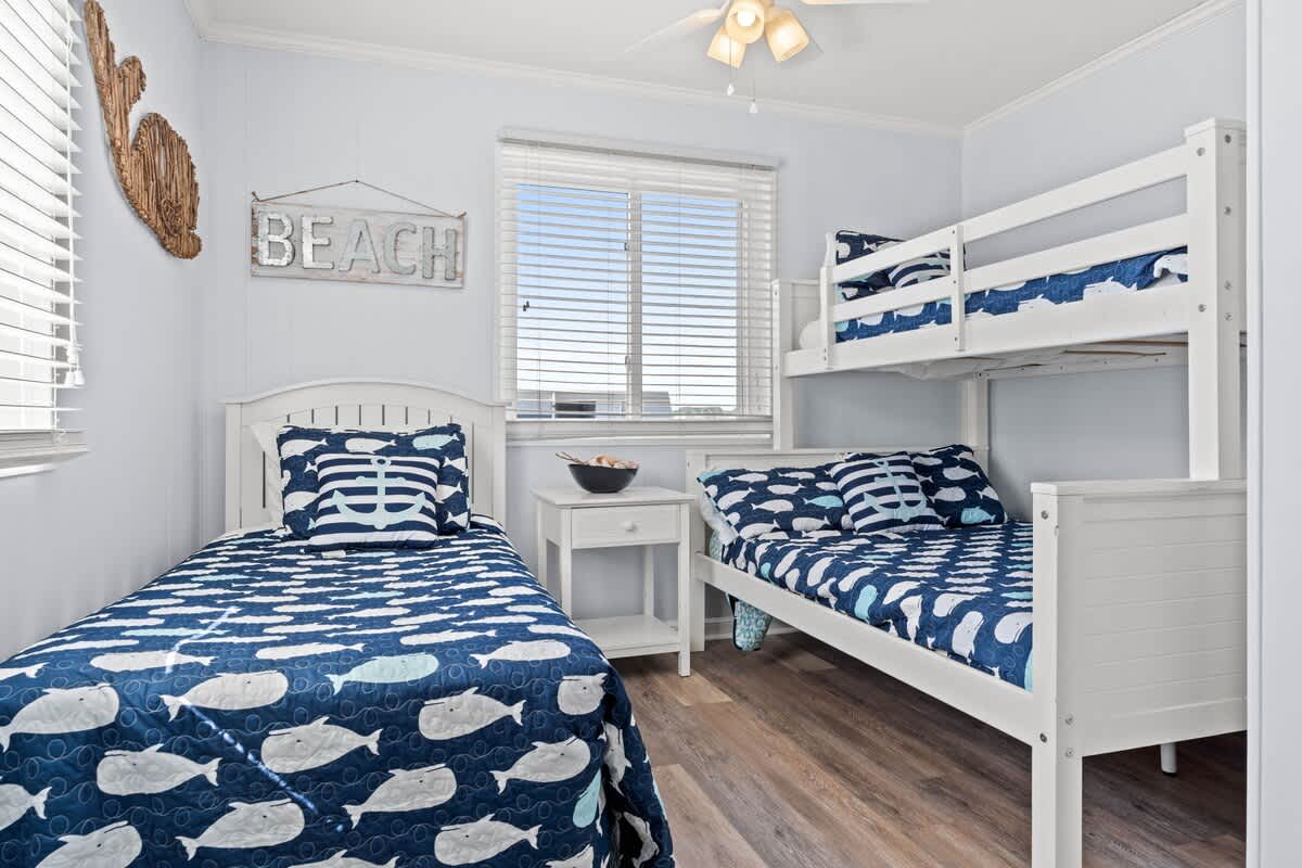 I'll Beach There For You has 3 bedrooms and 2 bathrooms, offers keyless entry and is just steps from the beach! The “bunk” room has a single twin and a bunk bed with a twin over a queen. This bedroom lets in an abundance of natural light and has a smart TV. The 2nd bedroom has a queen-sized bed and is located just down the hall from the primary bedroom. The primary bedroom has a queen-sized bed, TV, and back patio access with partial ocean views! The 2 identical full bathrooms are located side by side in the hallway and offer a tub/shower combo.