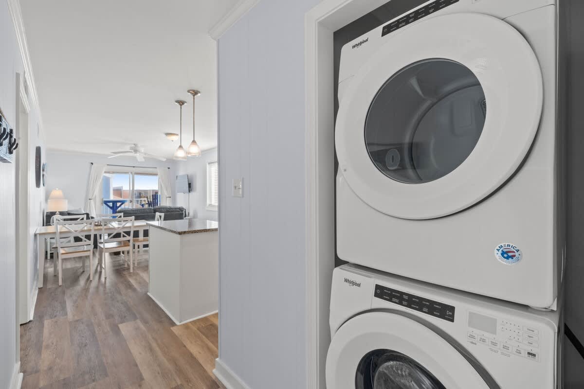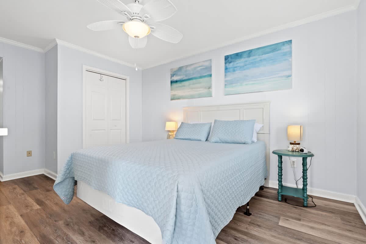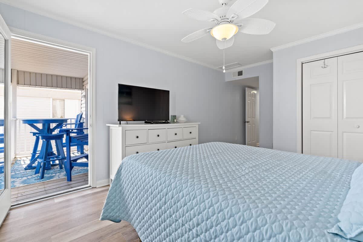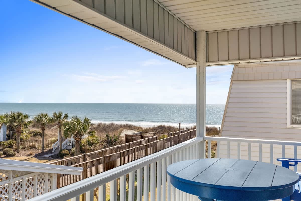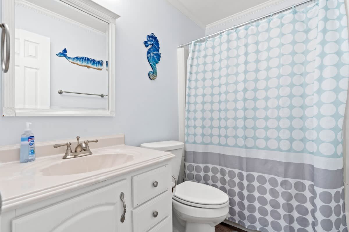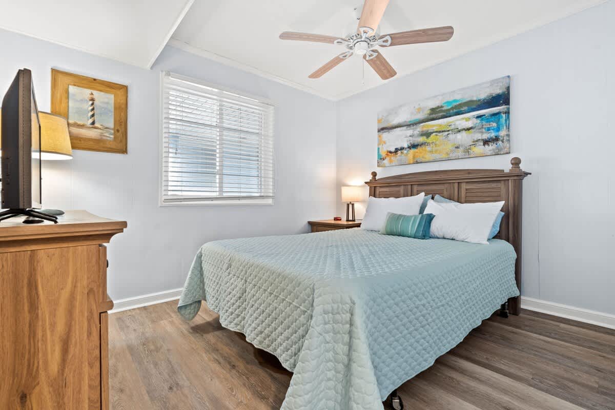 I'll Beach There For You has 3 bedrooms and 2 bathrooms, offers keyless entry and is just steps from the beach! The “bunk” room has a single twin and a bunk bed with a twin over a queen. This bedroom lets in an abundance of natural light and has a smart TV. The 2nd bedroom has a queen-sized bed and is located just down the hall from the primary bedroom. The primary bedroom has a queen-sized bed, TV, and back patio access with partial ocean views! The 2 identical full bathrooms are located side by side in the hallway and offer a tub/shower combo.