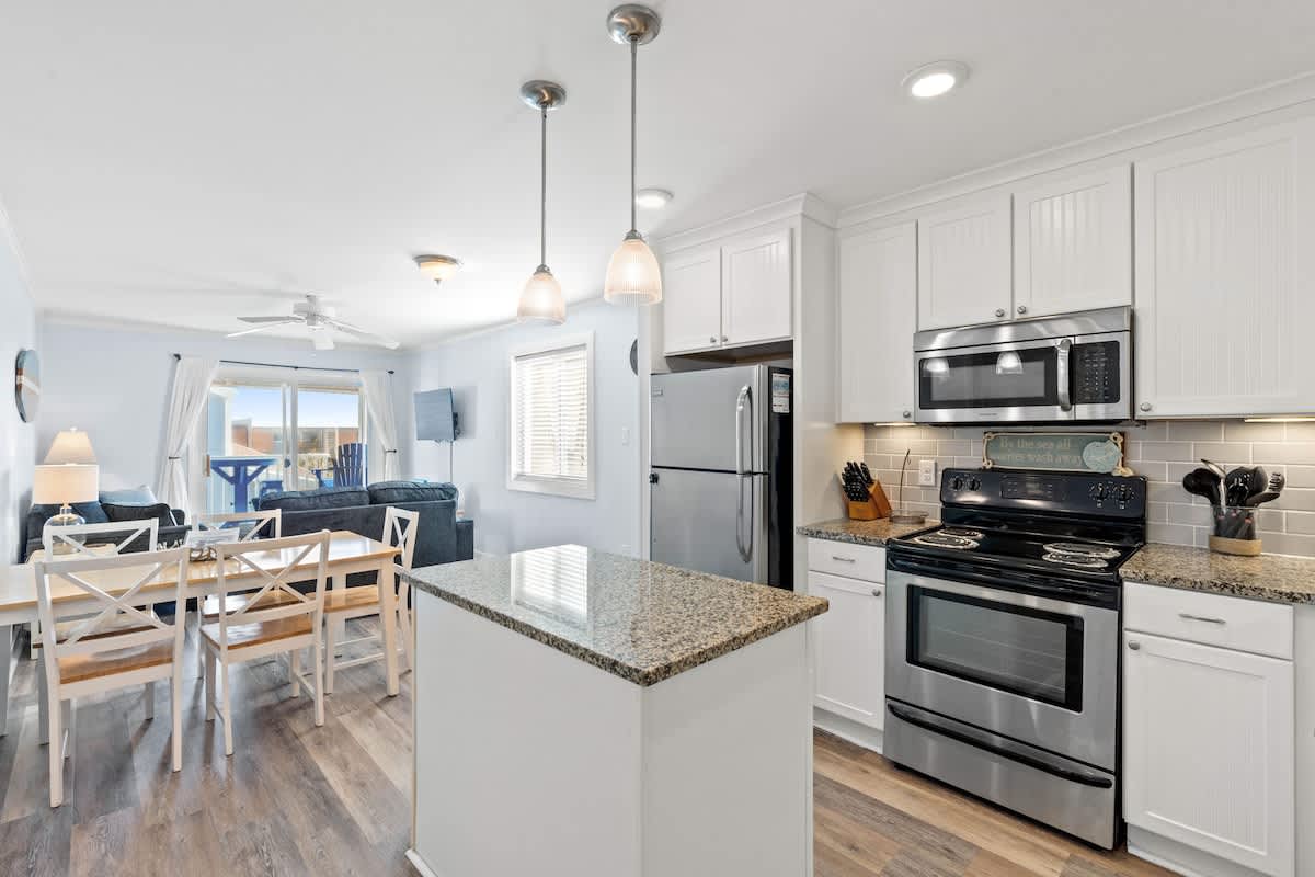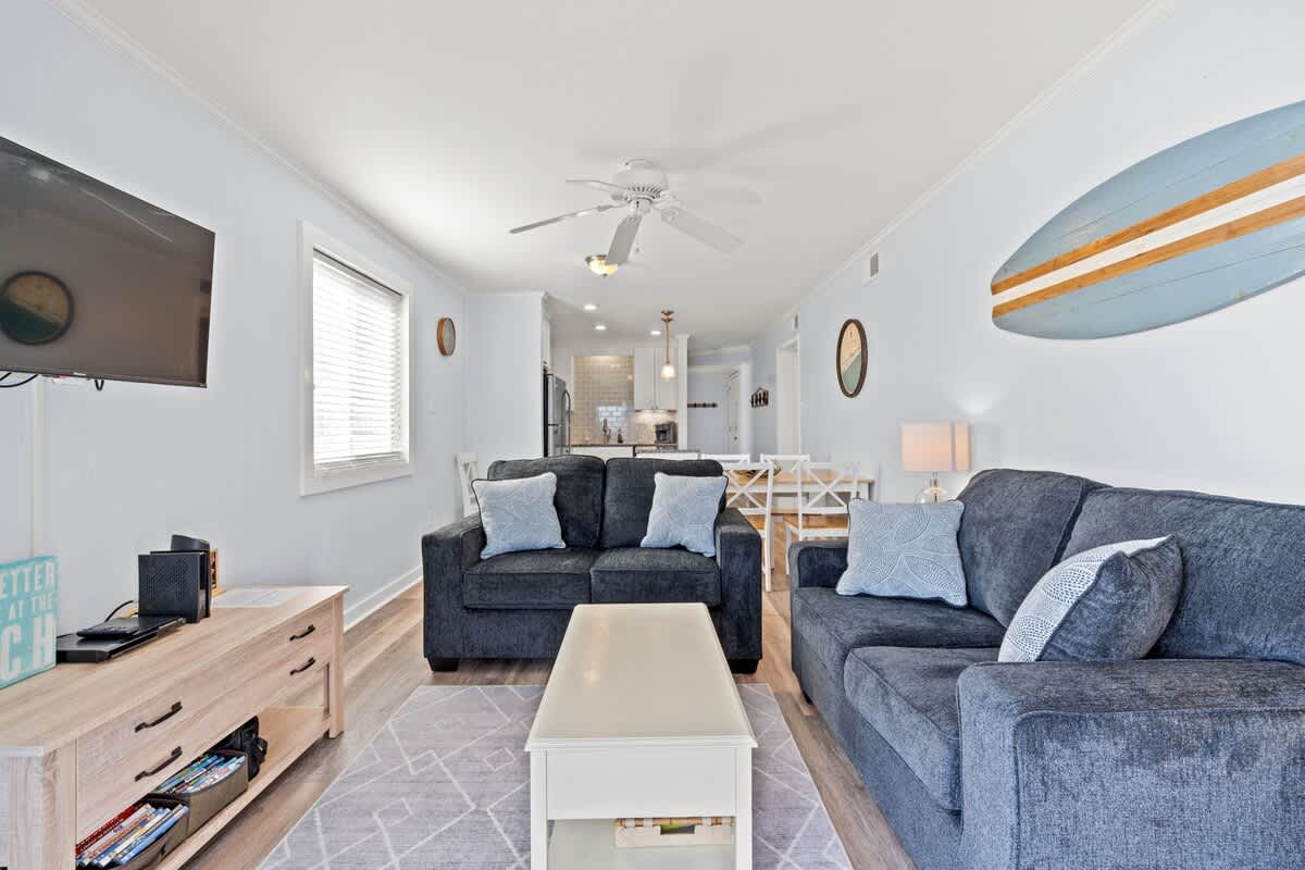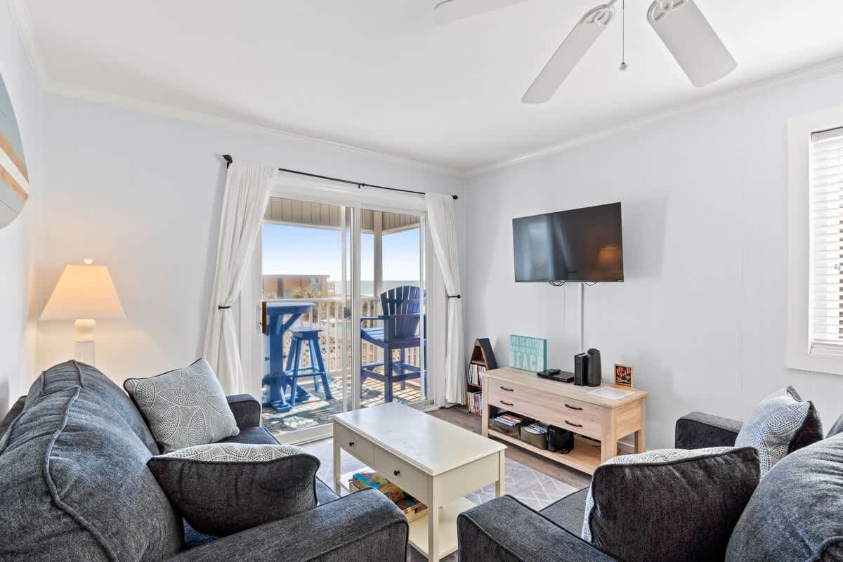 The living room has a comfy beach-themed couch, a smart TV with cable, and a DVD player. There is also a large sliding glass door to enter the patio with ocean views. There are tons of games and puzzles for the whole family to enjoy during your stay. There is also a pack-and-play crib and a high chair to make packing a little bit easier!