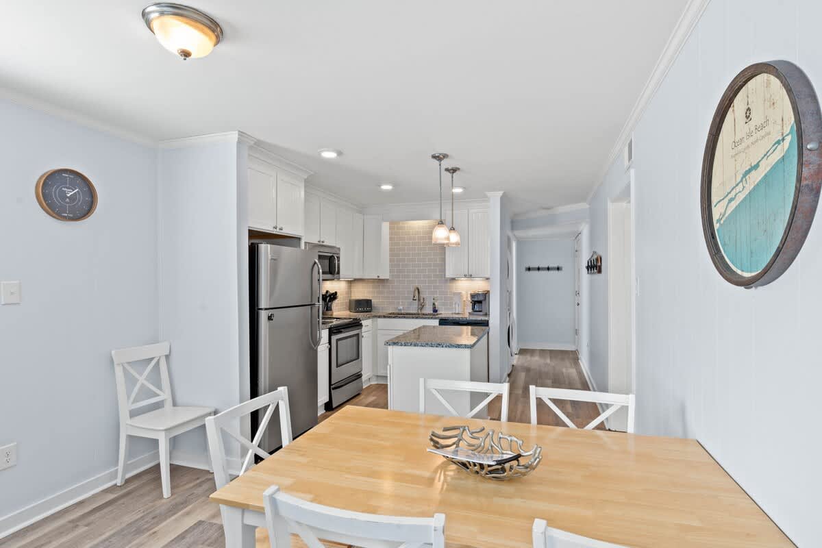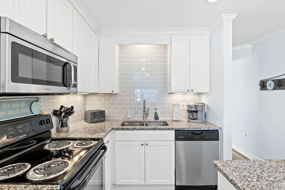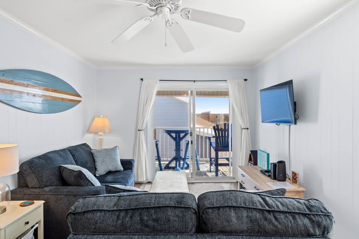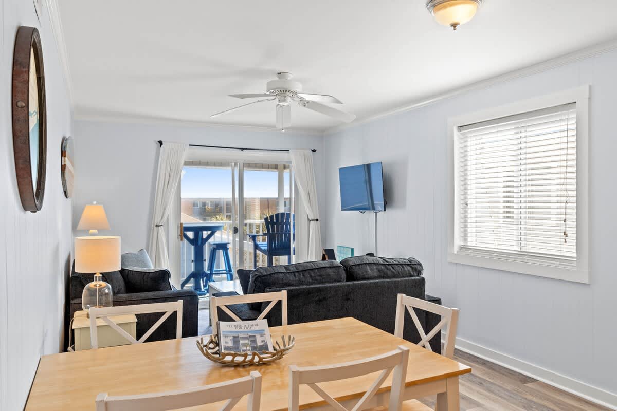 The living room has a comfy beach-themed couch, a smart TV with cable, and a DVD player. There is also a large sliding glass door to enter the patio with ocean views. There are tons of games and puzzles for the whole family to enjoy during your stay. There is also a pack-and-play crib and a high chair to make packing a little bit easier!