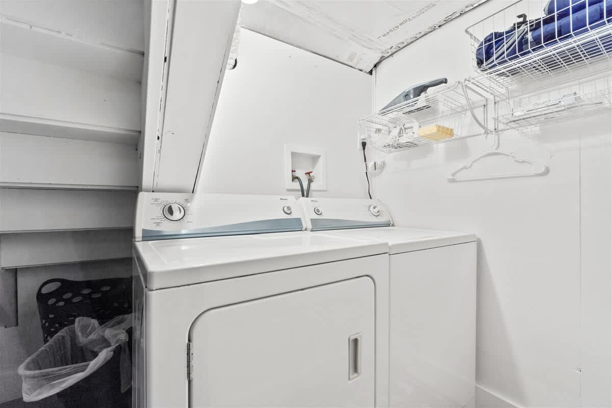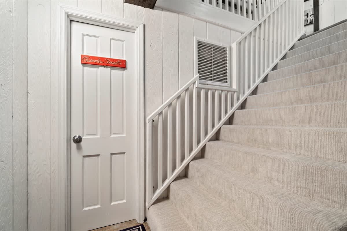 Enter Jay's Nest on the ground floor where the laundry room is located under the stairs with a washer and dryer, iron and ironing board. Climb the stairs to the first floor to find a large open floorplan where the kitchen, dining and living room all come together. The whole home is freshly painted including the kitchen cabinets. The kitchen, with stainless steel appliances comes fully stocked with a microwave, oven and stove-top, refrigerator, drip coffee maker, tea kettle, mixer, blender, toaster, plenty of plates, cookware, utensils and glassware. The new dining room table offers seating for eight, as well as seating for 4 around the kitchen island. The living room, which is newly and tastefully furnished has a leather couch and love seat which centers around a large flat-screen TV equipped with a DVD player and comes with TONS of DVD's to choose from. The great thing about this home's layout is that no matter if you're relaxing in the living room, eating in the dining room or cooking in the kitchen, you and your family will all be together!