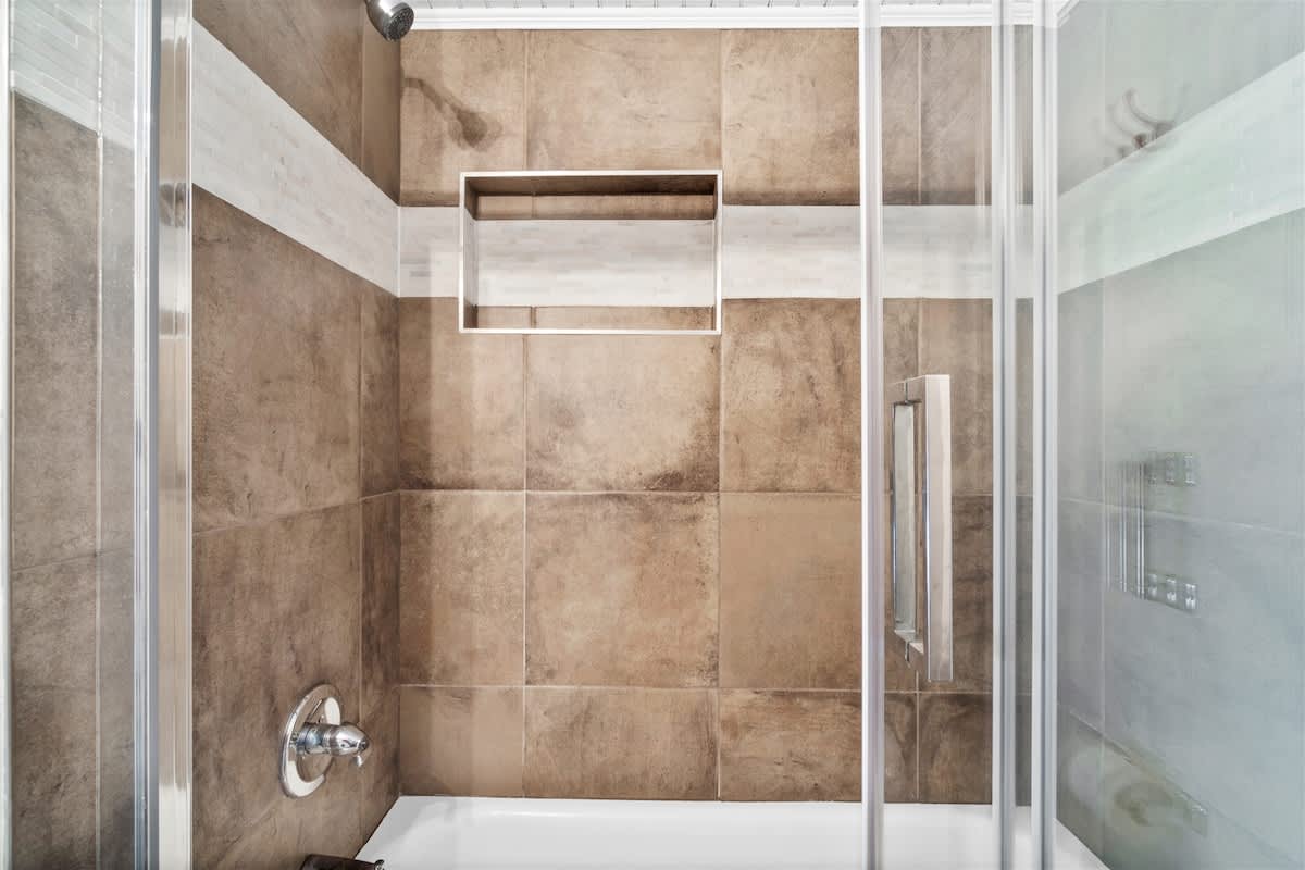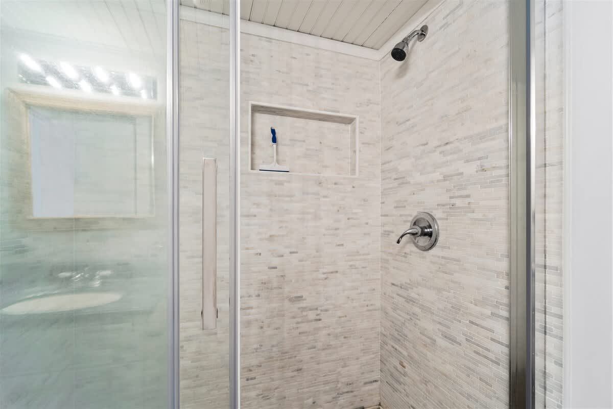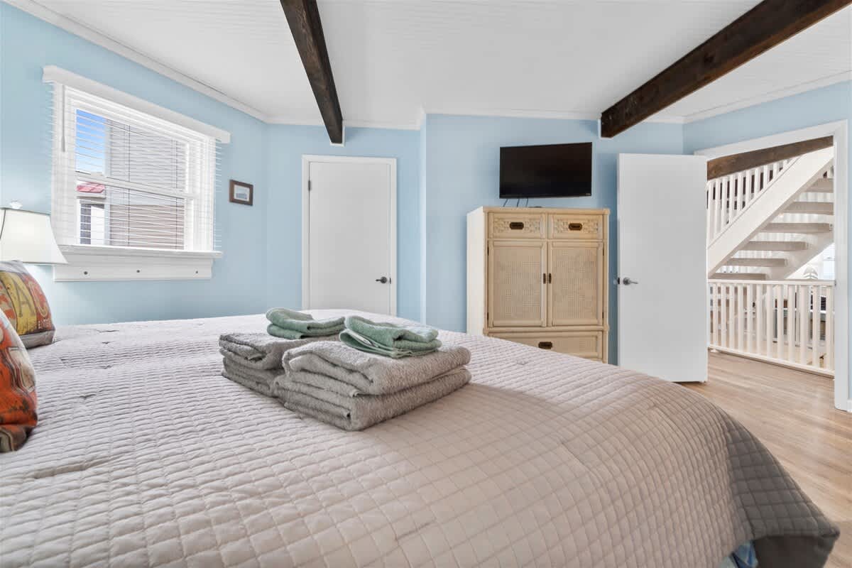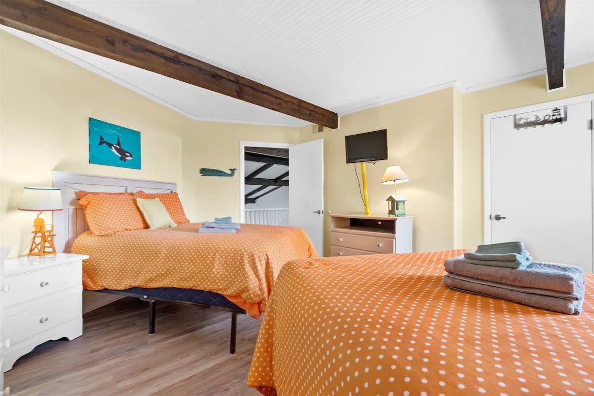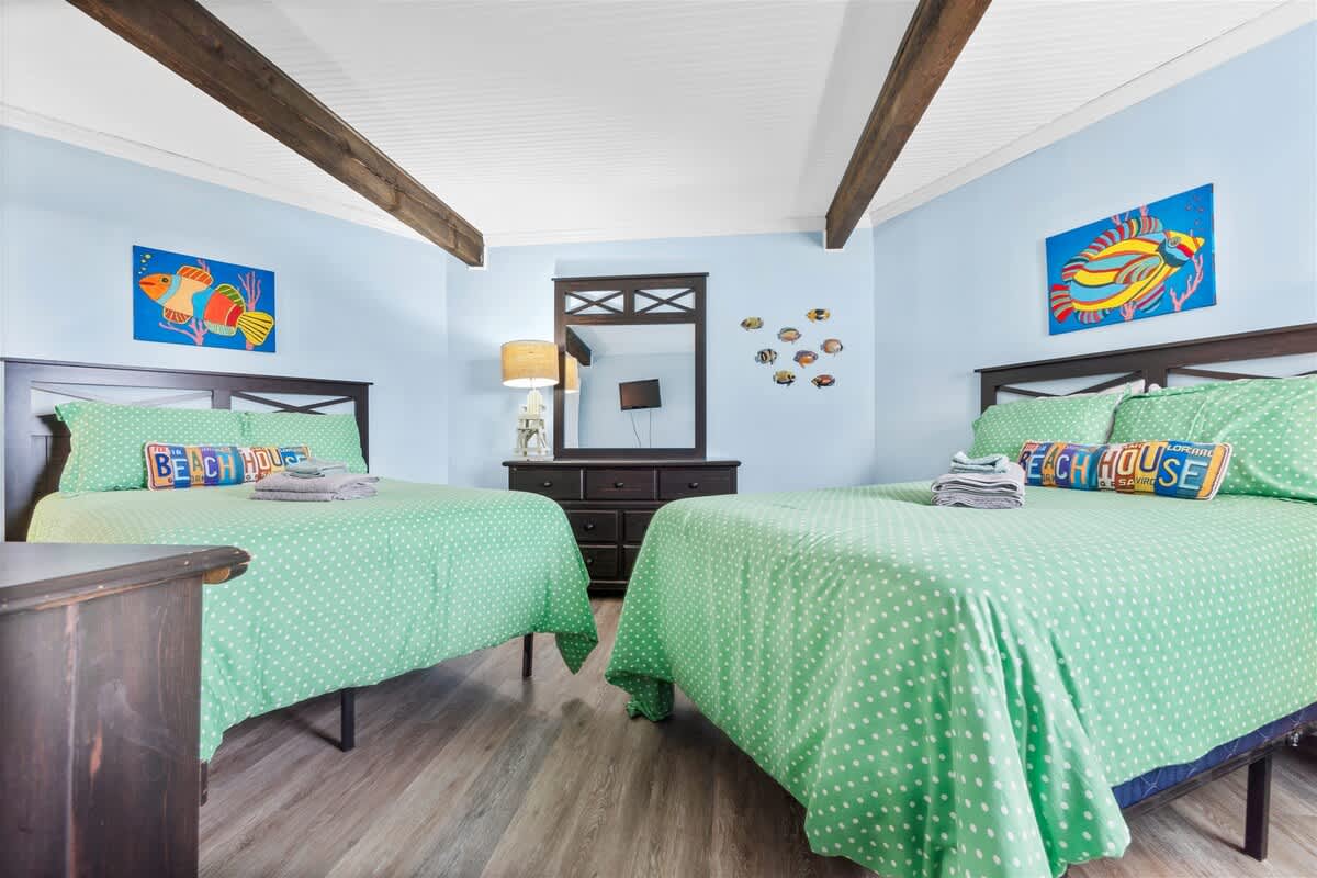 There are two bedrooms located on the first floor, one with a King bed and the other with a Queen bed. There is a full bathroom with a stand-alone shower located in between these two bedrooms, only accessible from the hallway. Climb the stairs to the second floor, where you will find two additional bedrooms, both containing two Double beds. The second full bathroom with a shower/tub combo is located between these two bedrooms, also only accessible from the hallway. All four bedrooms have small flat-screen TV's, closets with plenty of hangers, and stand-up fans.
