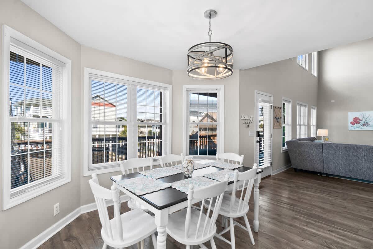 The open-concept living and dining area is perfect for gathering, with seating for 6 at the dining table and 6 more at the island. Whether you're enjoying a home-cooked meal or playing board games from the family room entertainment center, there’s plenty of space for everyone.