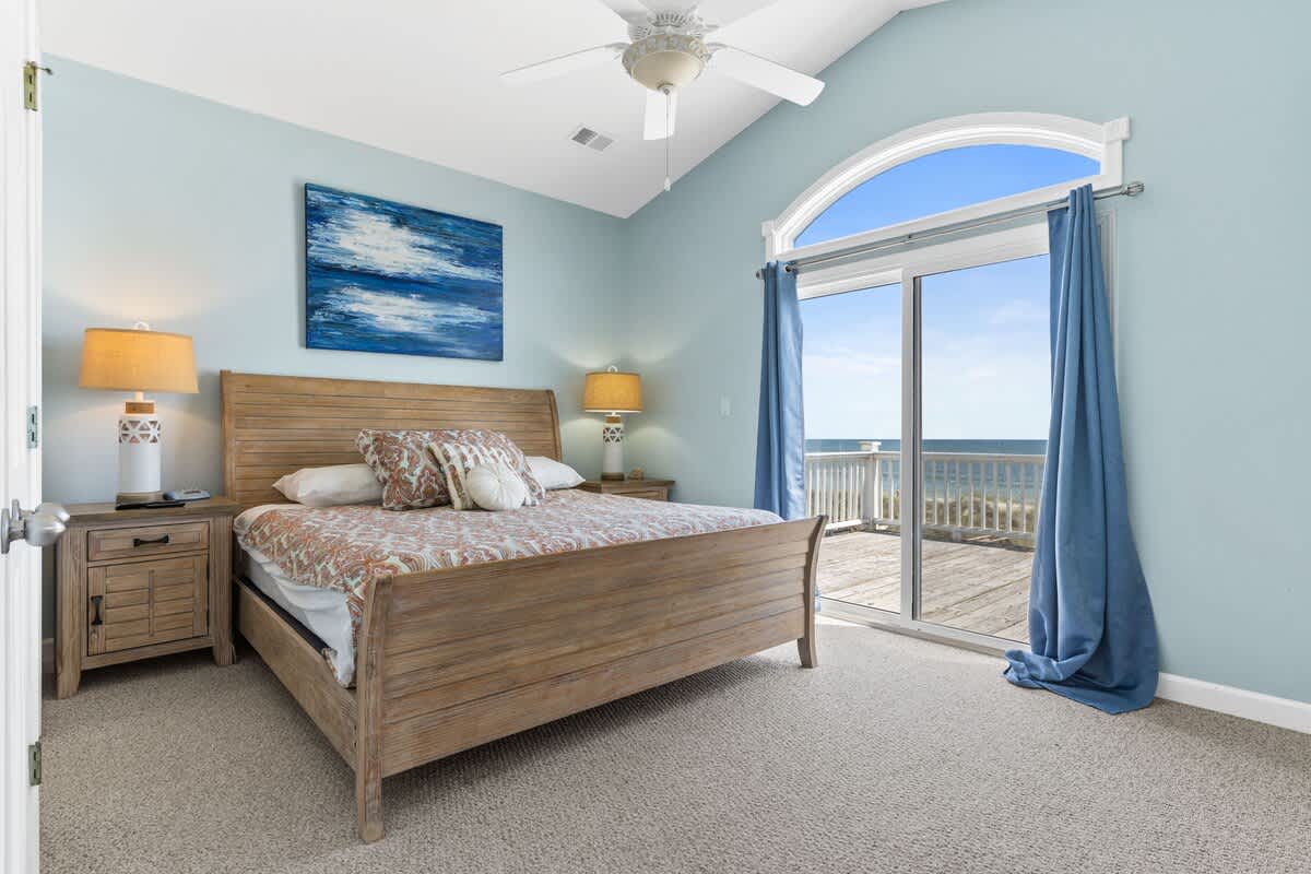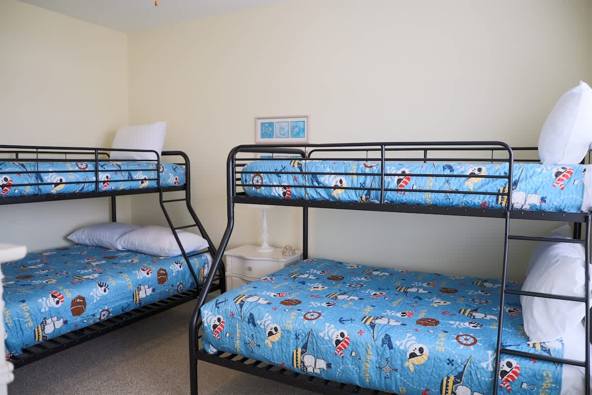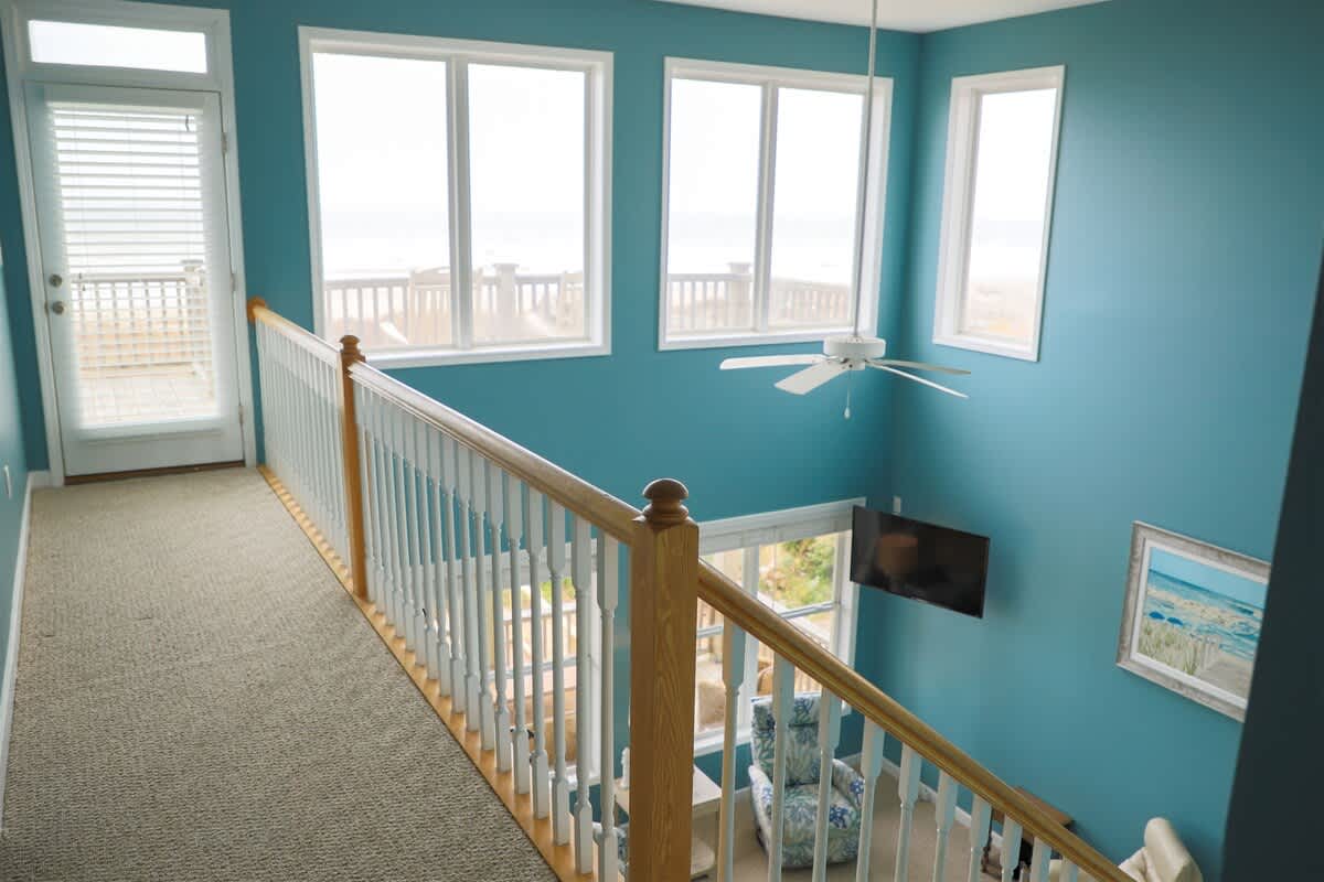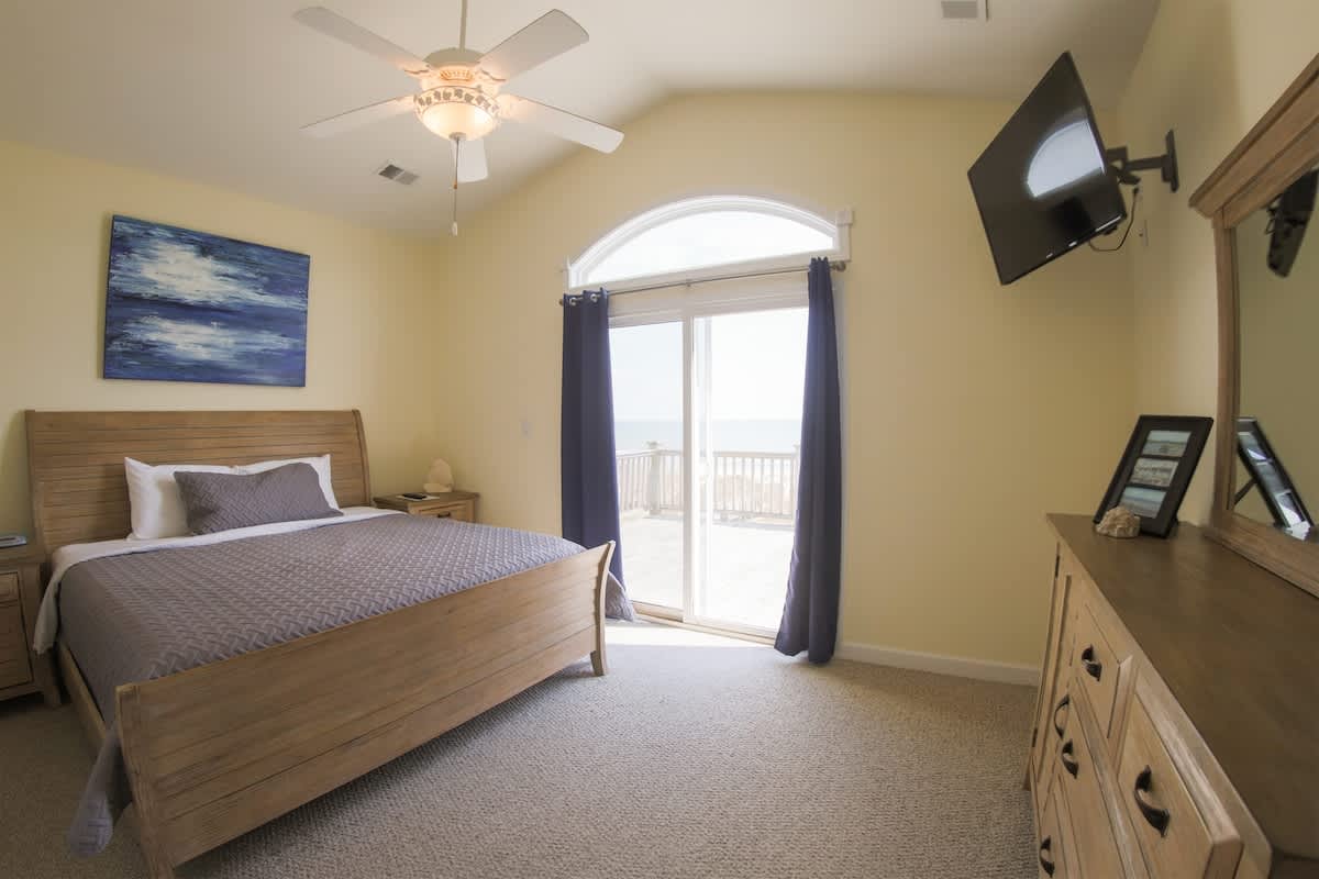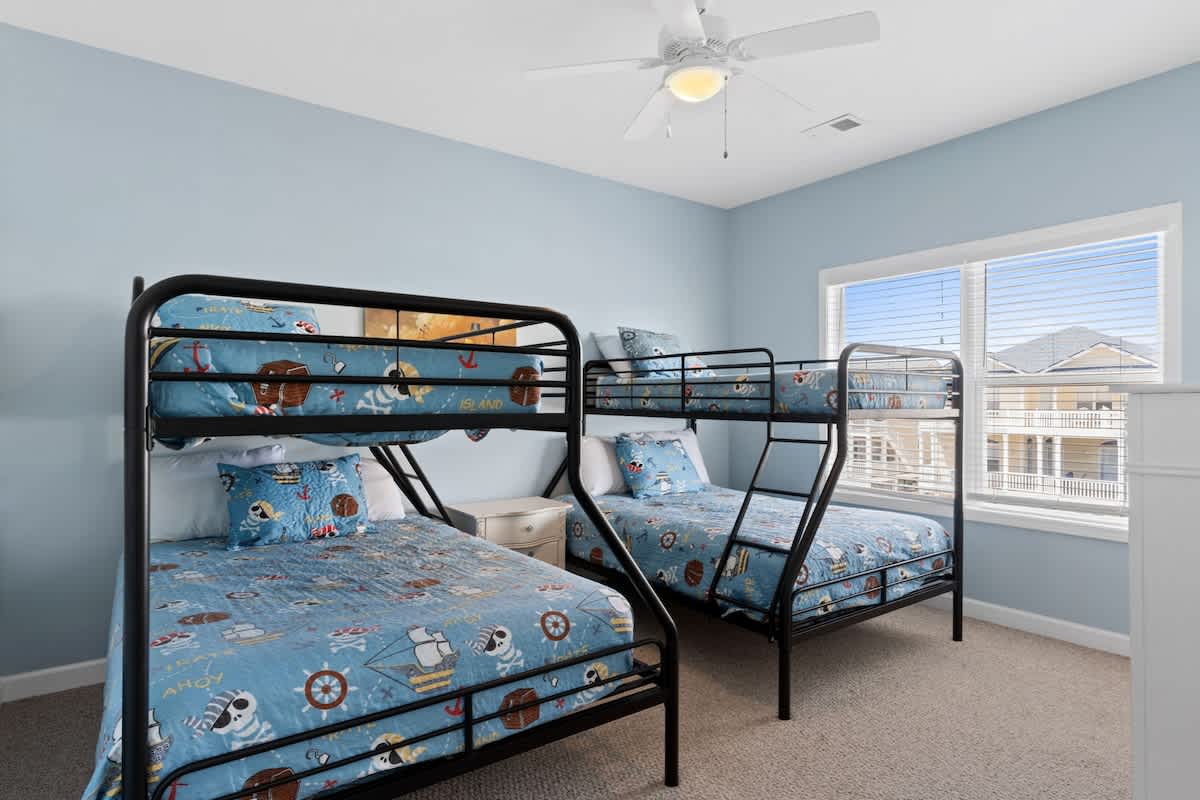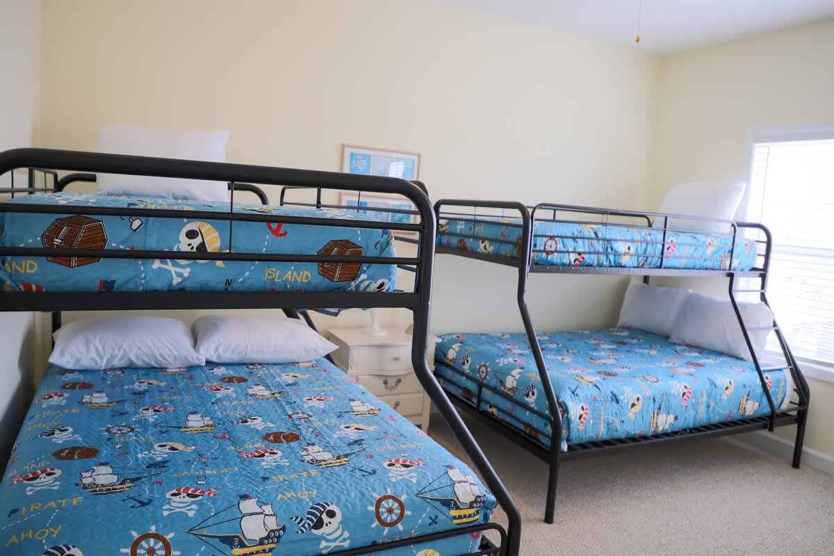 Upstairs you will find the tastefully re-decorated master suite which has a king bed and offers gorgeous ocean views from the sliding glass door as well as access to the upper deck with new deck furniture. The street-side bedrooms include one room with a queen bed and another featuring 2 sets of bunk beds, full beds on the bottom and twin beds on top- perfect for kids!