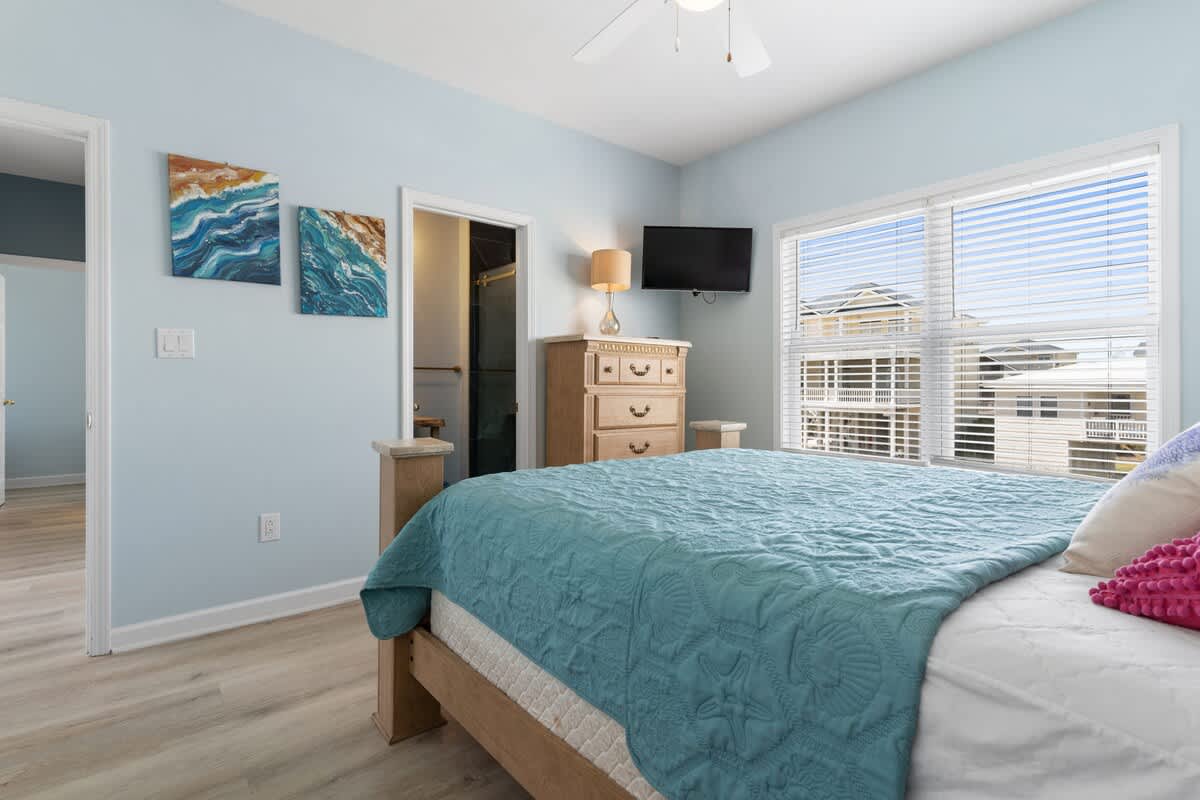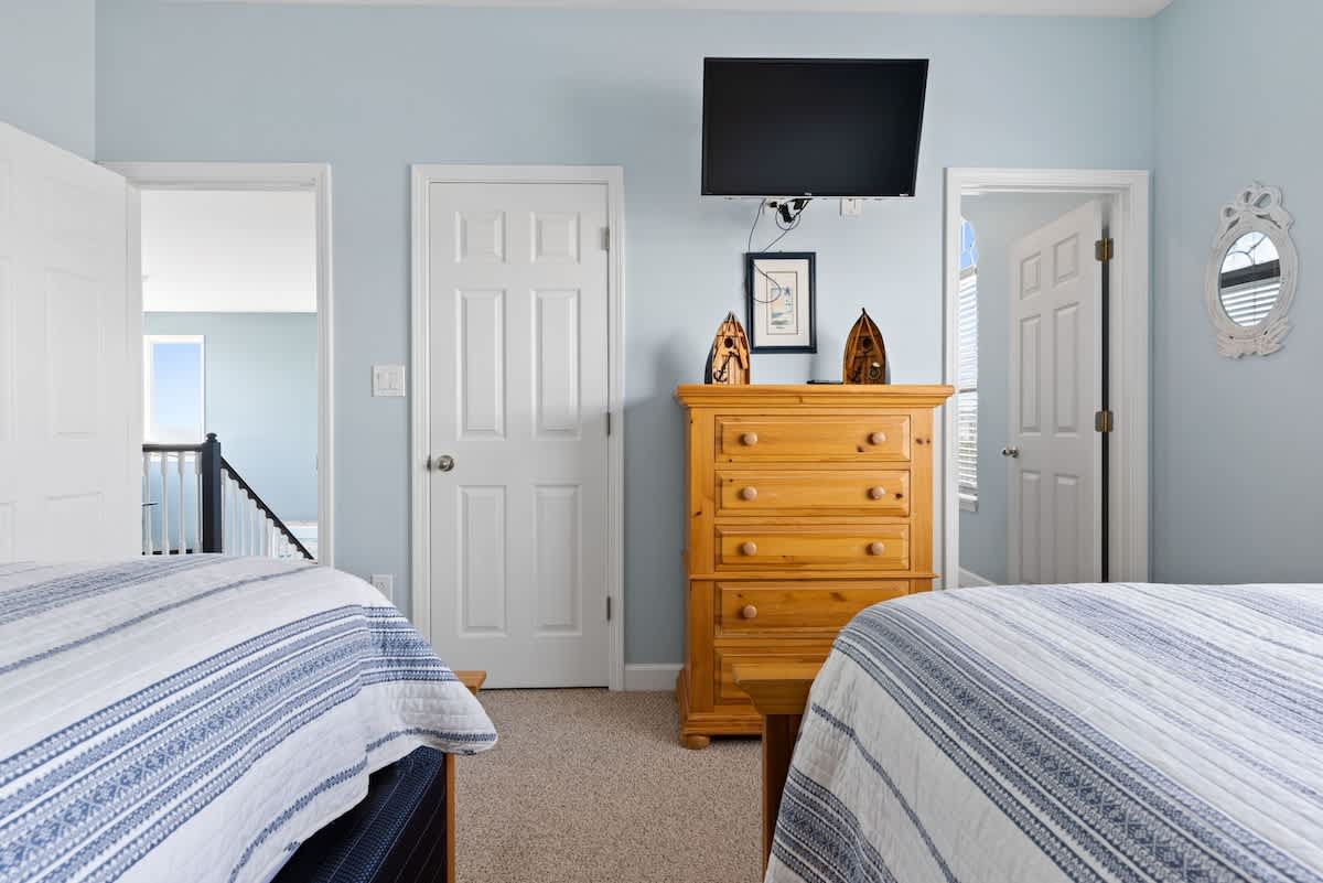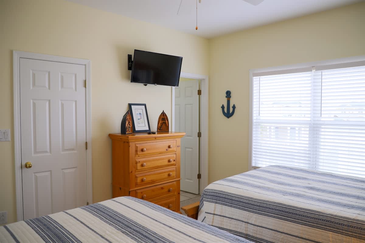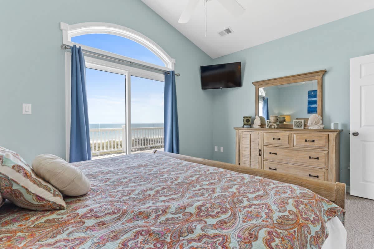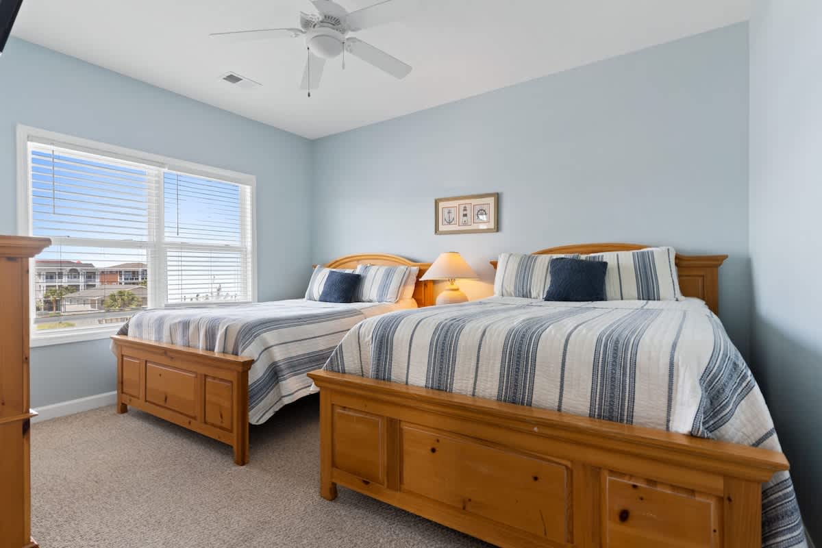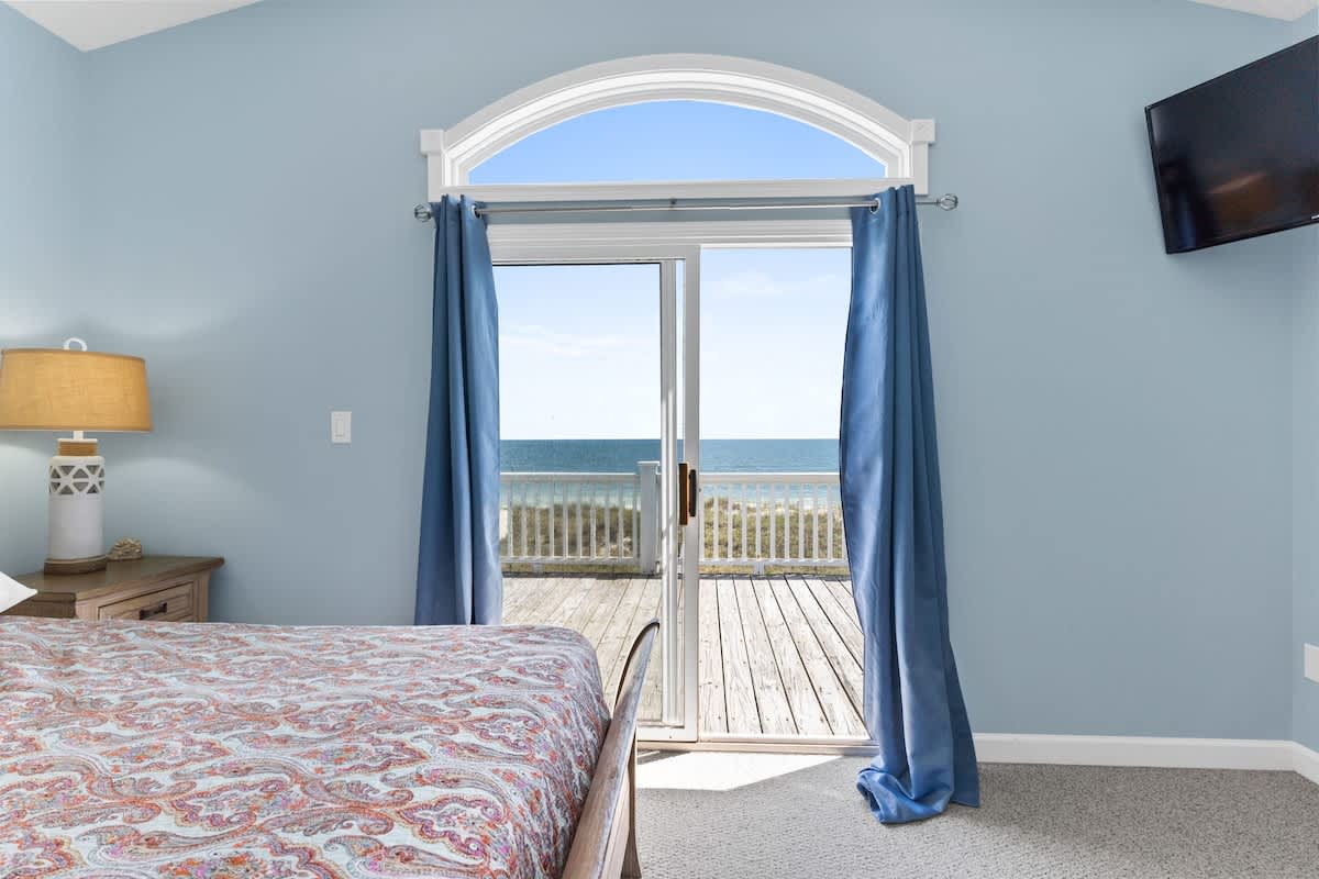 Upstairs you will find the tastefully re-decorated master suite which has a king bed and offers gorgeous ocean views from the sliding glass door as well as access to the upper deck with new deck furniture. The street-side bedrooms include one room with a queen bed and another featuring 2 sets of bunk beds, full beds on the bottom and twin beds on top- perfect for kids!