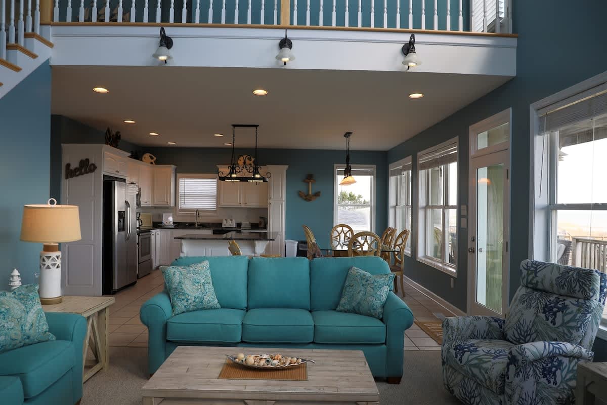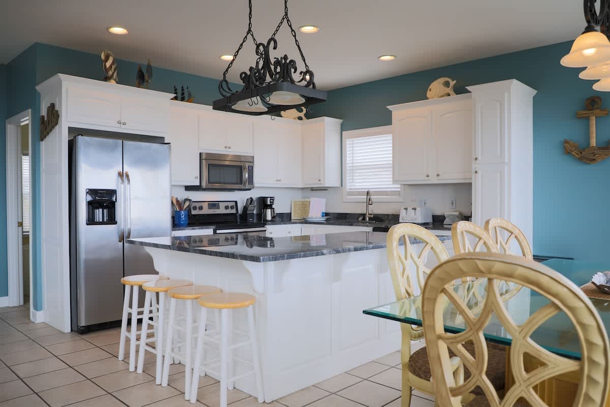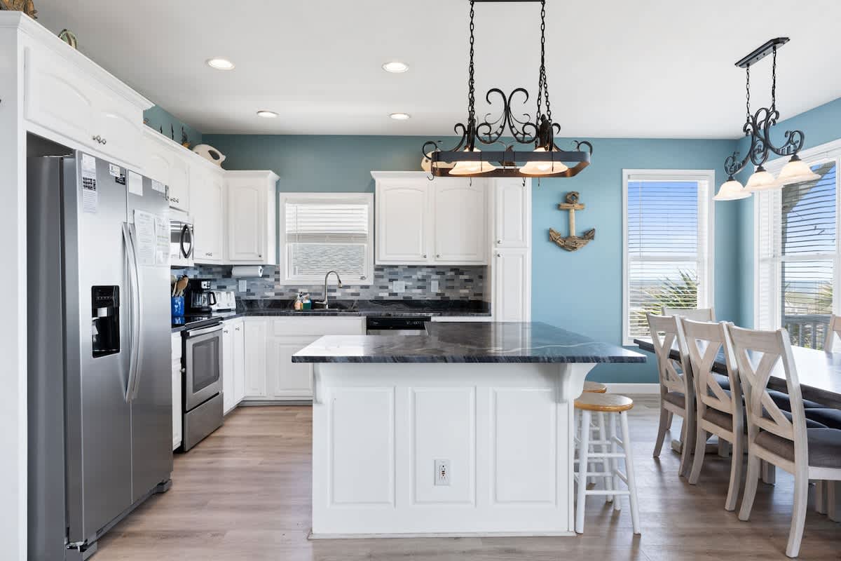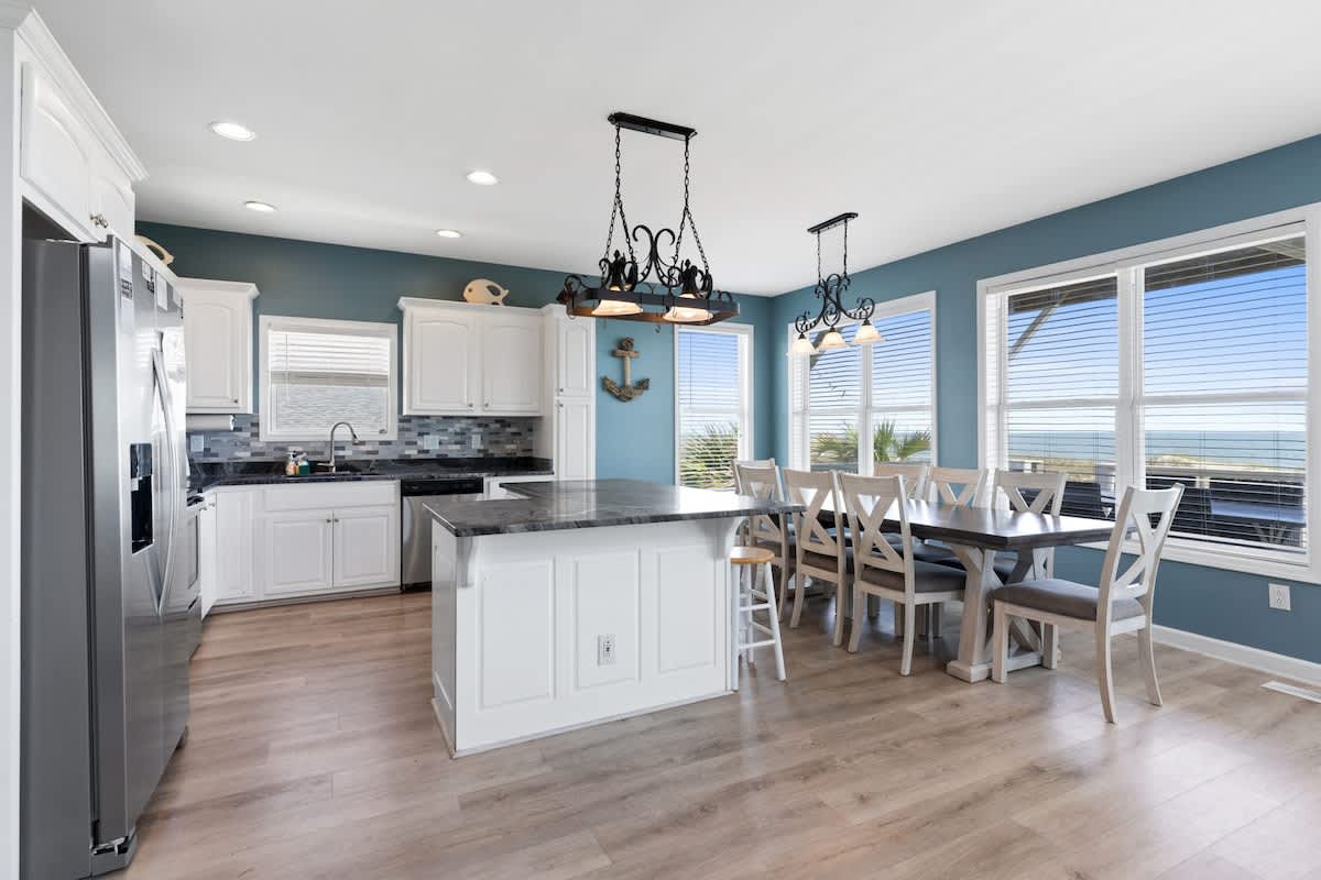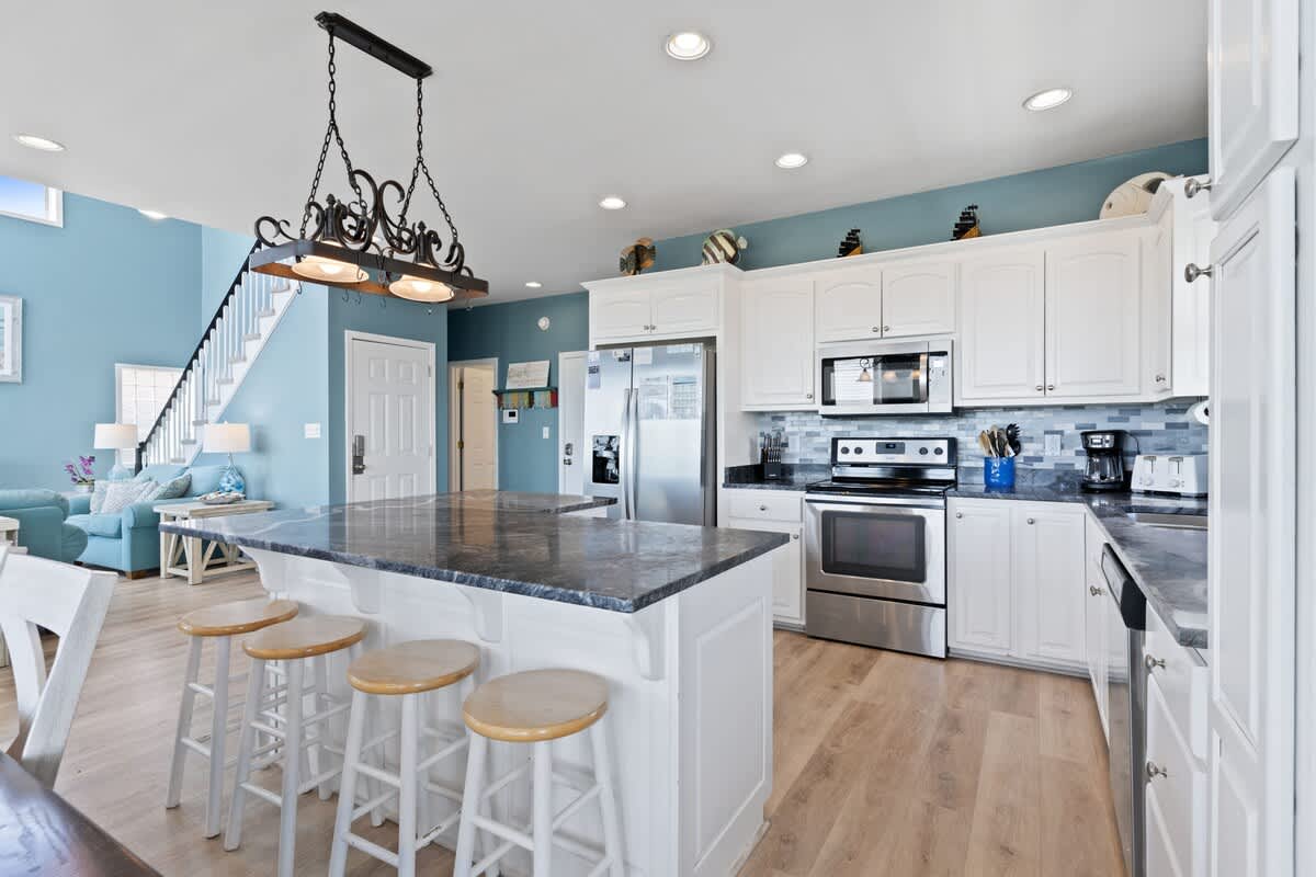 The main level features an open floor plan with the kitchen, living room, and dining room offering lots of windows to let in an abundance of natural light and breathtaking views of the ocean. The newly fully stocked kitchen features stainless steel appliances, a large center island with additional seating and new countertops and lighting. The kitchen amenities include a blender, drip coffee maker, toaster, and mixer. Also on this level are two bedrooms furnished with two queen beds in one and two full beds in the other.