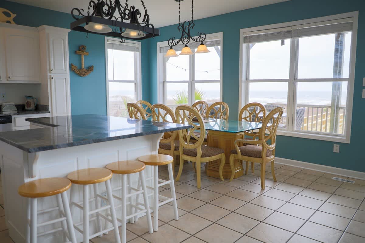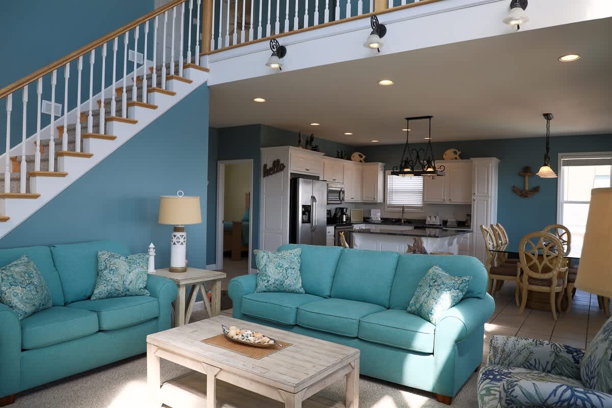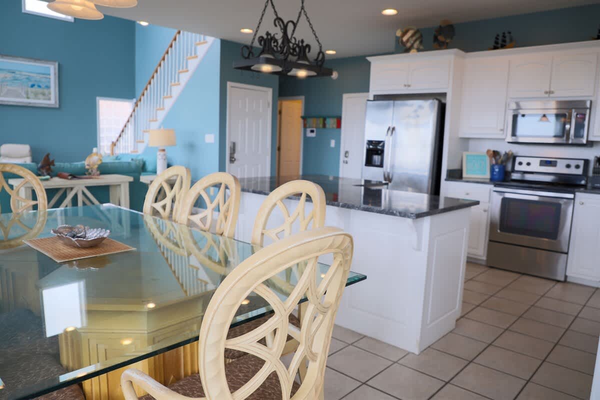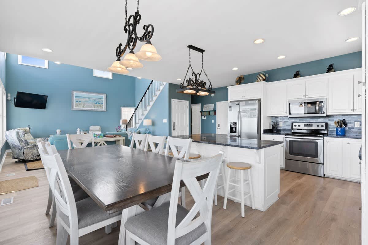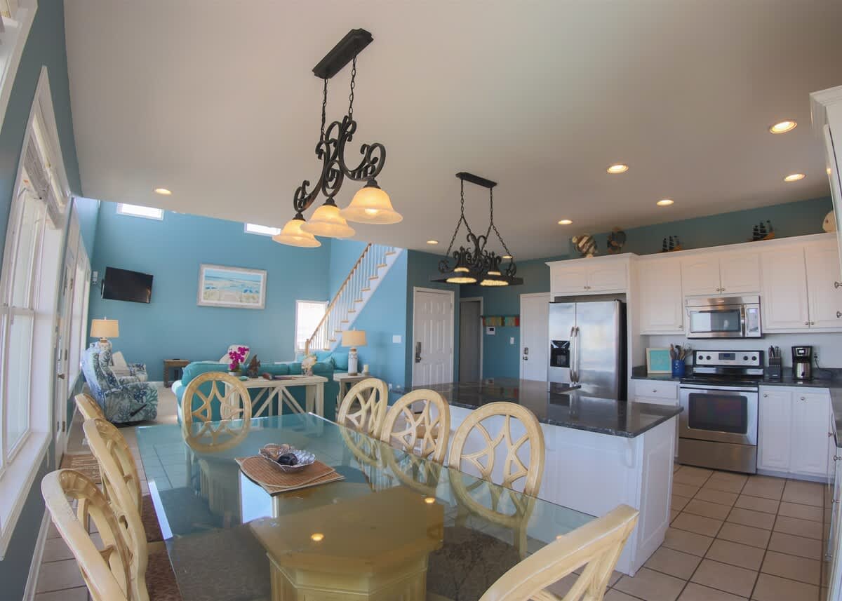 The main level features an open floor plan with the kitchen, living room, and dining room offering lots of windows to let in an abundance of natural light and breathtaking views of the ocean. The newly fully stocked kitchen features stainless steel appliances, a large center island with additional seating and new countertops and lighting. The kitchen amenities include a blender, drip coffee maker, toaster, and mixer. Also on this level are two bedrooms furnished with two queen beds in one and two full beds in the other.