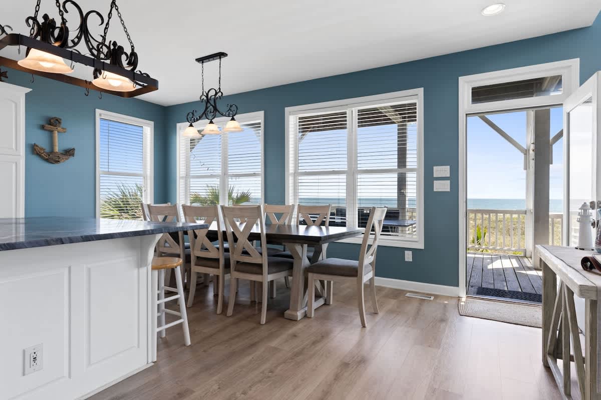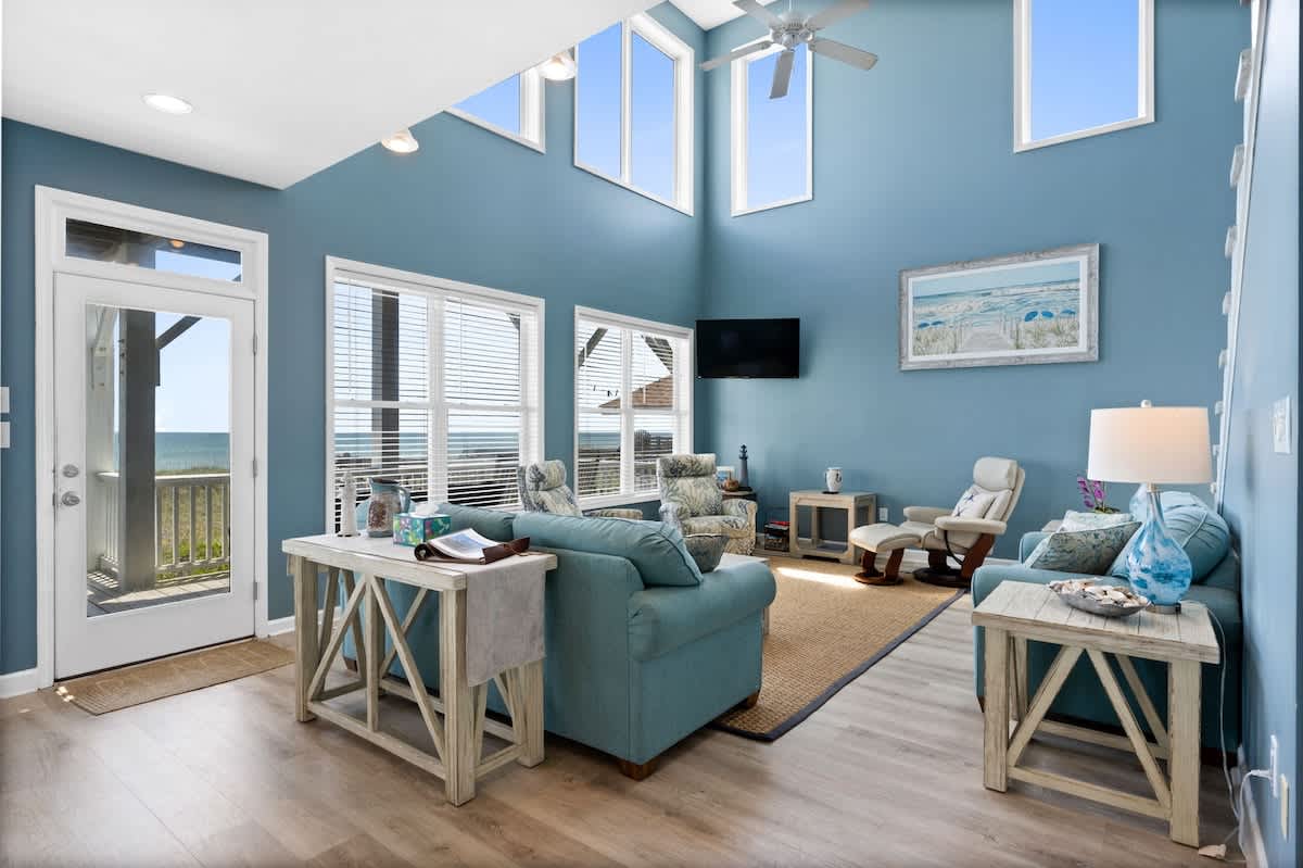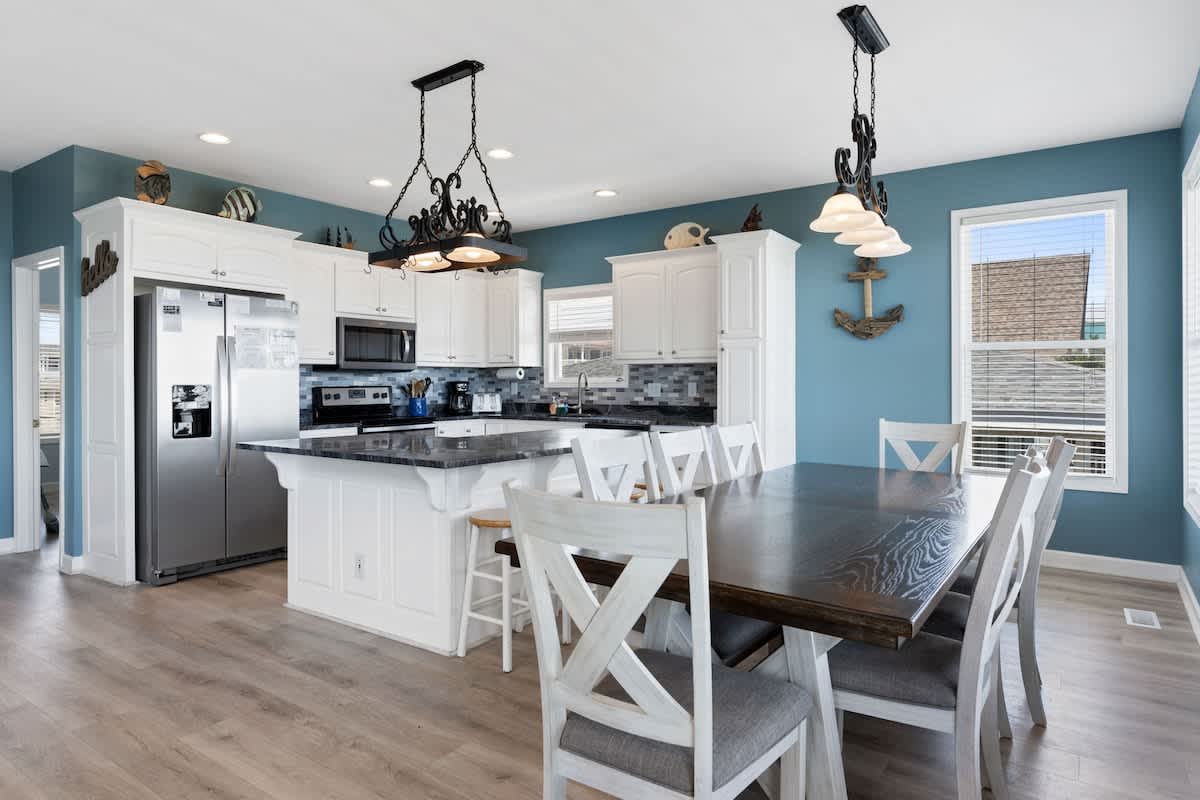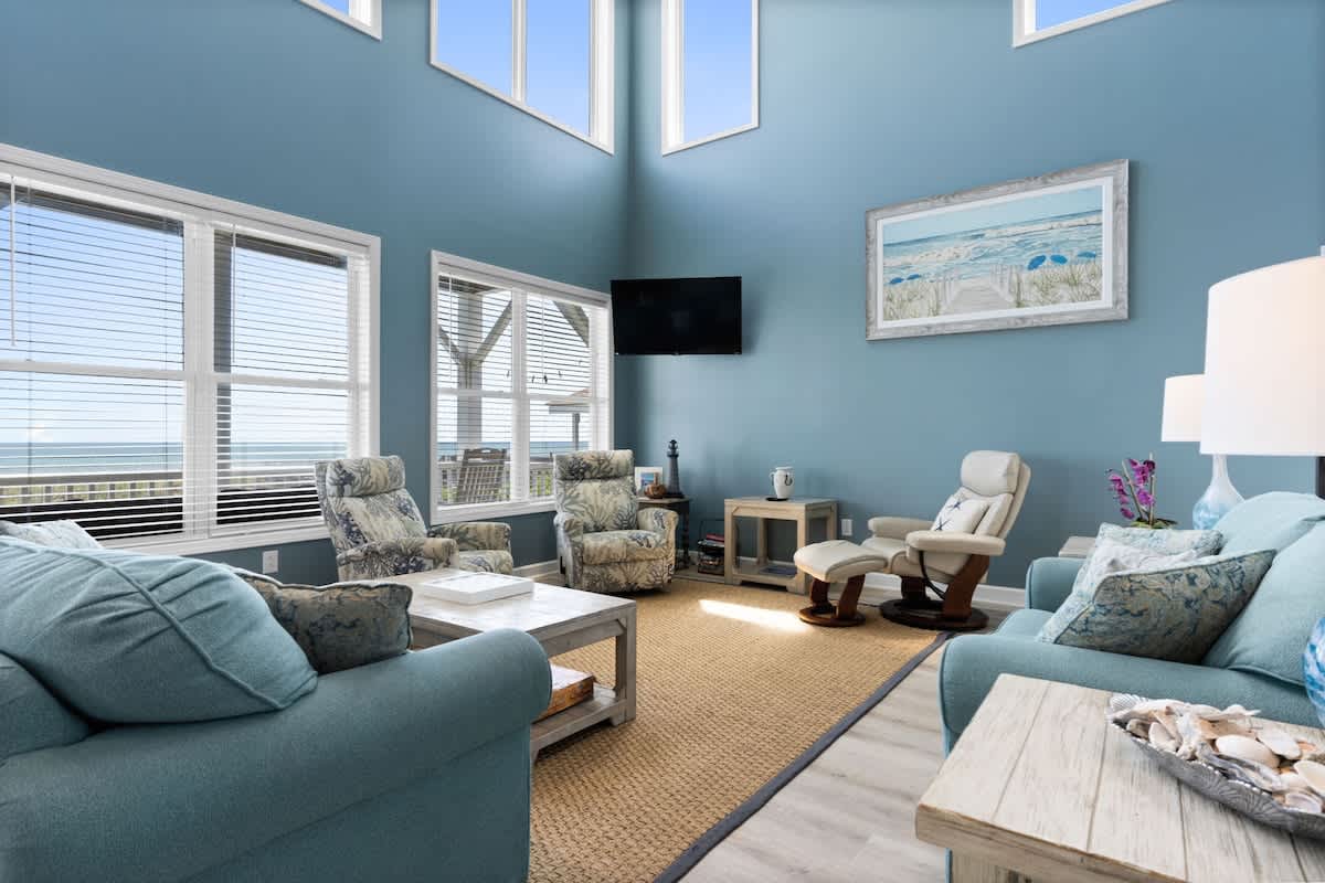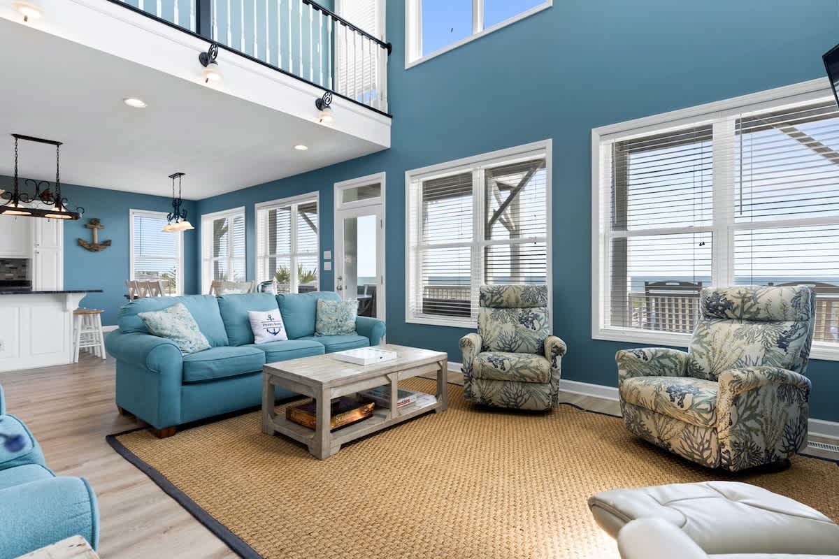 The main level features an open floor plan with the kitchen, living room, and dining room offering lots of windows to let in an abundance of natural light and breathtaking views of the ocean. The newly fully stocked kitchen features stainless steel appliances, a large center island with additional seating and new countertops and lighting. The kitchen amenities include a blender, drip coffee maker, toaster, and mixer. Also on this level are two bedrooms furnished with two queen beds in one and two full beds in the other.