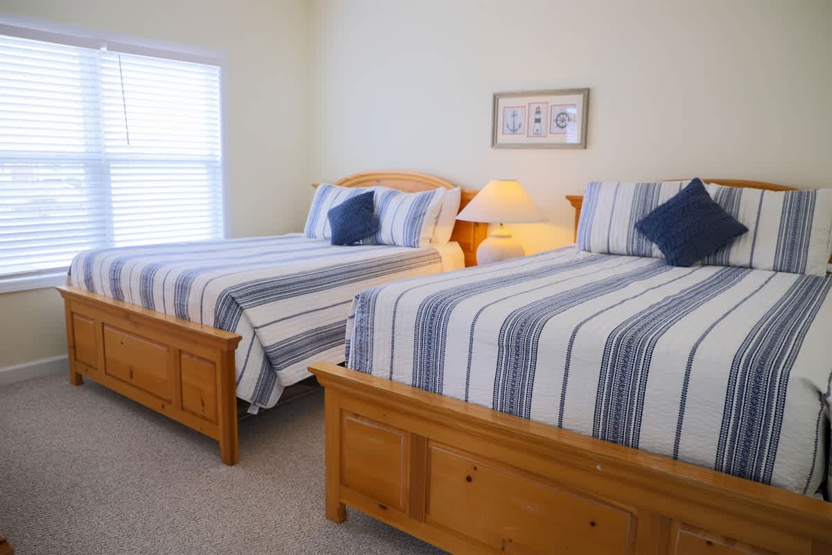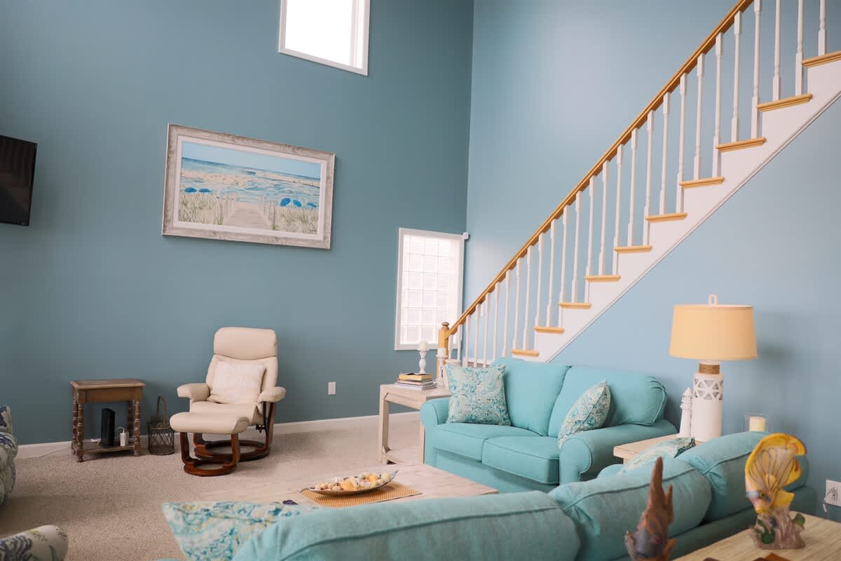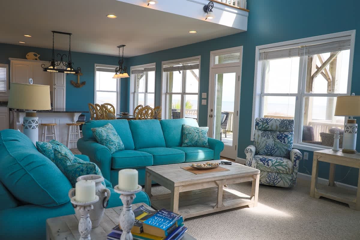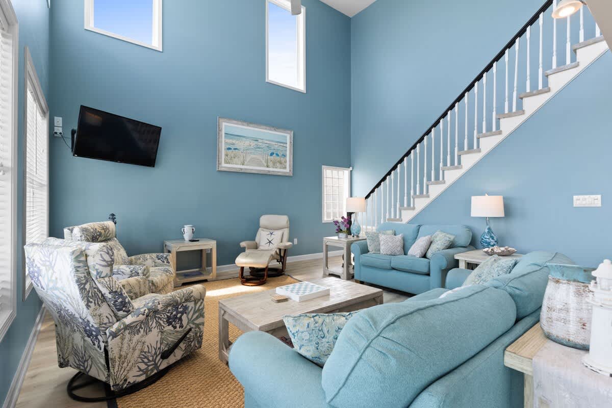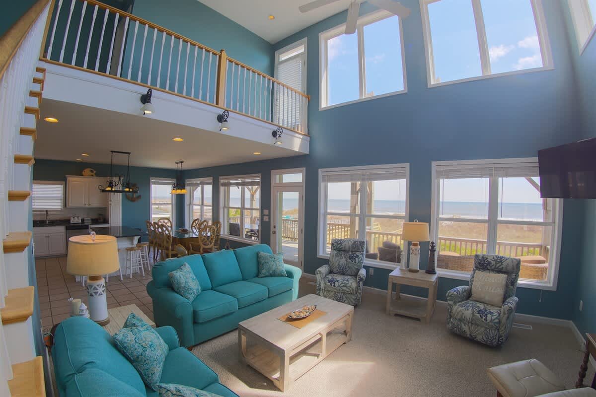 The main level features an open floor plan with the kitchen, living room, and dining room offering lots of windows to let in an abundance of natural light and breathtaking views of the ocean. The newly fully stocked kitchen features stainless steel appliances, a large center island with additional seating and new countertops and lighting. The kitchen amenities include a blender, drip coffee maker, toaster, and mixer. Also on this level are two bedrooms furnished with two queen beds in one and two full beds in the other.